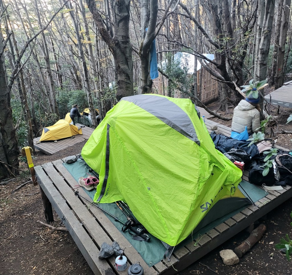 When we got back, the last part of the day’s hike was to reach Camp Frances. It was about 2 km and 30 minutes walk from Italiano and situated in the middle of the forest so all tent sites were on platforms. We were pretty exhausted since we hiked 33 km in total, so it didn’t help that the toilets were half a kilometer away and all uphill on the way back. We cooked dinner, got a shower, and Clare was saying the whole day that we definitely deserve the wine at the end of the day but tiredness got the better of us and we had one small cup each and were in bed around 10 pm. No mice came this time. All our food was hanging on a tree above us since they didn’t have lockers. We liked this campsite the least in the park since the communal cooking space was tiny and the facilities were far and hard to access at night.