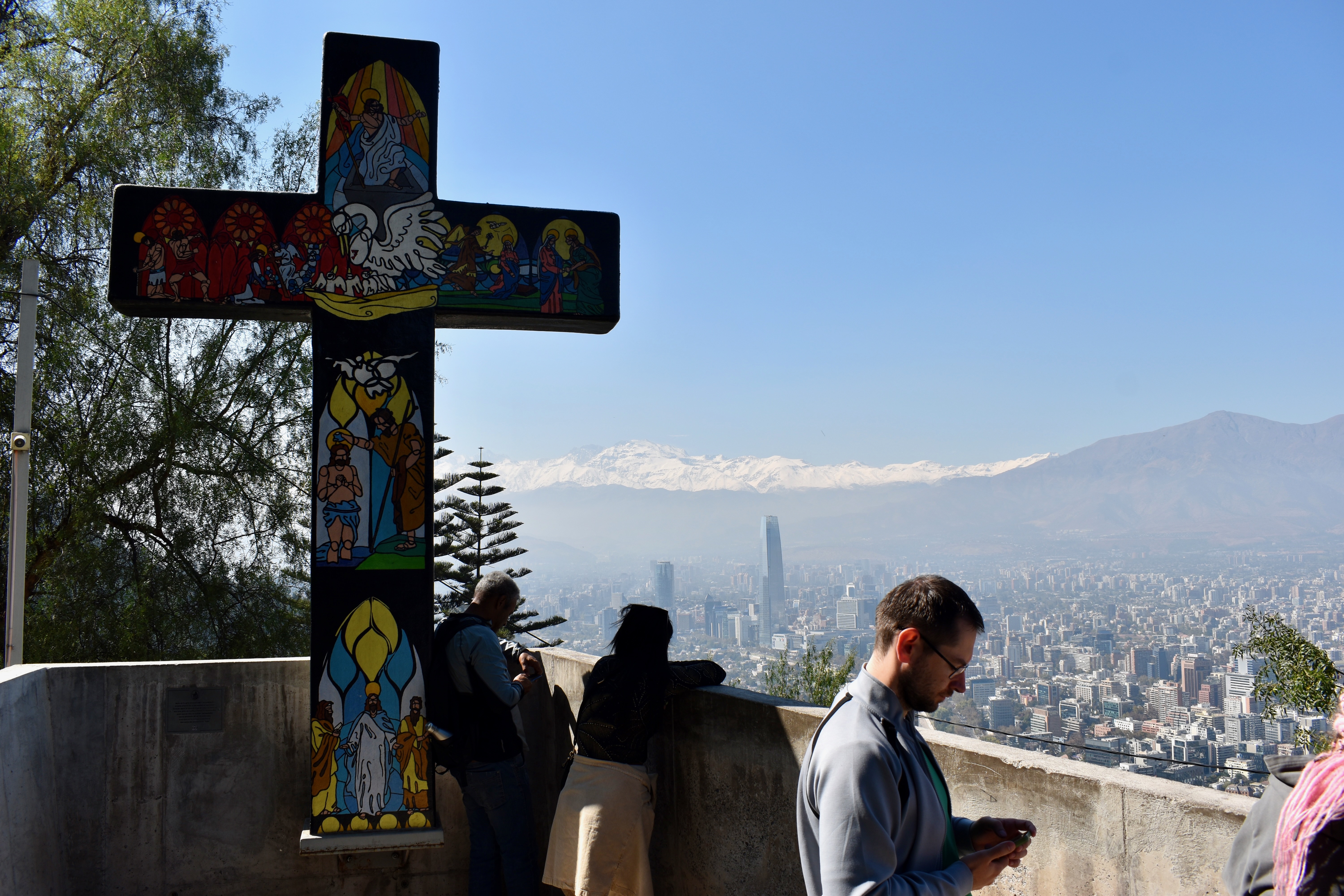 We continued up the Cerro San Christóbal towards the statue of the Virgin Mary and a small chapel at the top. We got a nice view of the town and the mountains surrounding it and tried a local drink with barley and peach. We continued a wee bit further through the park and then went down using one of the bike trails on the east side of the hill. There we different trails, some of them really steep, but we eventually got down with some small difficulties. We headed back towards the town and stopped at a local dinner for completo (local hotdog) and salchipapa (chips topped with meat and egg). We finished our walk at the La Moneda Palace (presidential residence) and walked back to our place.