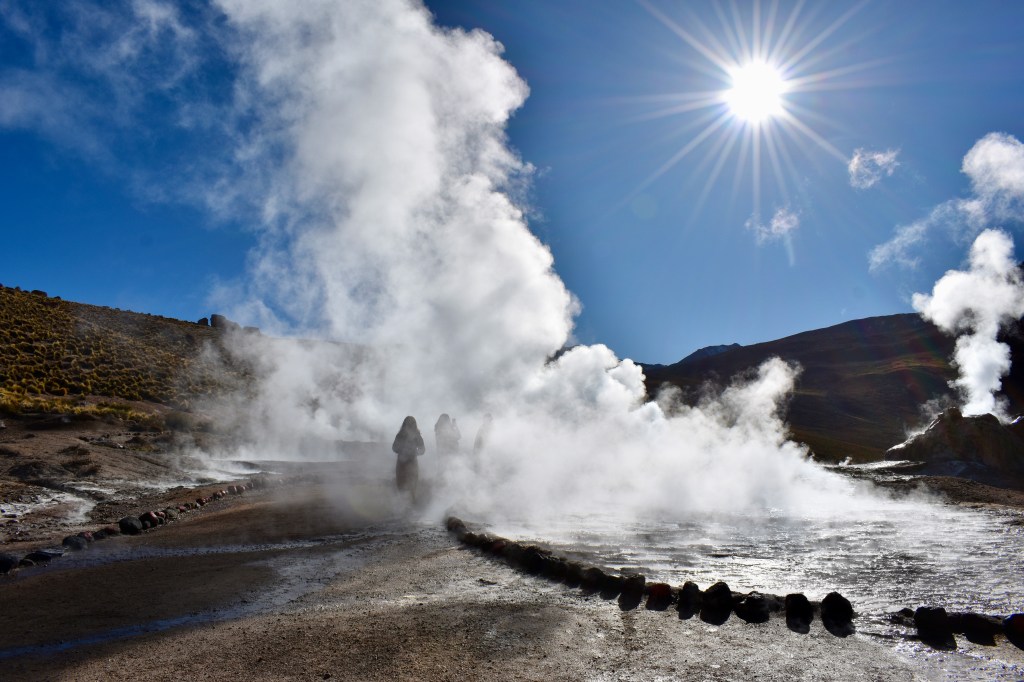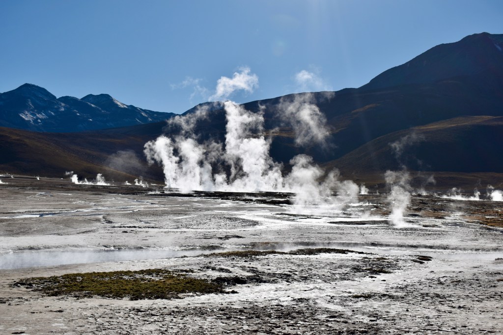 It was a very windy night but we slept well. No one came to wake us up. We set off around 7 am further north towards the Geysers El Tatio. The middle part of the road was rough but doable and the end was surprisingly nice. We saw several volcanos on our way and when we arrived at our location we were at 4,200 meters above sea level. The entrance fee was 30,000 Chilian pesos for 2 adults (it was possible to pay by card here).