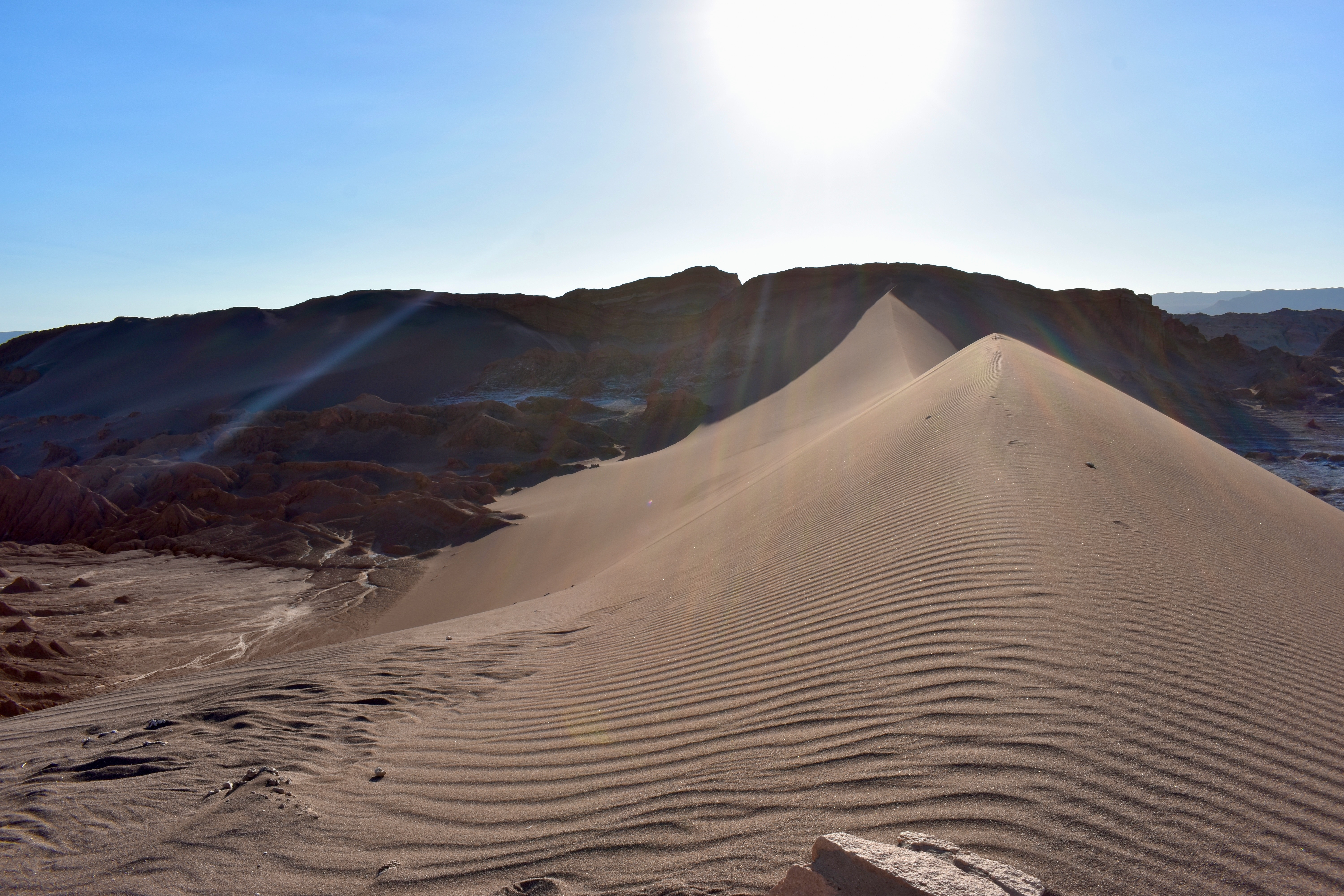 We drove from Calama southwest, but before we reached the entrance to the Atacama desert, the town of San Pedro de Atacama, we took a small detour to see Yerbas Buenas Petroglyphs. It is an area of two rock formations that are covered in paintings of animals carved into the stone that were done about 10,000 years ago (or by some kids a few years ago…). Already there we could feel the change in altitude because until now, even during hiking, we were pretty close to the sea level, but the Petroglyphs were over 3,000 meters above the sea level. We then continued on a dirty path and through a river to the Valle del Arcoiris (Rainbow Valley). We were there close to the sunset and the colors of the rocks were beautiful. There isn’t much to walk to but the rock shapes are so much different compared to what we have seen so far.