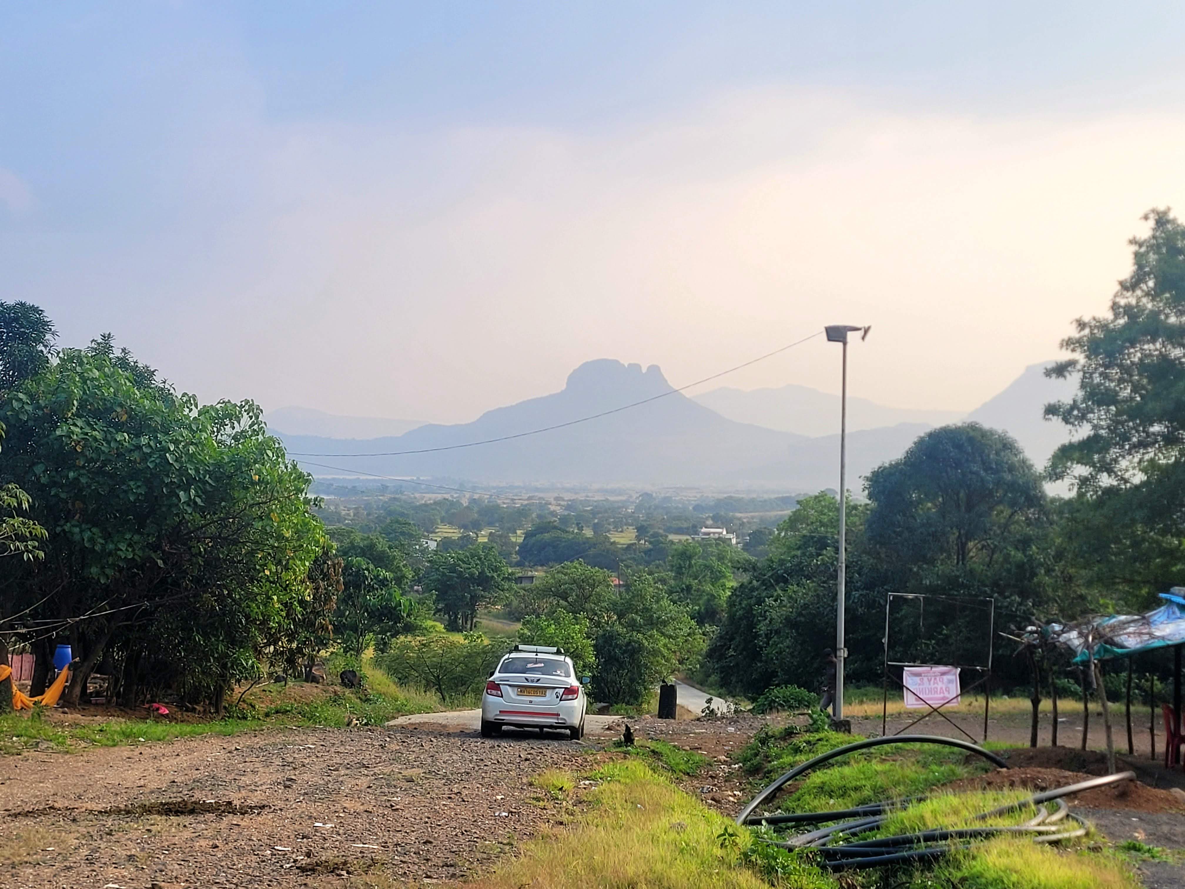 After we got back on the road, we noticed that Ram was still looking for petrol stations because he actually couldn’t get gas before. We then hit a lot of traffic on one of the hills and turned away from the main road towards the Harihar Fort. Here it started to get worrisome because the car startled a few times and I saw on Mapy that there were no petrol stations nearby and we didn’t even know if he could use petrol and definitely there wouldn’t be any CNG around. In the end, he got 2 plastic bottles with petrol from a local villager and we were able to make it all the way to the Fort. Compared to the main highway and the city, this part of the country seemed so peaceful.