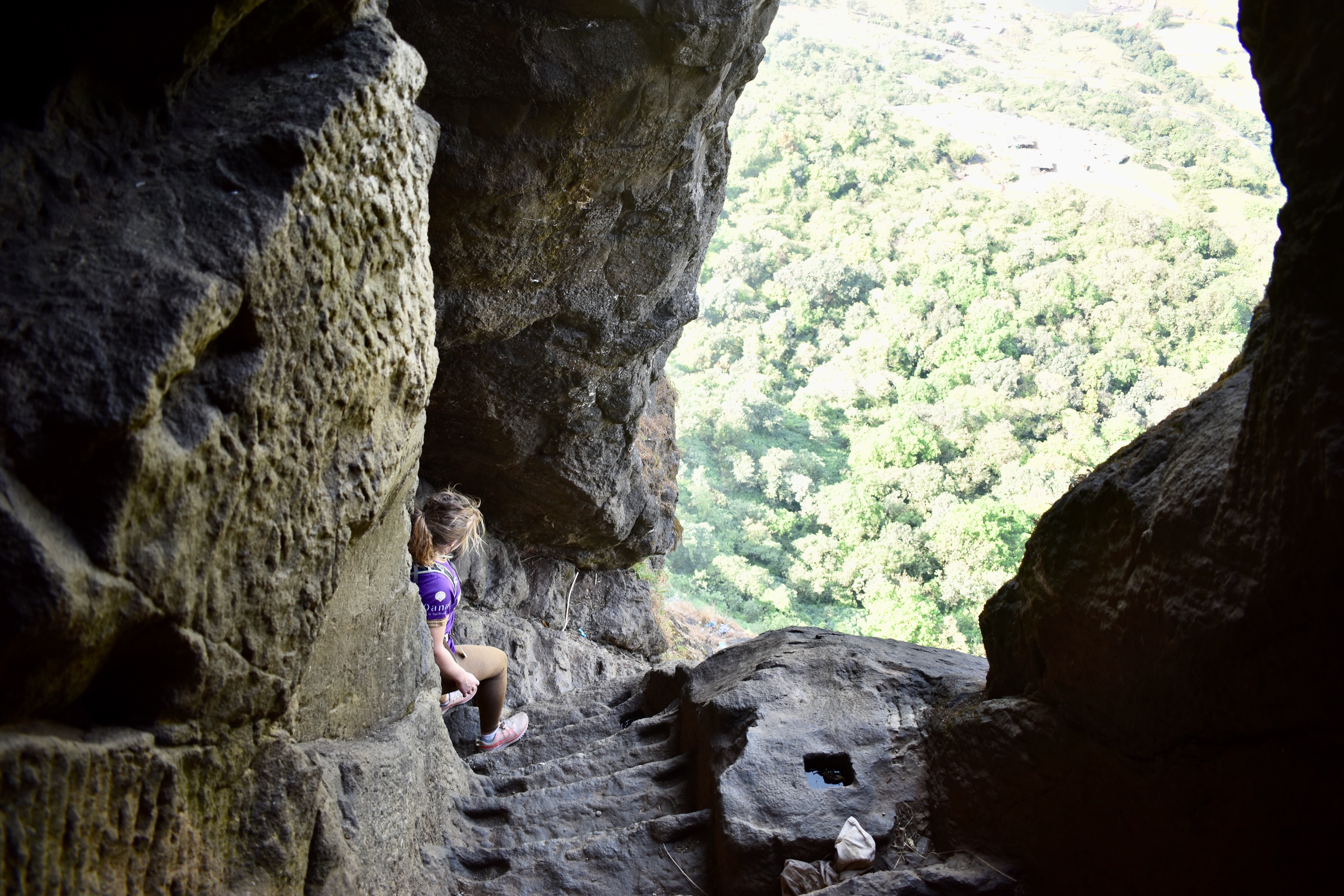 The bottom of the Fort is what makes it so special. To get inside you have to climb about 30 meters of nearly vertical stairs carved into the mountain. We took our time and first had to wait for a group of people to come down. Once you get up the stairs there are more going through a small cave and finishing at the top of the mountain. From there it’s then just a few hundred meters to the highest point of the Harihar Fort. To reach the top some small rock-climbing is required. On the way, you will pass a few sellers and a temple.