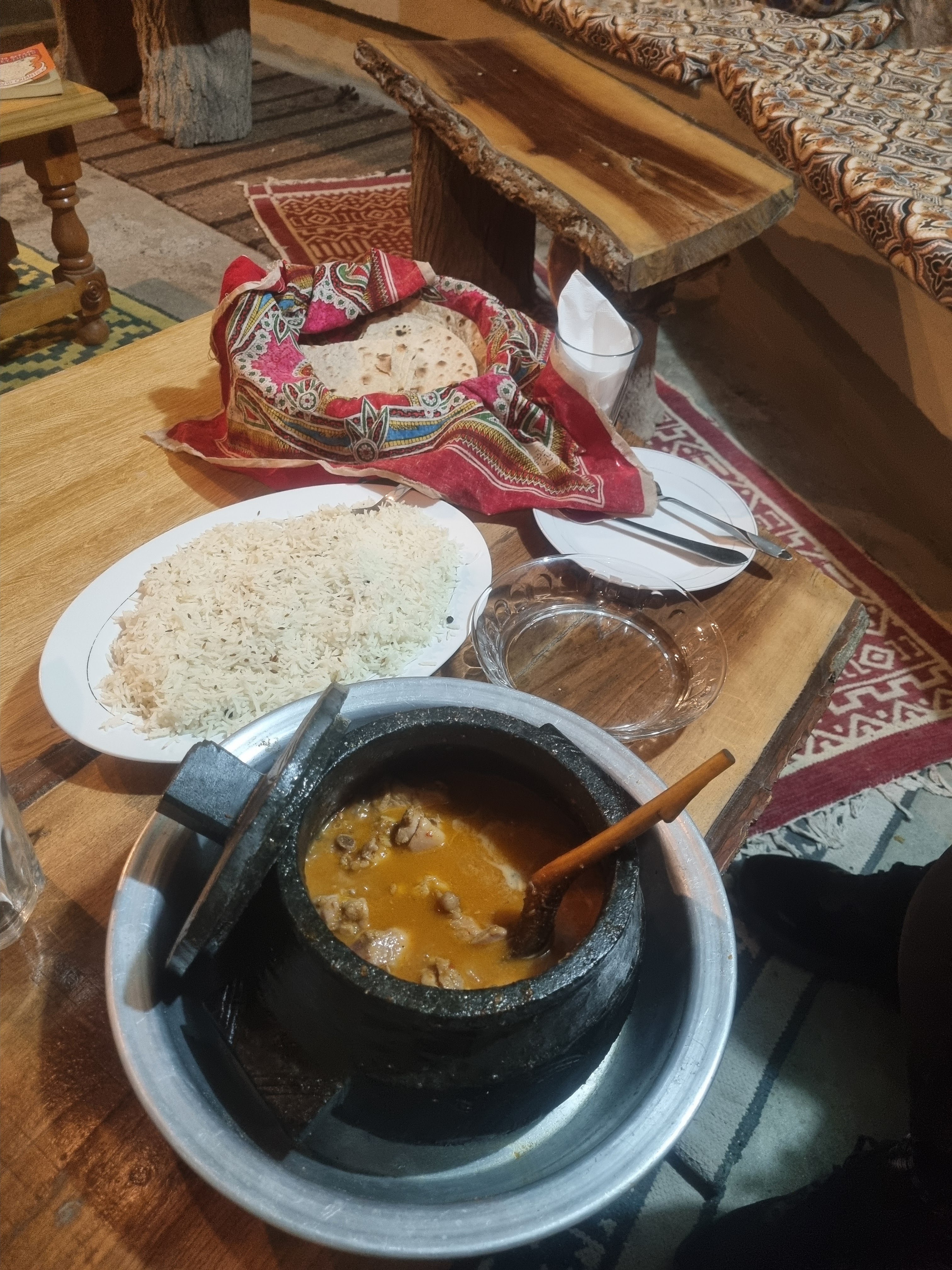 We checked into the Manokur-e-Basa Hotel. The staff greeted us with tea, and we immediately ordered dinner since we hadn’t eaten all day. We had Beef Gorlon (a meat curry cooked in a stone pot), rice, and chapati—all for 3000 rupees. It was delicious, and we ate every bit of it. After dinner, we showered and packed for tomorrow’s hike.