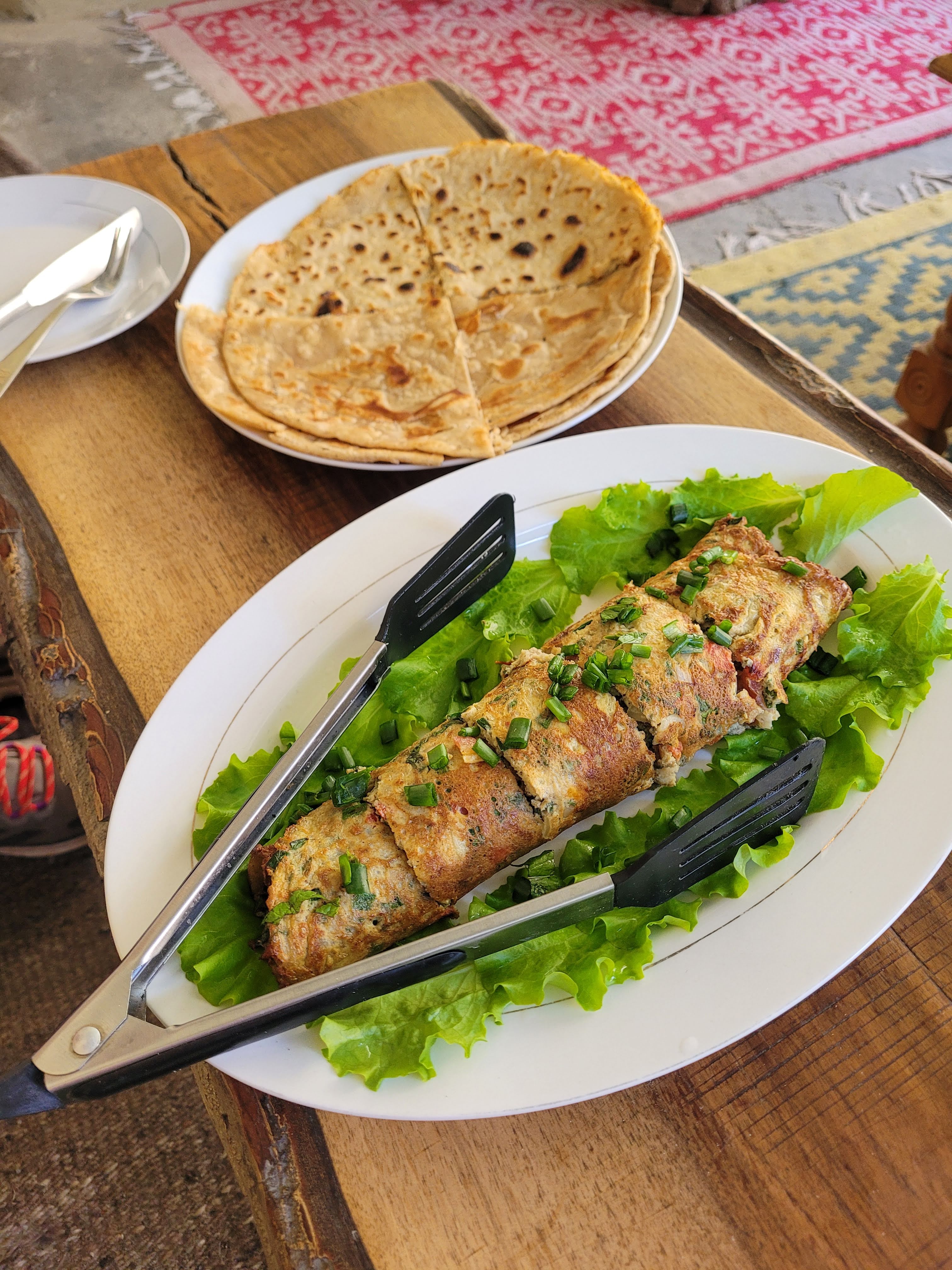 We packed our day packs, and before we left, we enjoyed what was probably the best included breakfast — a veggie omelet, paratha, homemade shortbread, watermelon, and tea.