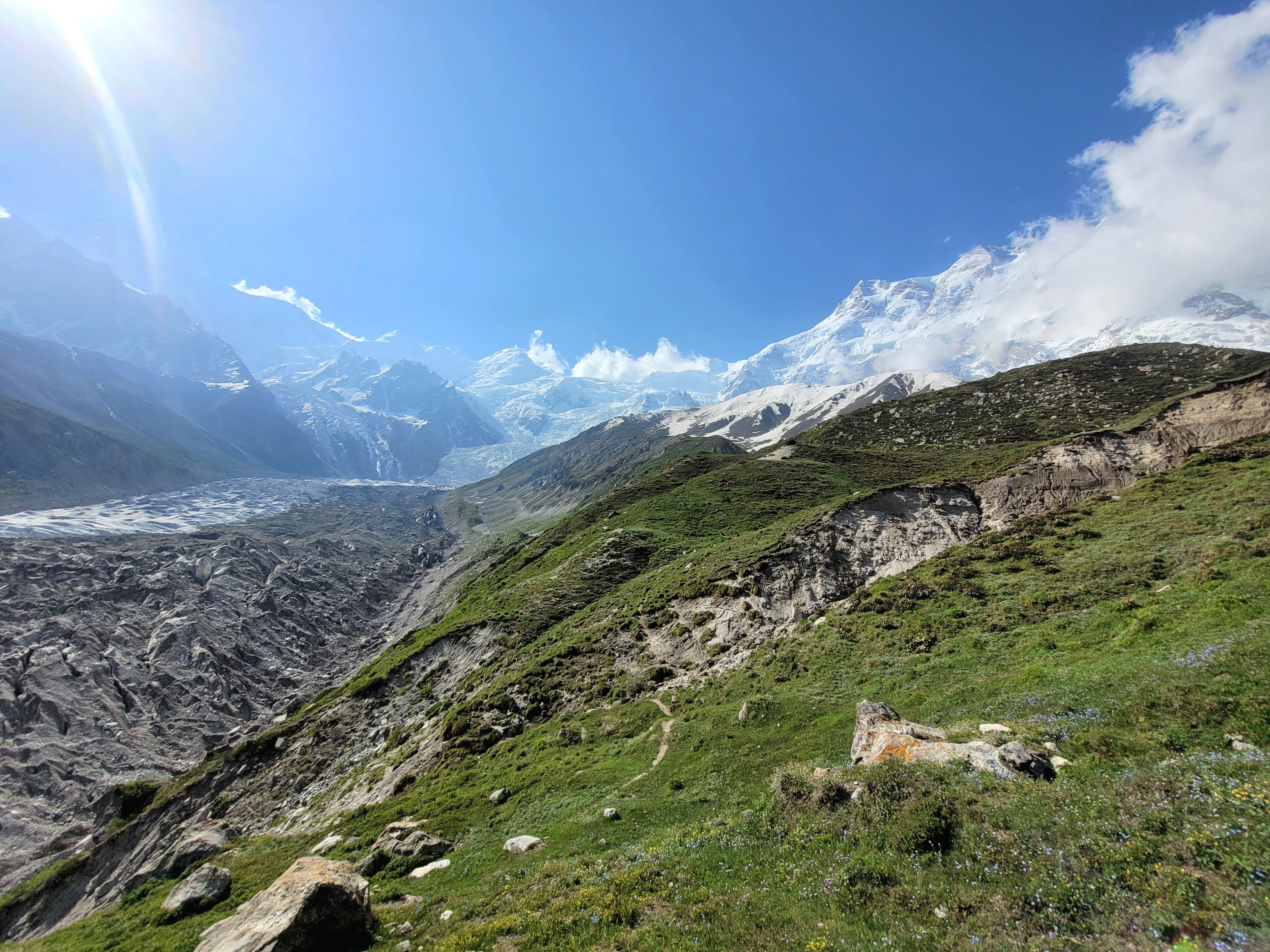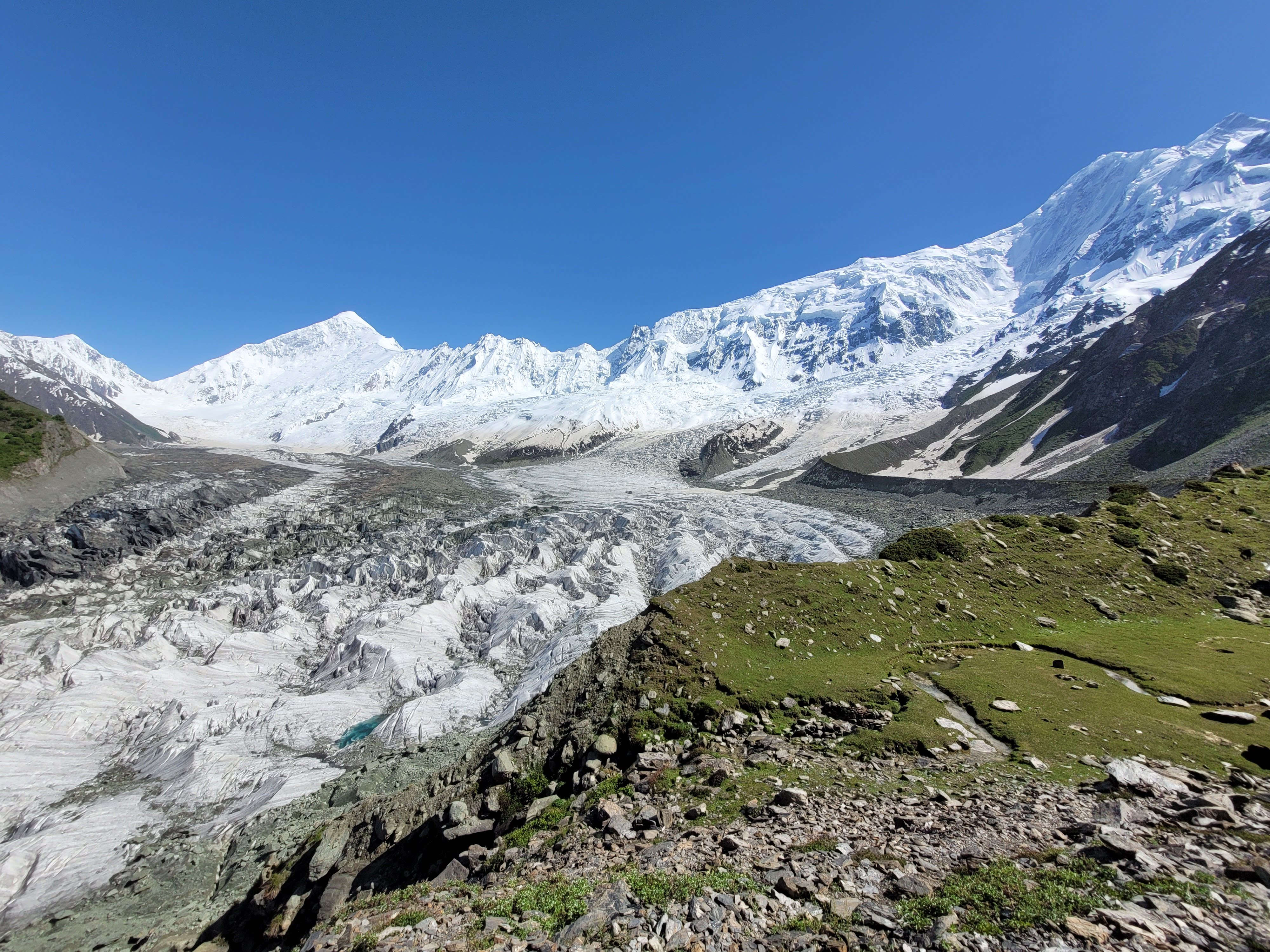 It took us 2 hours to reach the glacier viewpoint, and the Rakaposhi Base Camp was just about 5 minutes further. We stopped there for a coffee and then set off to find water. A stream ran through the camp, but it was pretty dirty, so we had to walk the length of the valley (about 0.5 km) to find the source — meltwater emerging from under the snow. Since we were already there, we climbed the ridge on the other side of the valley to get another view of the glacier.