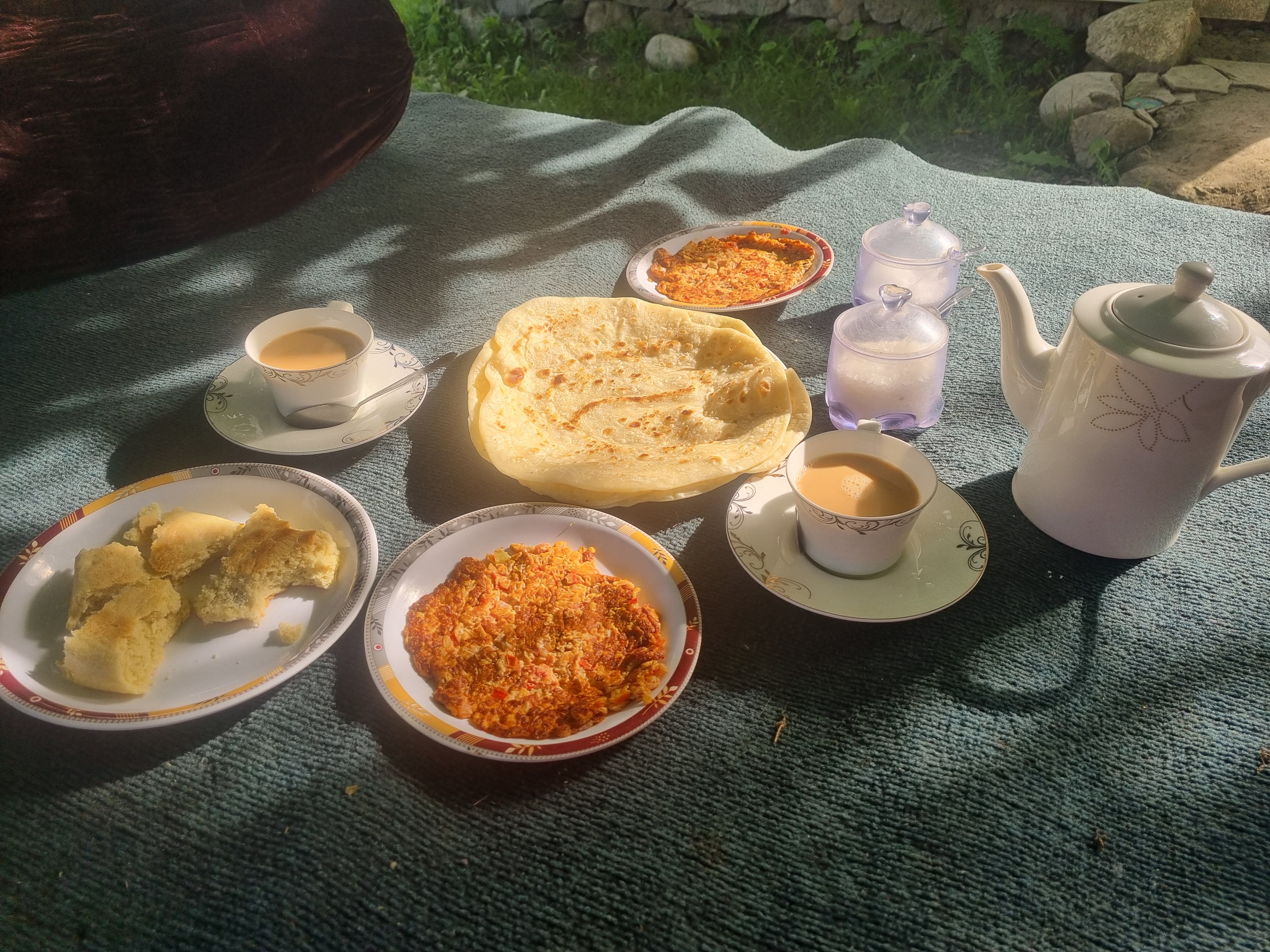 We were ready for a cold night, but it turned out to be quite warm. A T-shirt and jacket were more than enough. We were up at 6 am and slowly started packing the tent and everything away. We asked for some hot water for our coffee, and they brought us breakfast around 8 am — an egg each and two paratha breads.
