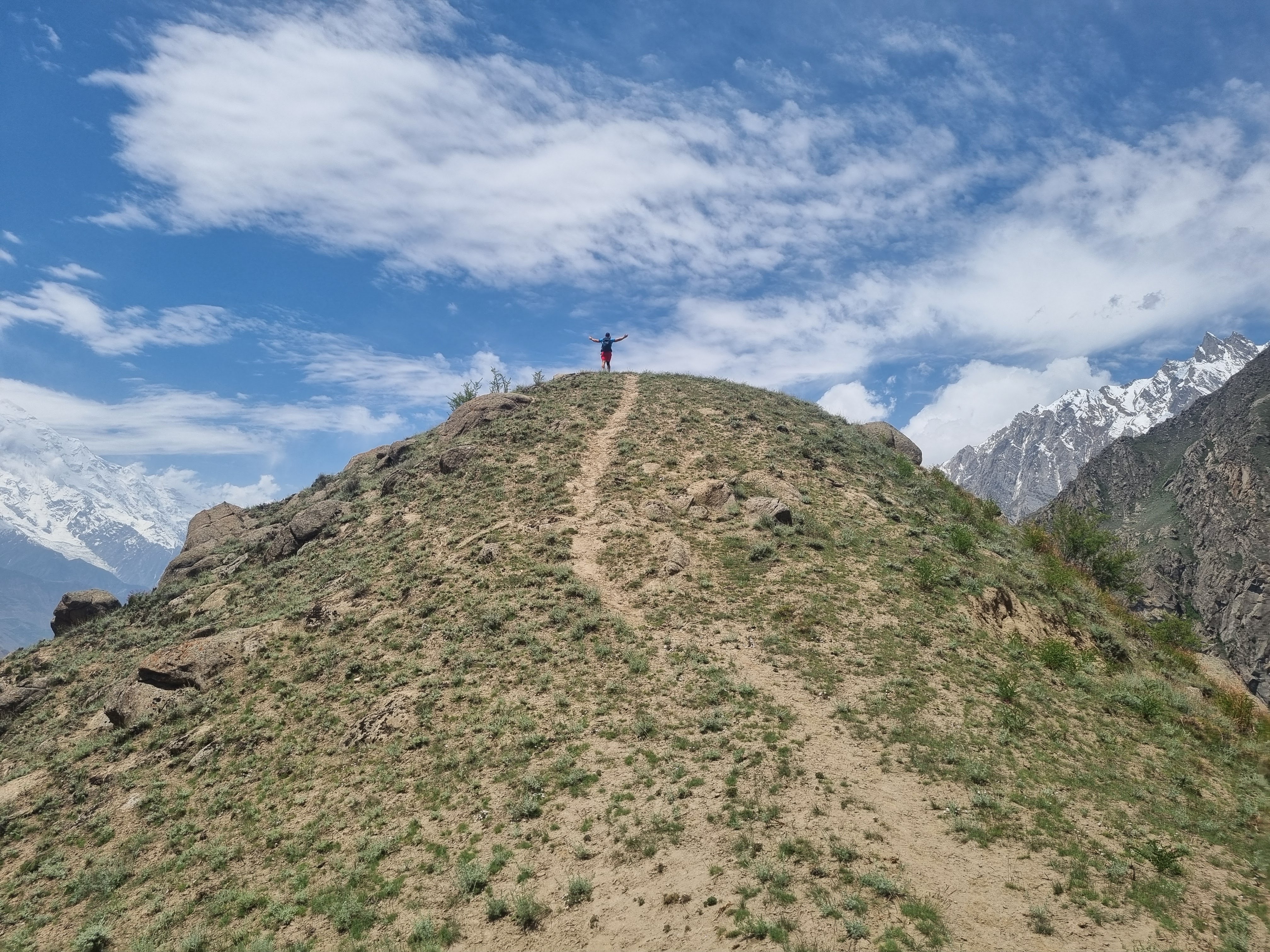The view from the ridge was absolutely mesmerizing! We were welcomed by a massive glacier in the valley, with the towering 7,788-meter Rakaposhi on the right. It got really windy up there, so we put our jackets on and spent a few minutes just soaking it all in.