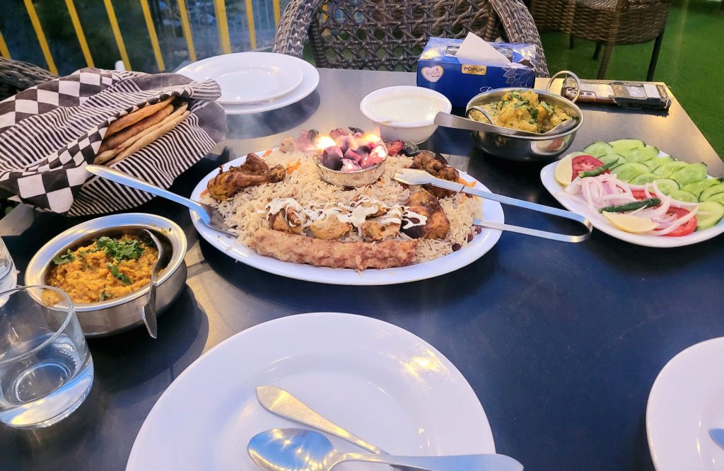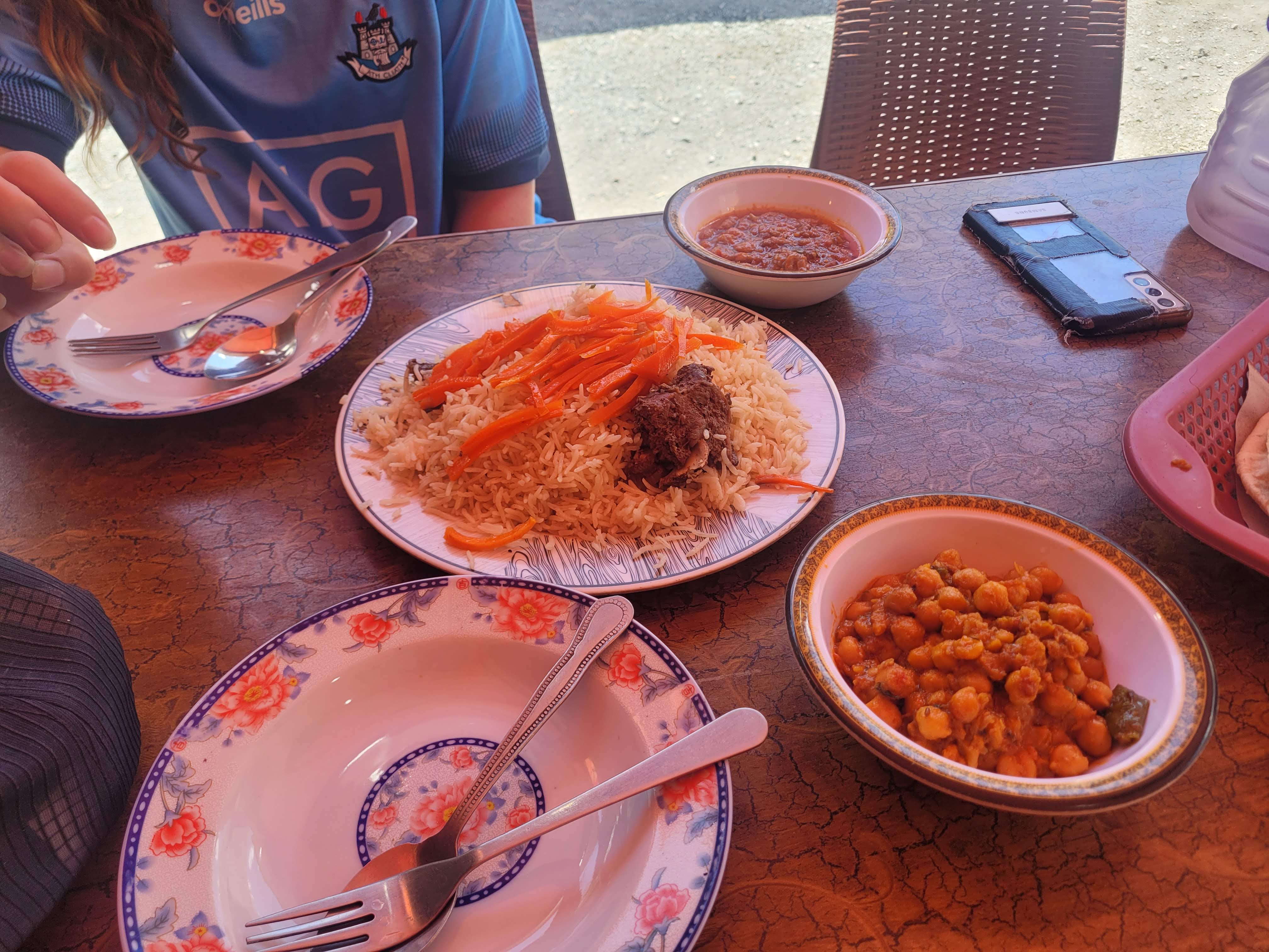 The area was busy with cars—this route is a shortcut to Islamabad and a popular holiday spot—but also visibly poor. Kids were selling things, washing cars by the roadside, and so on. We had chicken biryani, chicken karahi, dal, and some bread before getting back on the road.