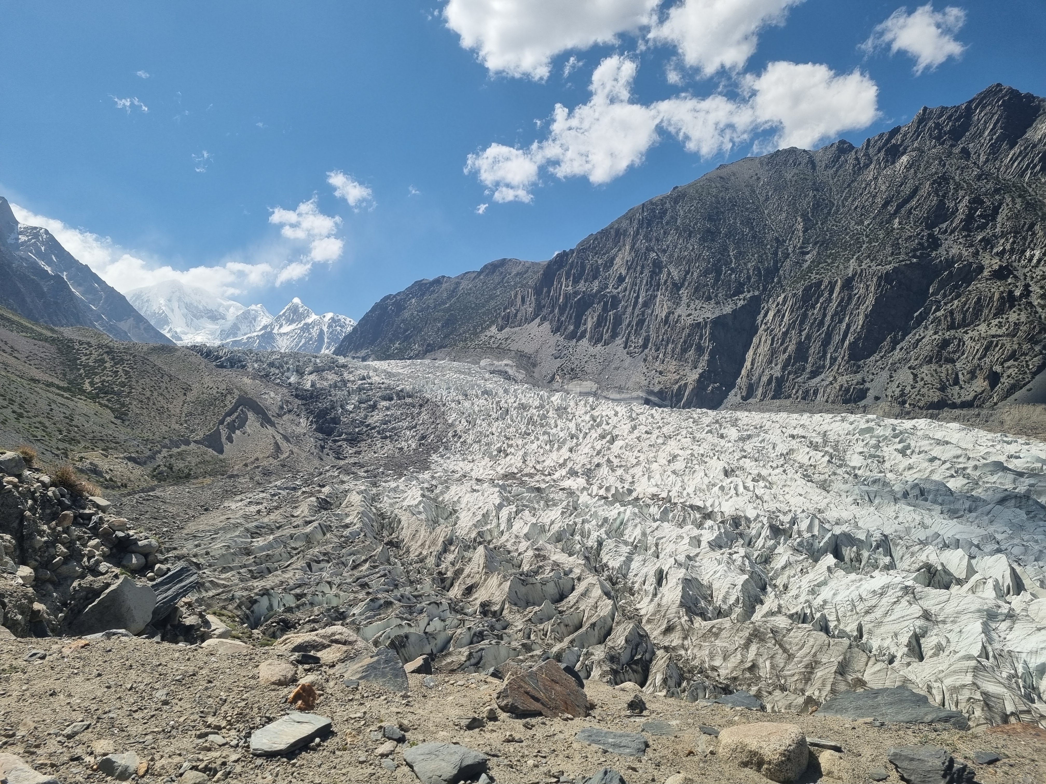 On our Rakaposhi hike, we met a Pakistani guy who told us Borit Lake was “boring.” We’re not sure if he meant the lake itself or the hike to Passu Glacier from there, because the hike was anything but boring. It may not have been the best, but it started with stairs built into a cliffside overlooking the glacier, followed by two steep inclines, and in between them a narrow scree traverse that had our hearts racing — it genuinely felt like one wrong step could send us 20+ meters down to the glacier’s edge. The views at the end were stunning, and we could even see where the Patundas Trek continued from there. From the hut the hike was 4.6 km long with some 650 meters of elevation gained. It took us an hour and 50 minutes there and about an hour and a half back.
