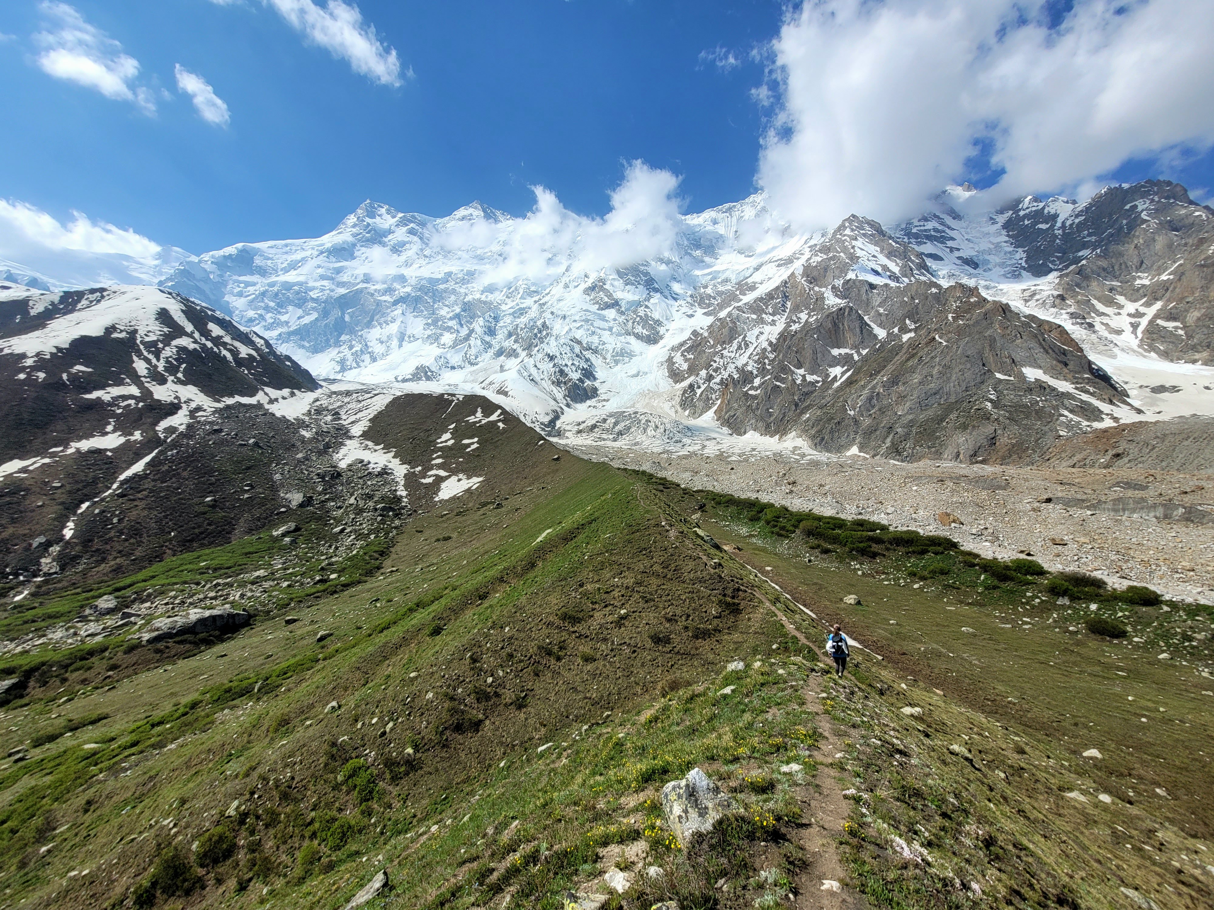 The actual Nanga Parbat Base Camp was on a wide green field just under the mountain, with some protection from a small adjacent hill. We made it in 2 hours 30 minutes, covering 8.5 km and climbing around 850 meters. We wanted to take a break and soak it all in—we were completely alone there. We decided to climb a bit higher toward the Ganalo Glacier for a better view. We went west up a ridge—there was no path, but the grass was easy to walk on, and cow and horse tracks helped. We gained another 50–100 meters of elevation and found a quiet spot to relax. The view of the glacier wasn’t that great in the end, but it didn’t matter. The weather was perfect—sunny, no wind, and it felt like the right moment to sit down, chill, and eat some oat bars.