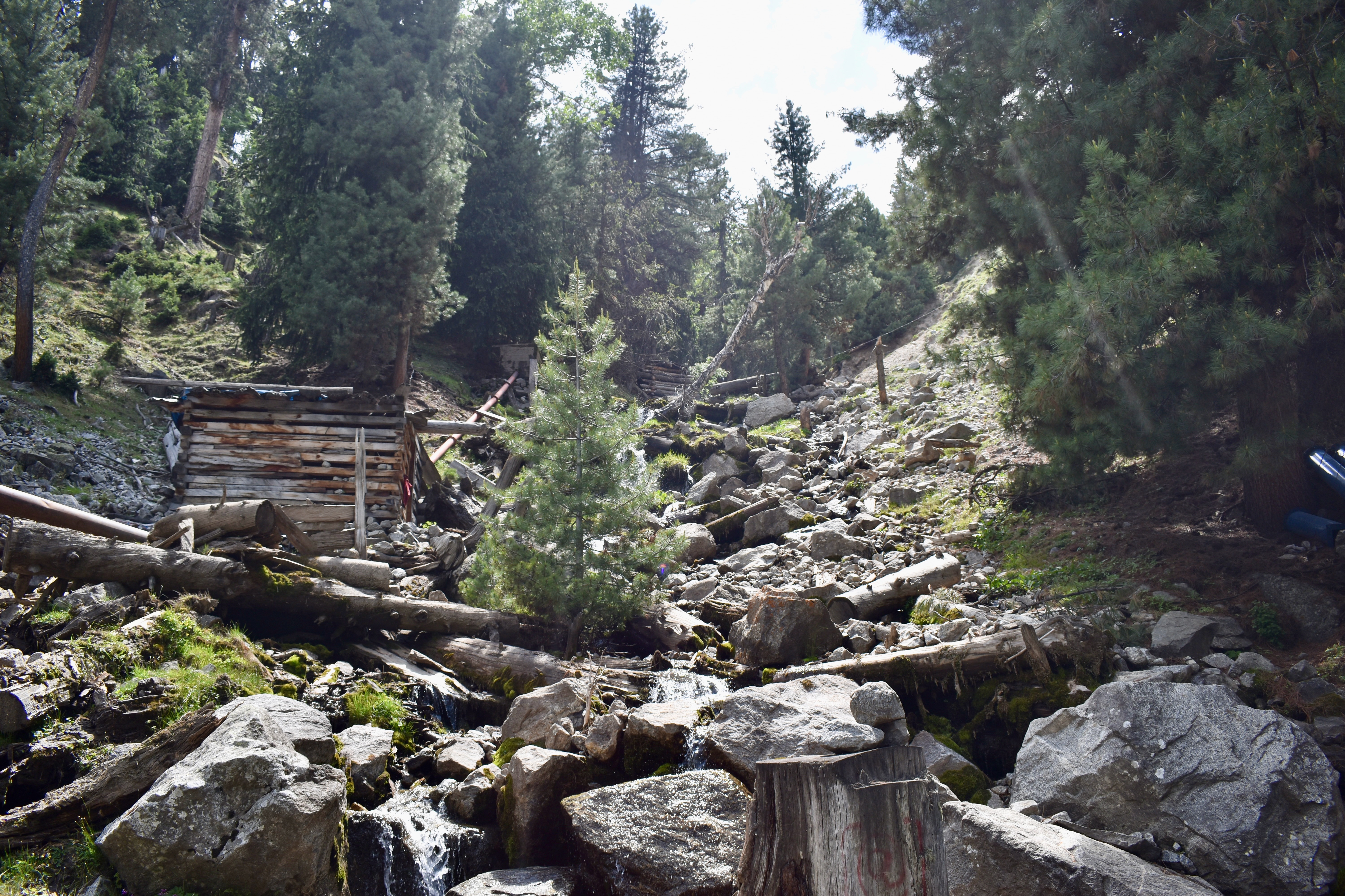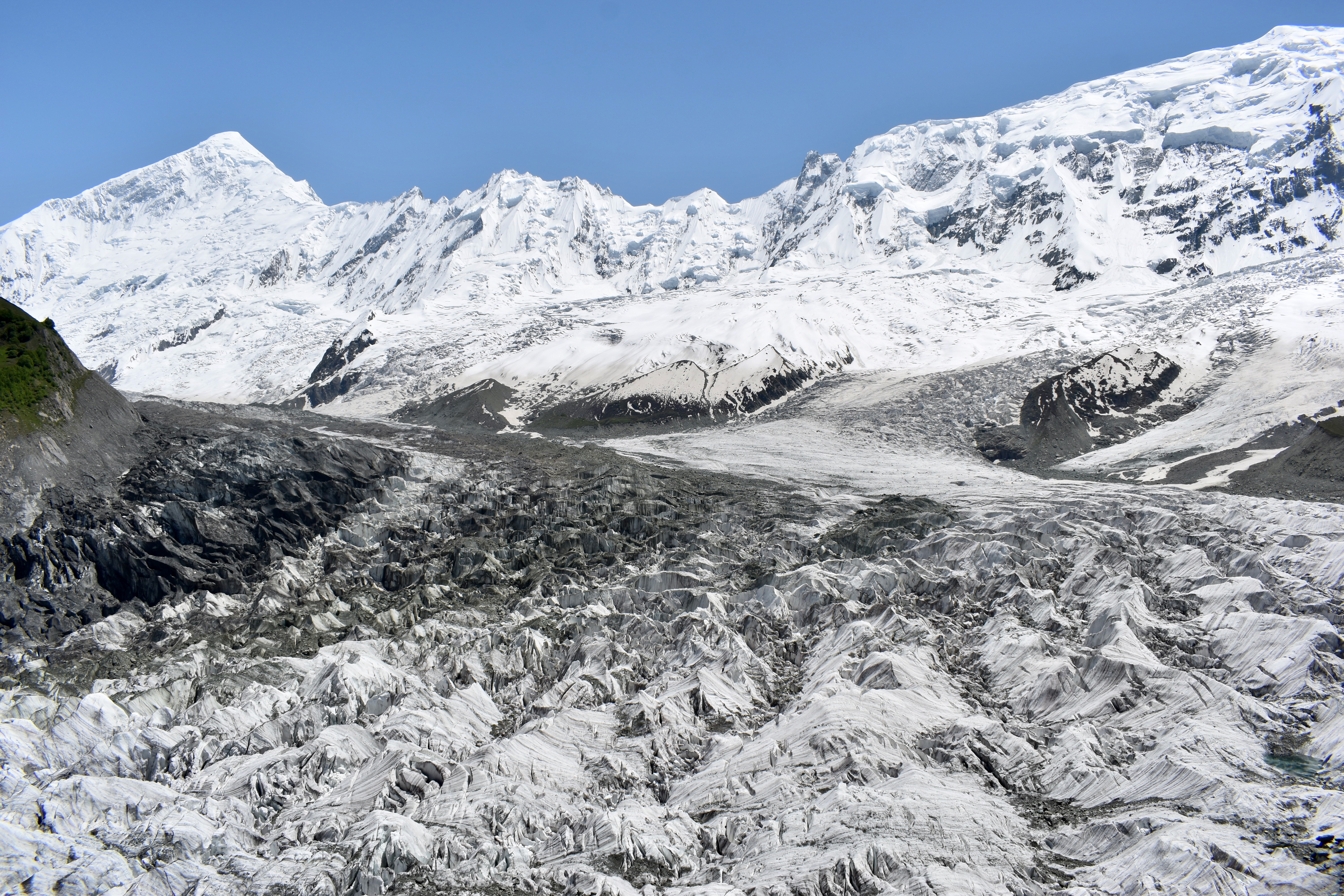 Just before we got there, we took off a layer as the sun was finally warming us and we were out of the forest. This spot was called Eagle’s Nest—yes, that name again. A hut sat beside a massive stone terrace where we got our first close look at the Rakhiot Glacier. From there, the path led us down along a loose rock scree near the receding glacier. We had to cross two rivers coming from the right, likely fed by the Ganalo Glacier.