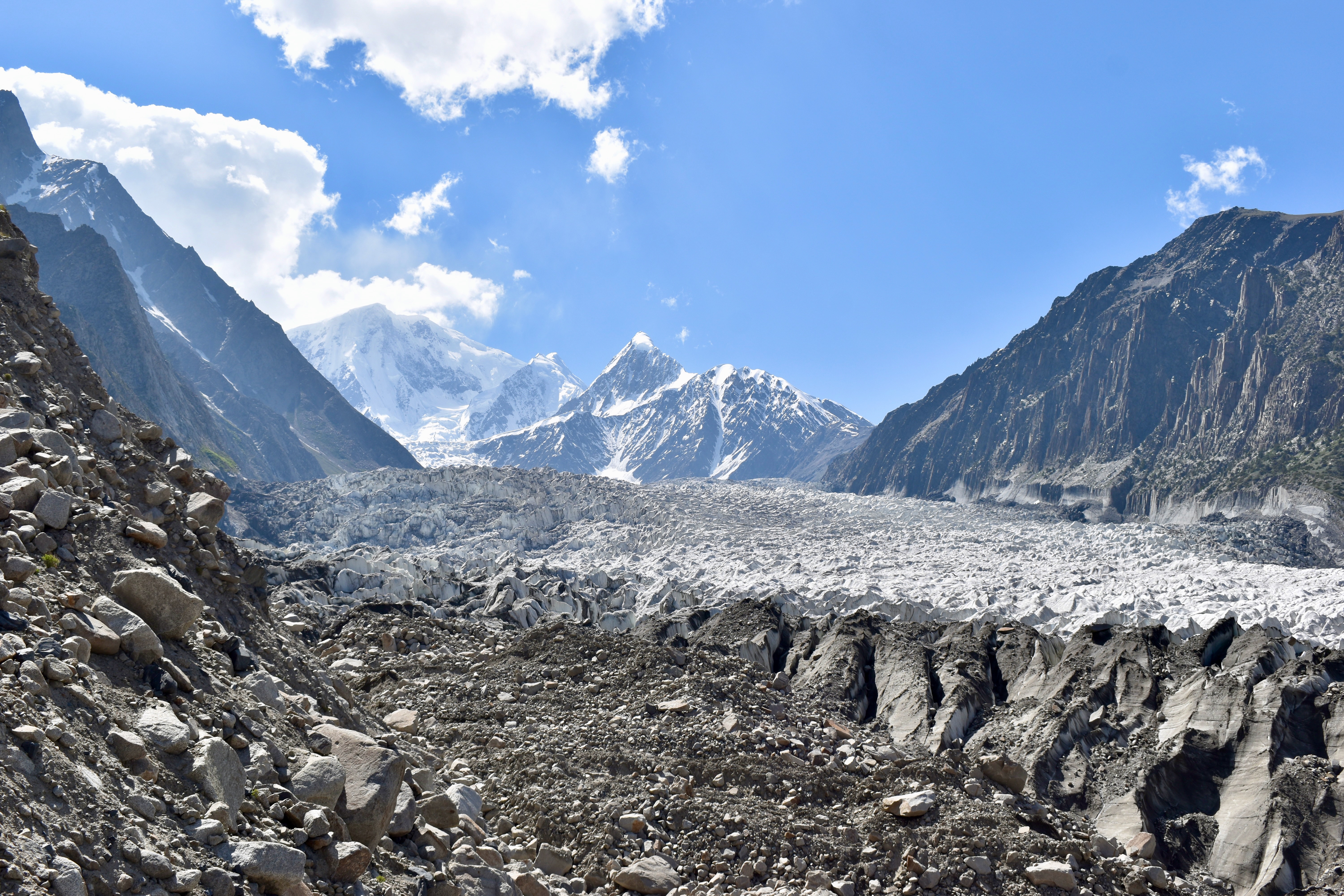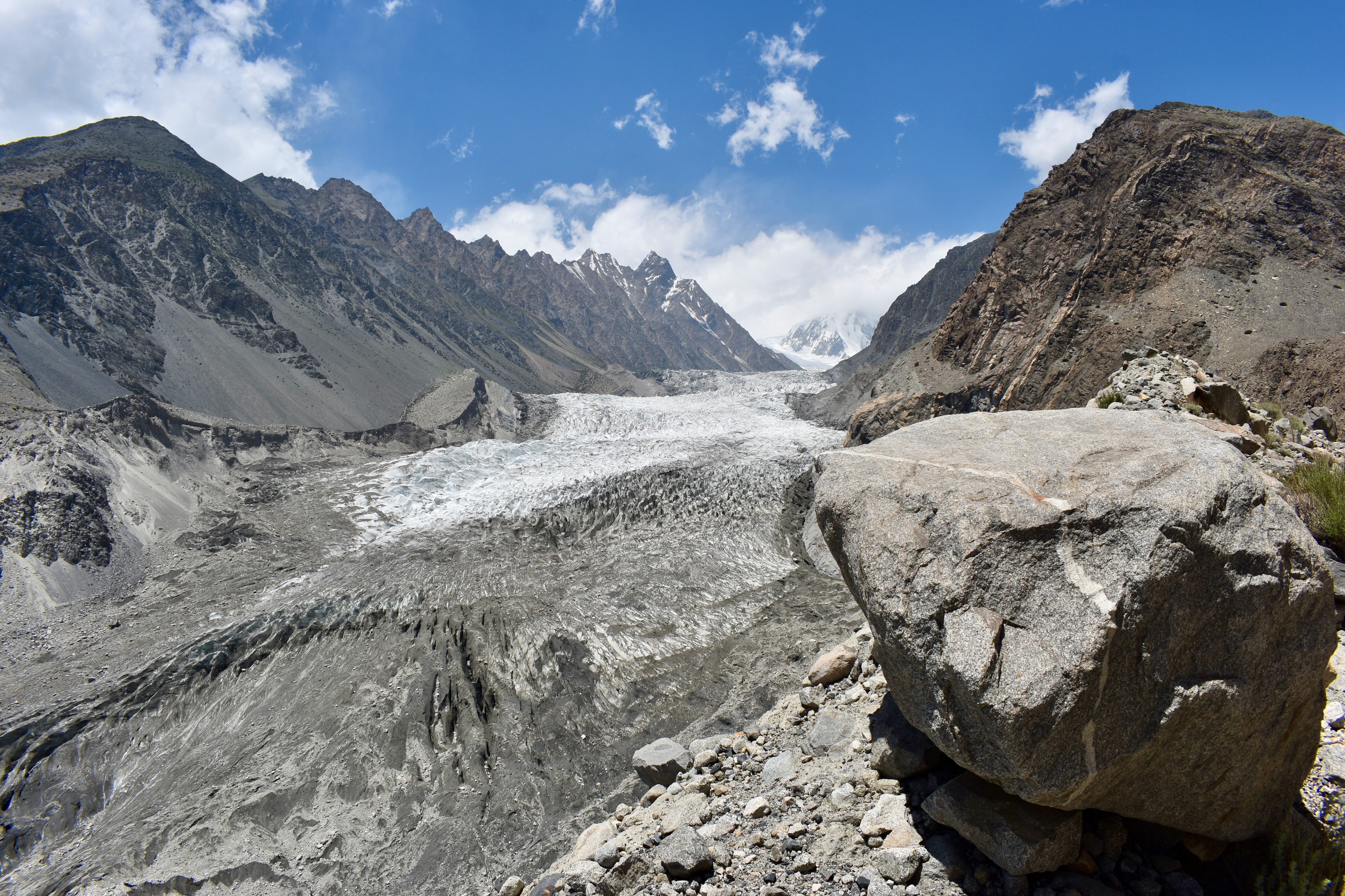 The path looked flat but was deceptively uphill—we later saw we’d gained another 150 meters in elevation. Finally, we reached the far end of the pass and got our first glimpse of the mighty Batura Glacier, the fifth-longest glacier outside the polar regions at 57 kilometers long.