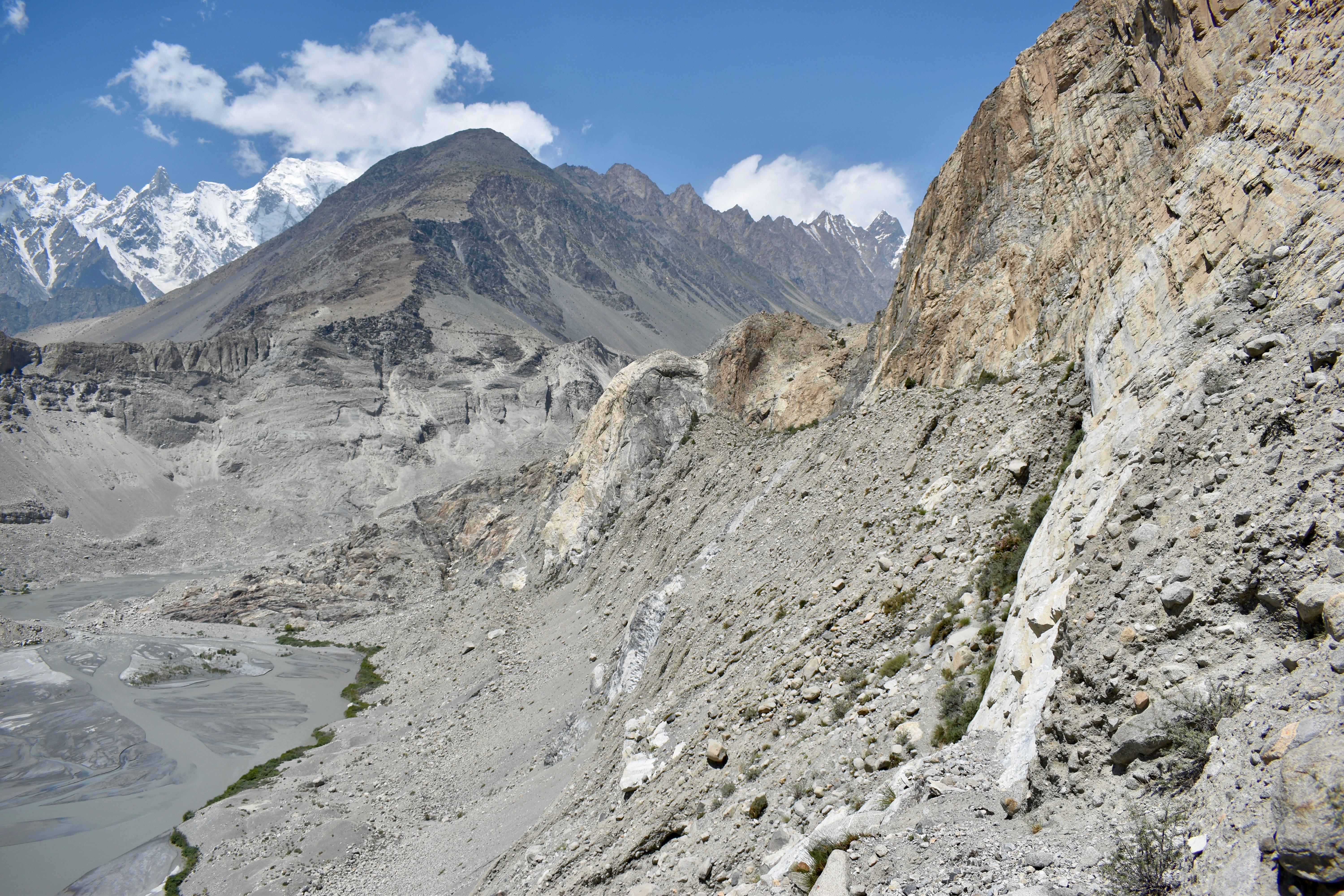 At the plateau, we noticed another set of stone cairns heading down to Passu Lake, suggesting there is an alternate route up that avoids the scary ledge walk.