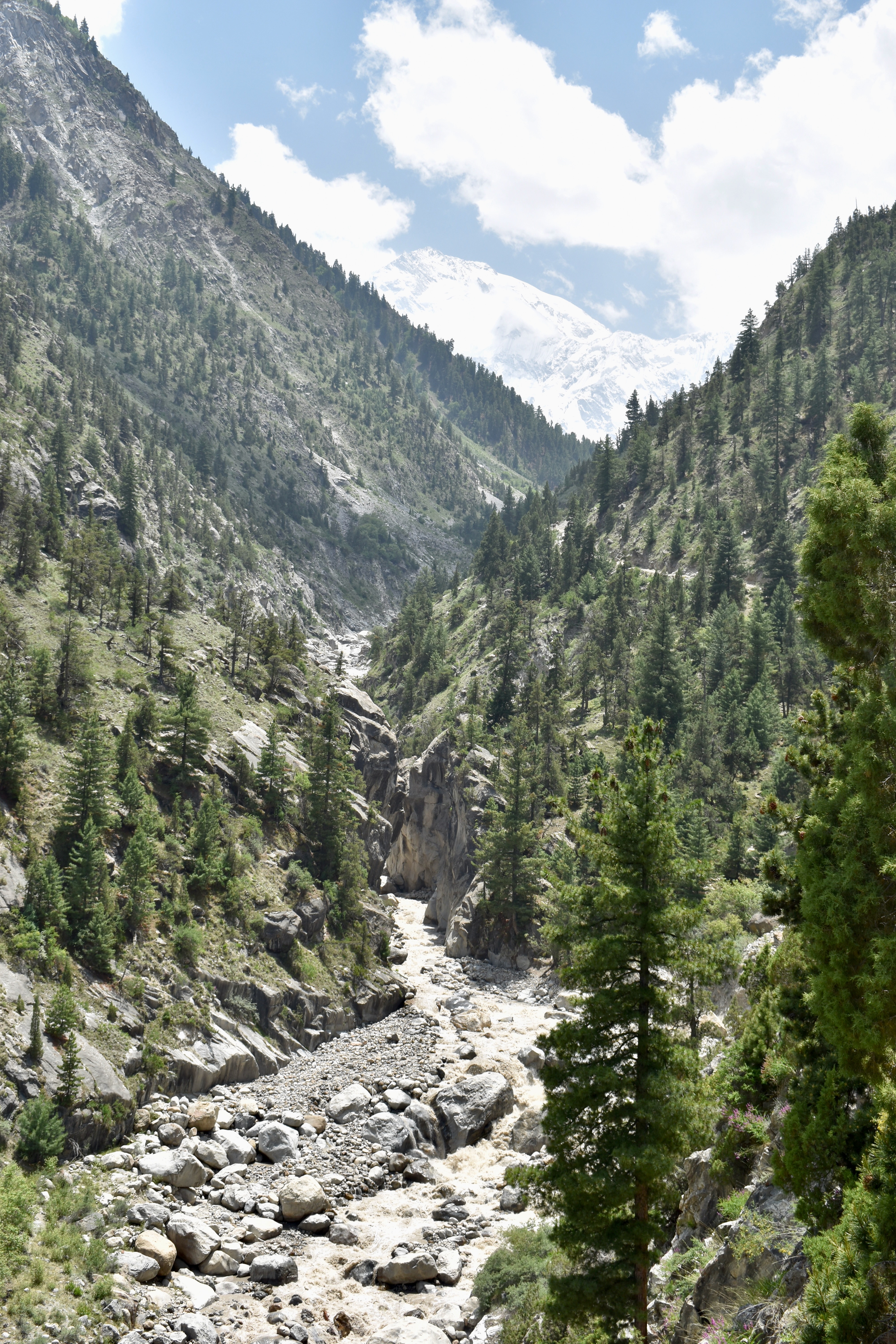 We left just after 9 am and, after about 500 meters, reached a bridge across the river where we had to pay 300 rupees each for the park fee. From there, the trail started zigzagging up pretty steeply, and we got our first view of Ultar Mountain, towering at 7,388 meters. The initial incline then flattened out as we reached the tree line.