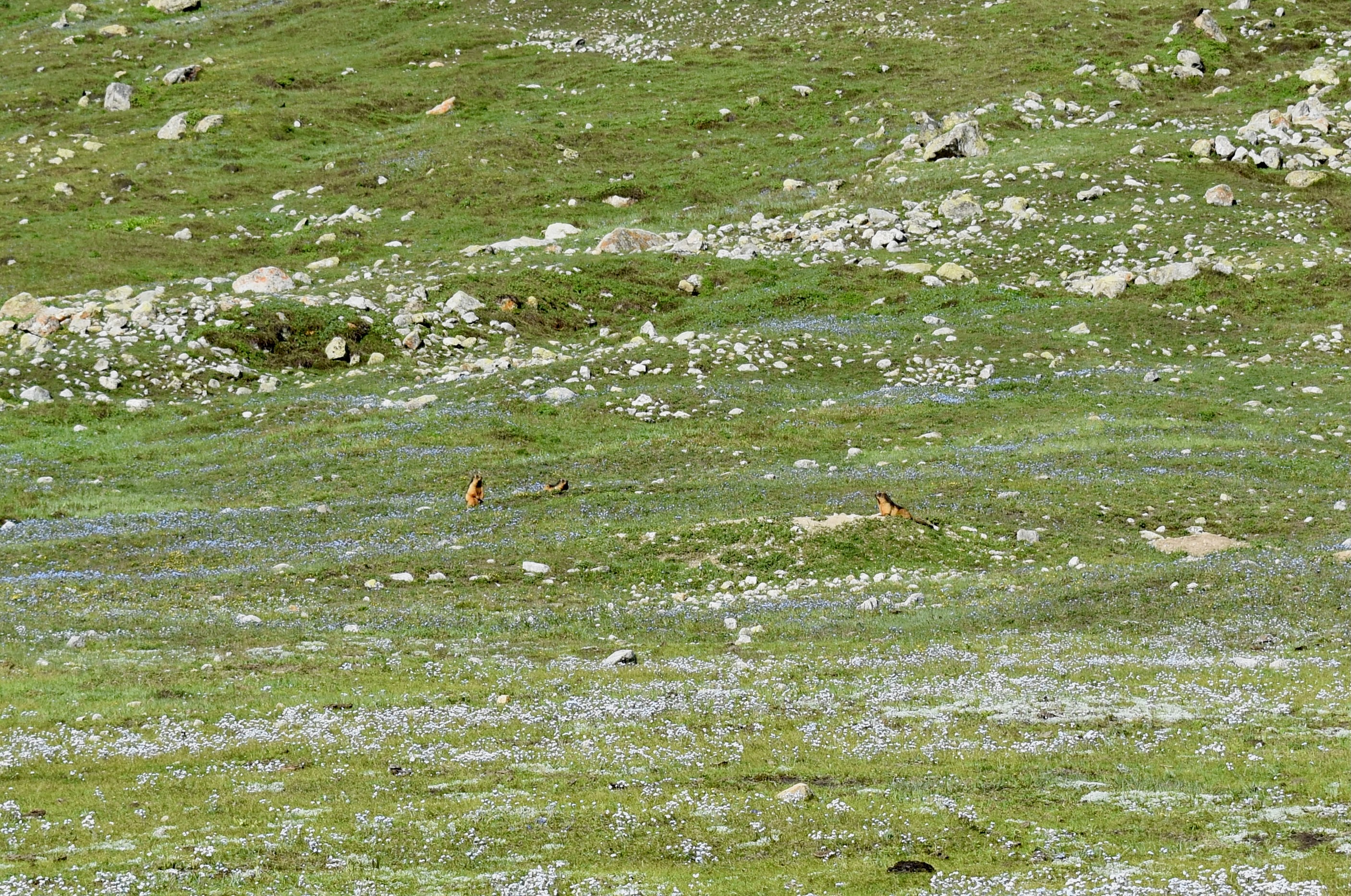 Once past the rivers, the trail went steeply uphill, following a small stream—probably the only other freshwater source aside from Beyal Camp. The climb ended in a bowl-like grassy meadow, one of the most peaceful places we’d seen. Right away, we spotted two yaks lounging on the far side and about five or six marmots (the exact phrase Clare Googled was “Pakistan mountain big squirrels”) staring at us.