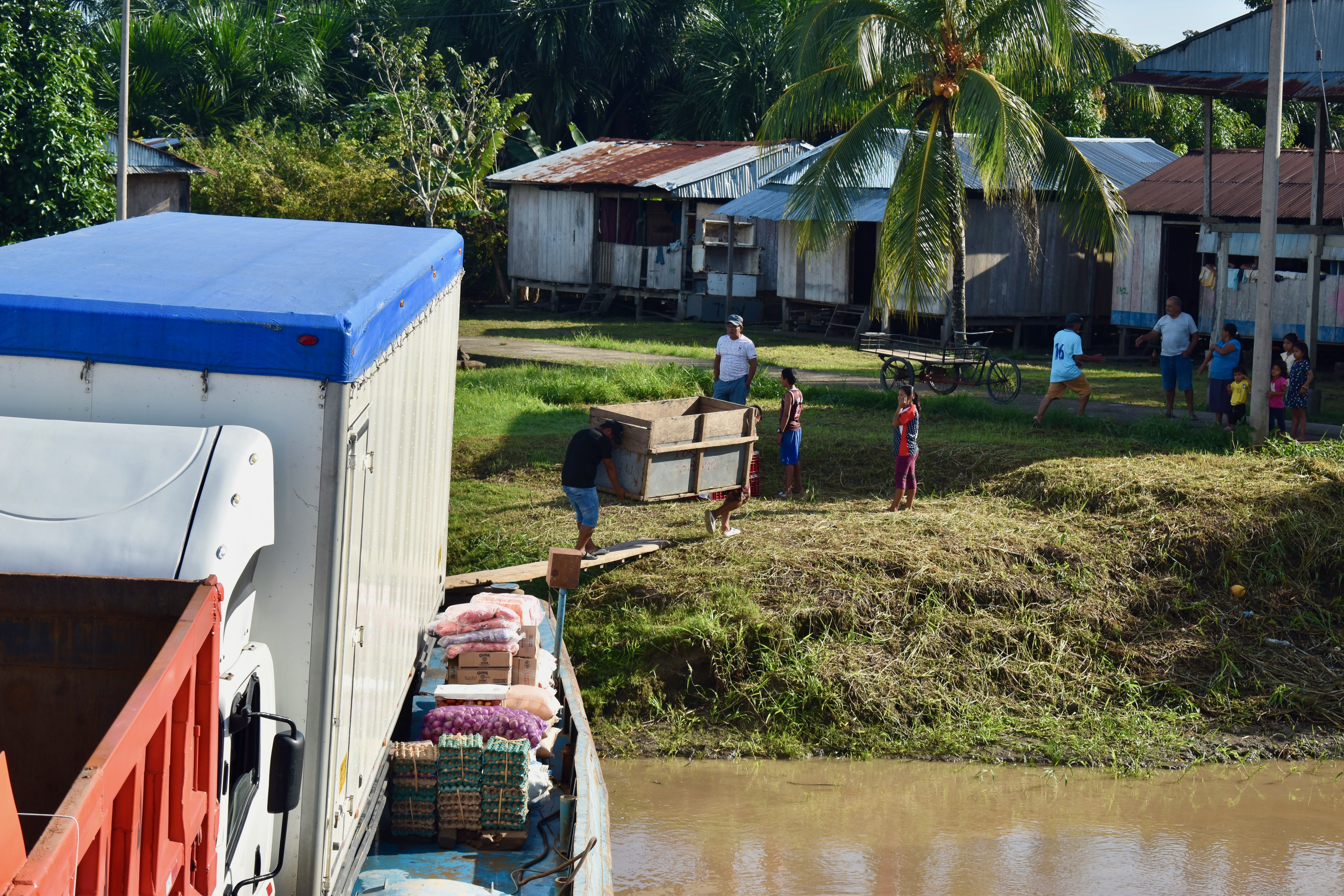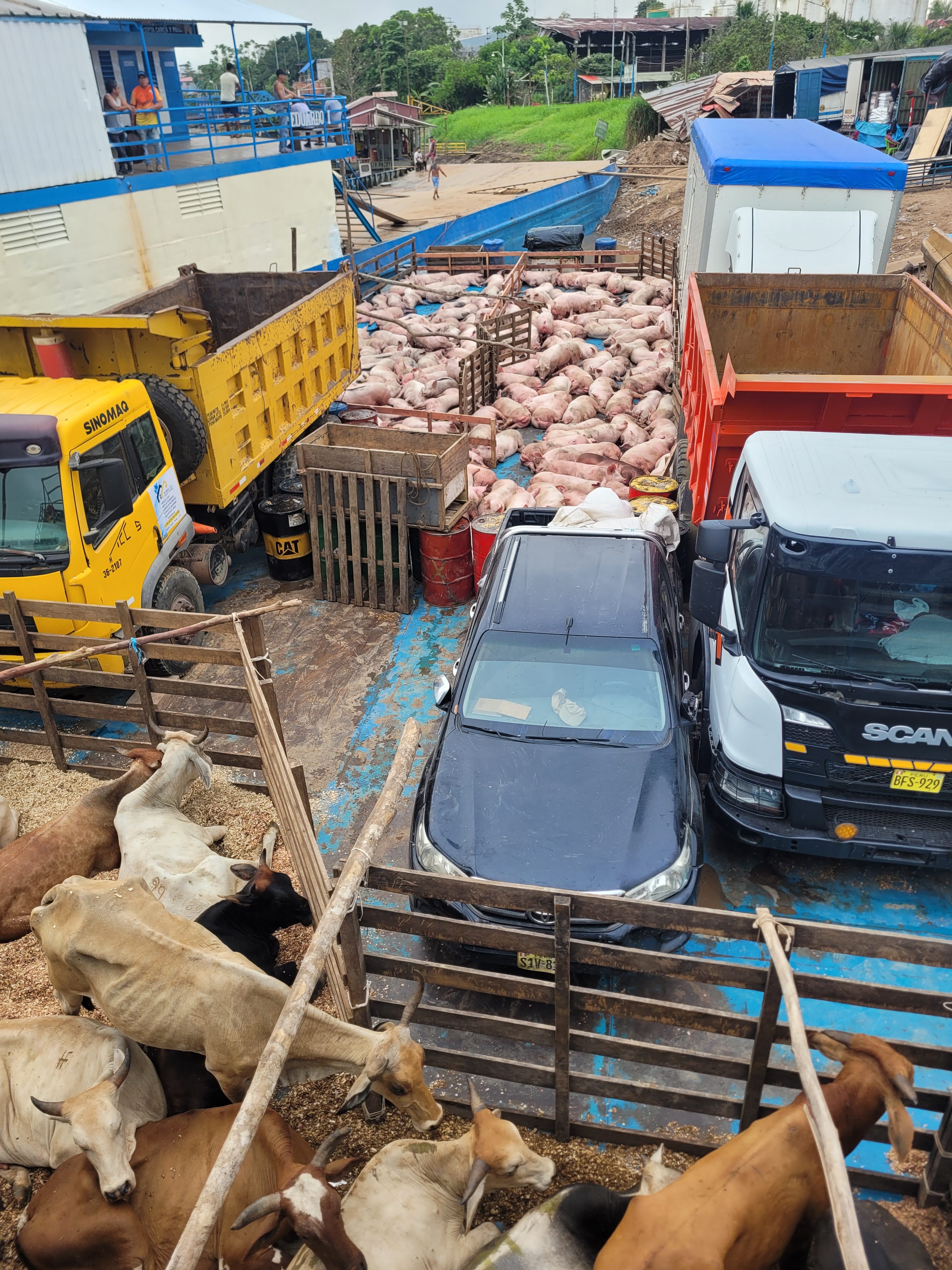 We were up at 5 am to finish packing and head for the boat. We were told that it would leave around 7 am and we wanted to be there at 6 am at the latest. When we got to Eduardo II, workers were already bringing more stuff on the board and there was a new pigsty. Some people were still asleep from the night before.