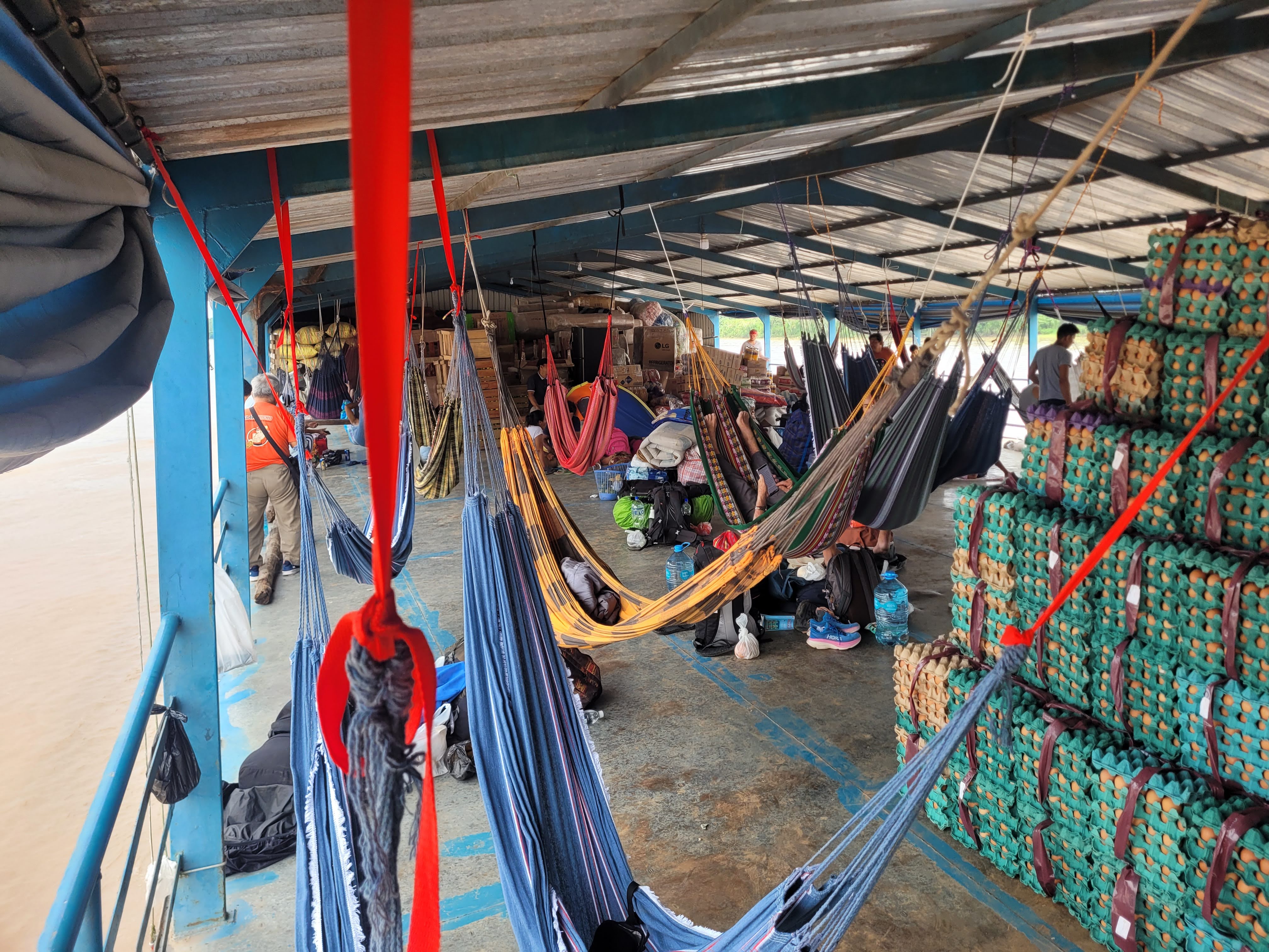 We settled at our hammocks and one of the first things was to try them. They weren’t very comfortable because the fella didn’t tie them the best so we had to do some alterations. It still wasn’t the best but we learned later how to attach them better. We got to know the people around us such as Dan from Switzerland, Sophia from Germany, and later Michal from Poland. More people joined later, mostly from France. I believe at the end there were 12 tourists like us (+ 2 kids) and about 20 locals. The rest of the ship was various cargo from chairs, a fridge, mattresses, juices, cement, and rice to cows, pigs, chickens, and about a million eggs.