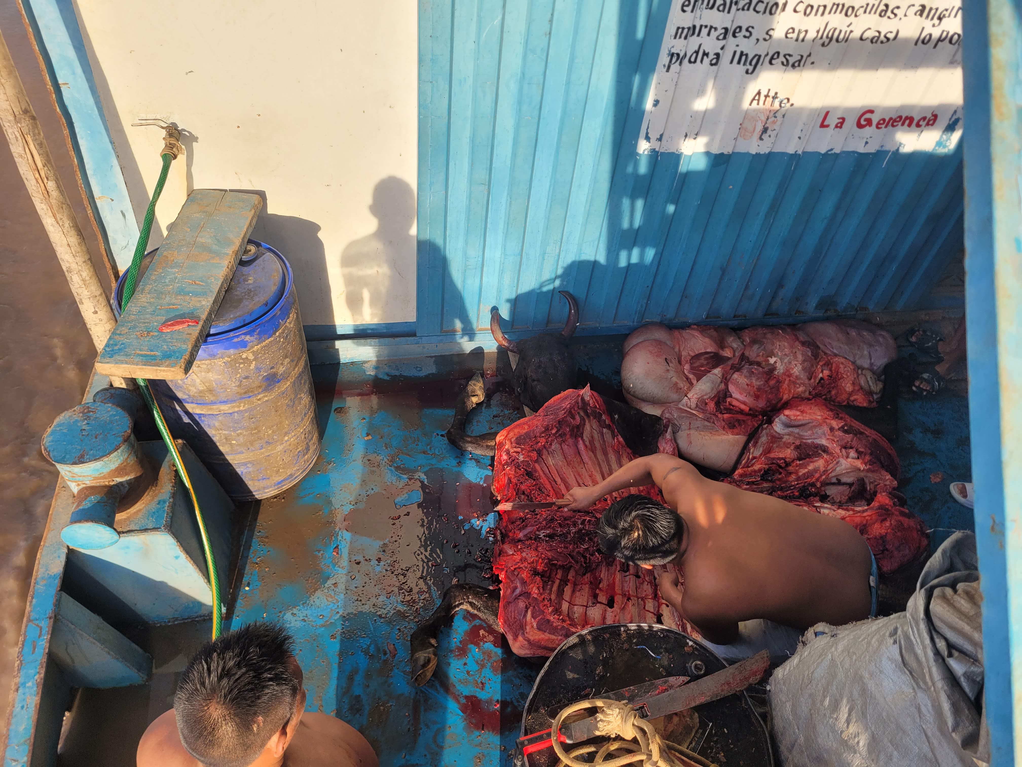 Clare slept relatively well but I couldn’t sleep at the beginning so I was reading on and off until after midnight. That’s why when I woke up breakfast was being served and everyone seemed already awake for hours. Breakfast was the poorest meal of the day with the usual Peruvian-style watery portage with a lot of sugar and a few pieces of bread. We had some leftover granola and chocopuffs and they made it better. There was also some sad news in the morning including one of the cows that didn’t make the night. When I came to the front of the boats, the cow was already being butchered.