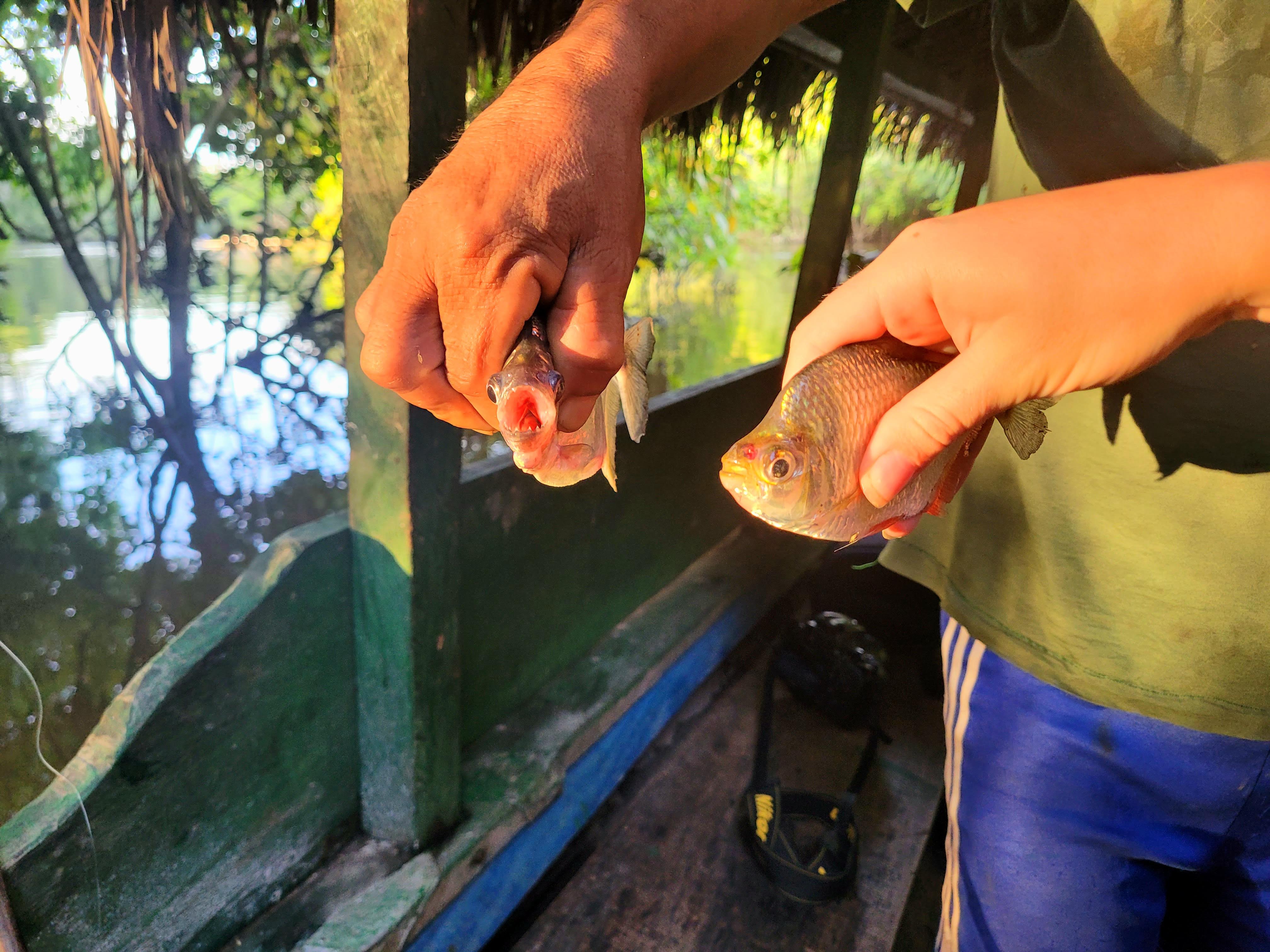 We didn’t get very lucky fishing in the Brown River branch so we went to try it in the Black River where piranhas are more common. It took a while and I already thought that we wouldn’t get anything but then we started getting luckier and finally I pulled out a piranha. Clare got another fish (Mohara) basically at the same time. Later Kevin got one piranha as well and Clare caught a small catfish. I didn’t know that catfish have small spikes on their fins and had to learn the hard way. The one Clare caught, landed on my leg and got immediately stuck. Kevin had to come forcefully rip it out. I was glad that the catfish was small.