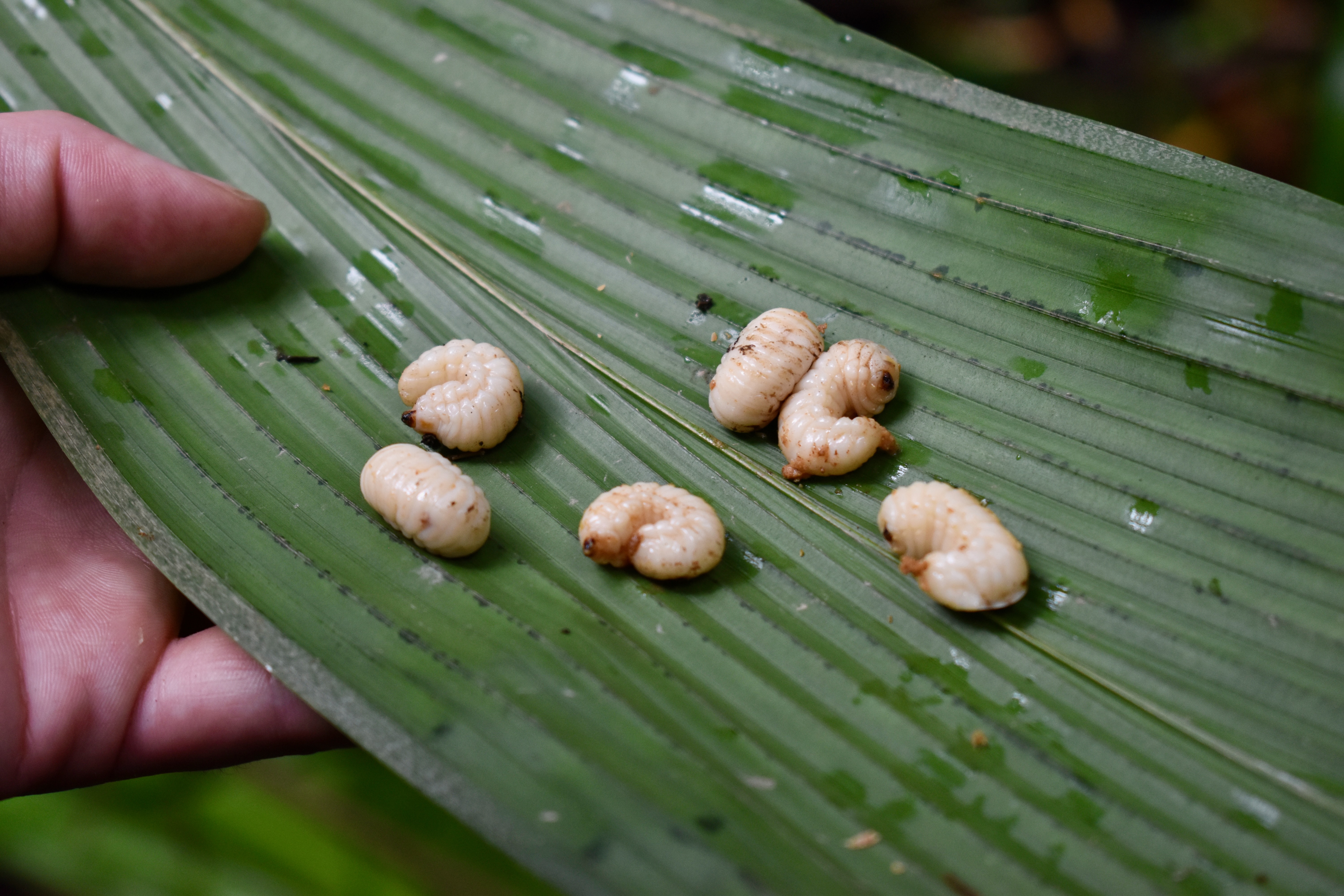 Another silver lightning was that the rain calmed down and we could go for a walk. We both got a pair of rubber boots and set off up the river. Before we got off the boat we saw Makaws and Tamarin monkeys hanging in the trees along the river. We started our walk learning about a wild mango tree, trying the mango, and also finding out that ants plant larvae into the seeds. We found some of them and ate them raw. They were quite ok. We then collected more for dinner.