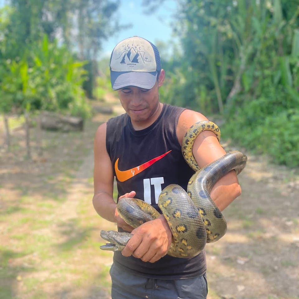 We walked further into the jungle, learning about different trees, and how they can be used as medicine. We had to cross a lot of flooded parts and Clare’s boot turned out to have a small hole and she started taking on some water. We also found a small snake Alfaninga and Kevin tried to catch it but it got away. We spent a long time watching a sleuth hanging in the crown of a tree eating slowly. Later we spotted a family of small Munsaky monkeys and red Titi monkeys. We also heard a roar sounding like a jaguar but couldn’t find it anywhere. We emerged from the jungle just across the river from our lodge and Kevin’s father ferried us across.