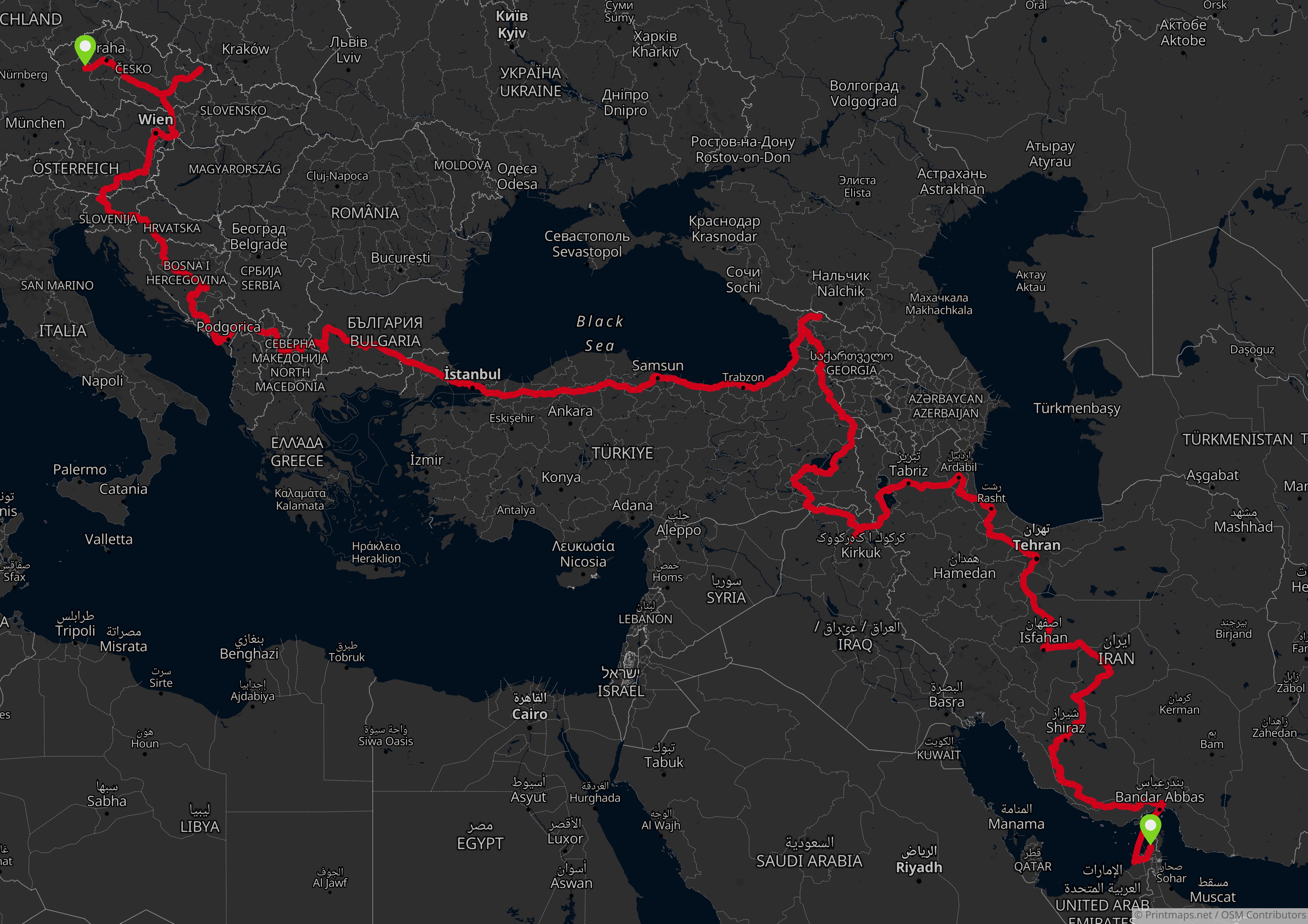 If you look at the map and ask for the most direct route, it would take you through Saudi Arabia and continue north through Kuwait and Iraq. However, we chose a wee bit different path. We started our journey on a ferry from Sharjah to Bandar Abbas in Iran. We were really intrigued to visit Iran, so we spent 28 days there. The original plan was to then cross to Turkey (actually, the original was to cross to Azerbaijan, but the border was still closed because of Covid), but we liked Iran so much that we changed it and went for 10 days to Iraq, more accurately to Kurdistan. We crossed to Turkey at Zakho and continued north for a wee detour to Georgia for hiking. Then we returned to Turkey and followed the Black Sea coast to Istanbul and further to Europe.