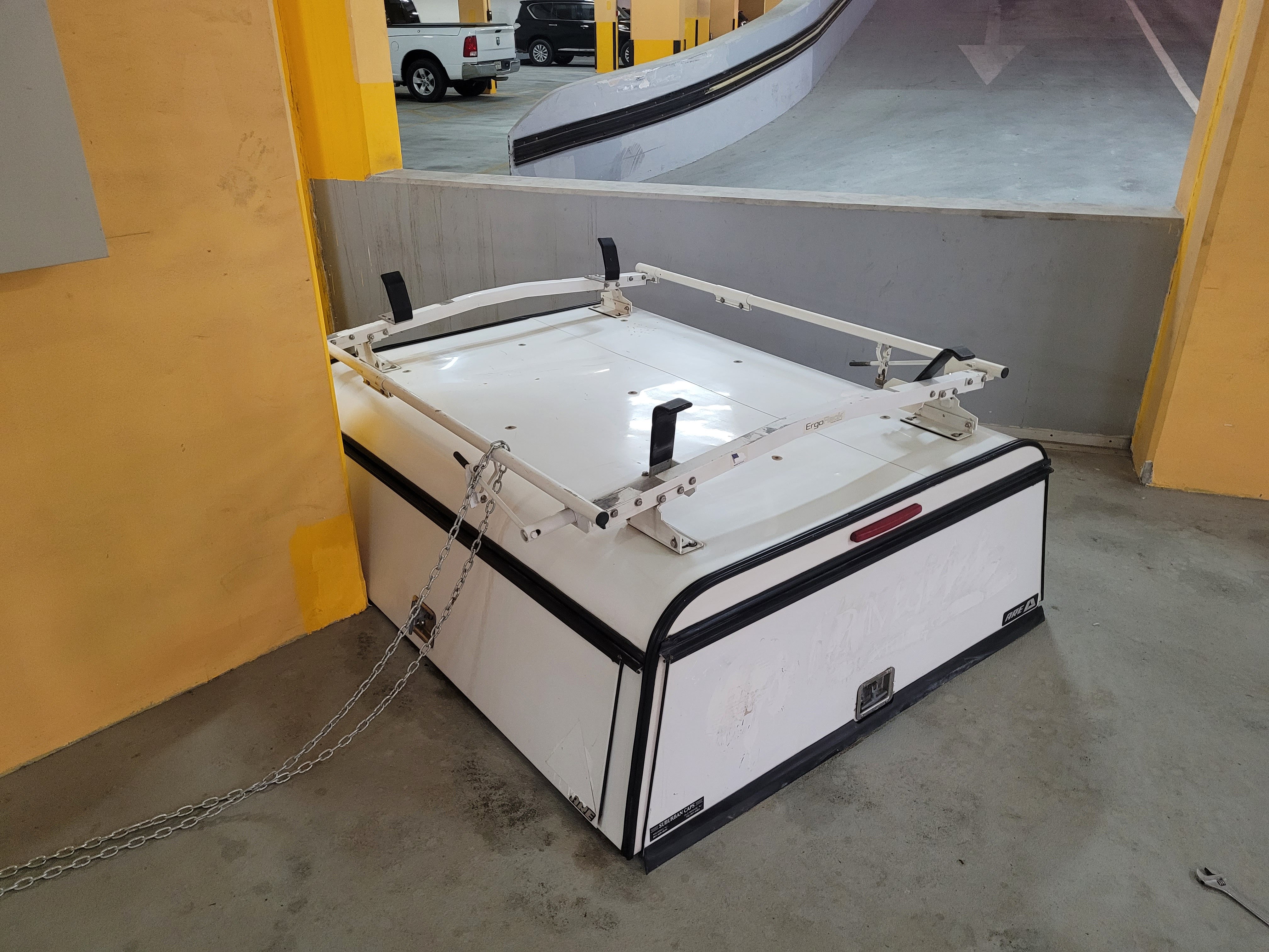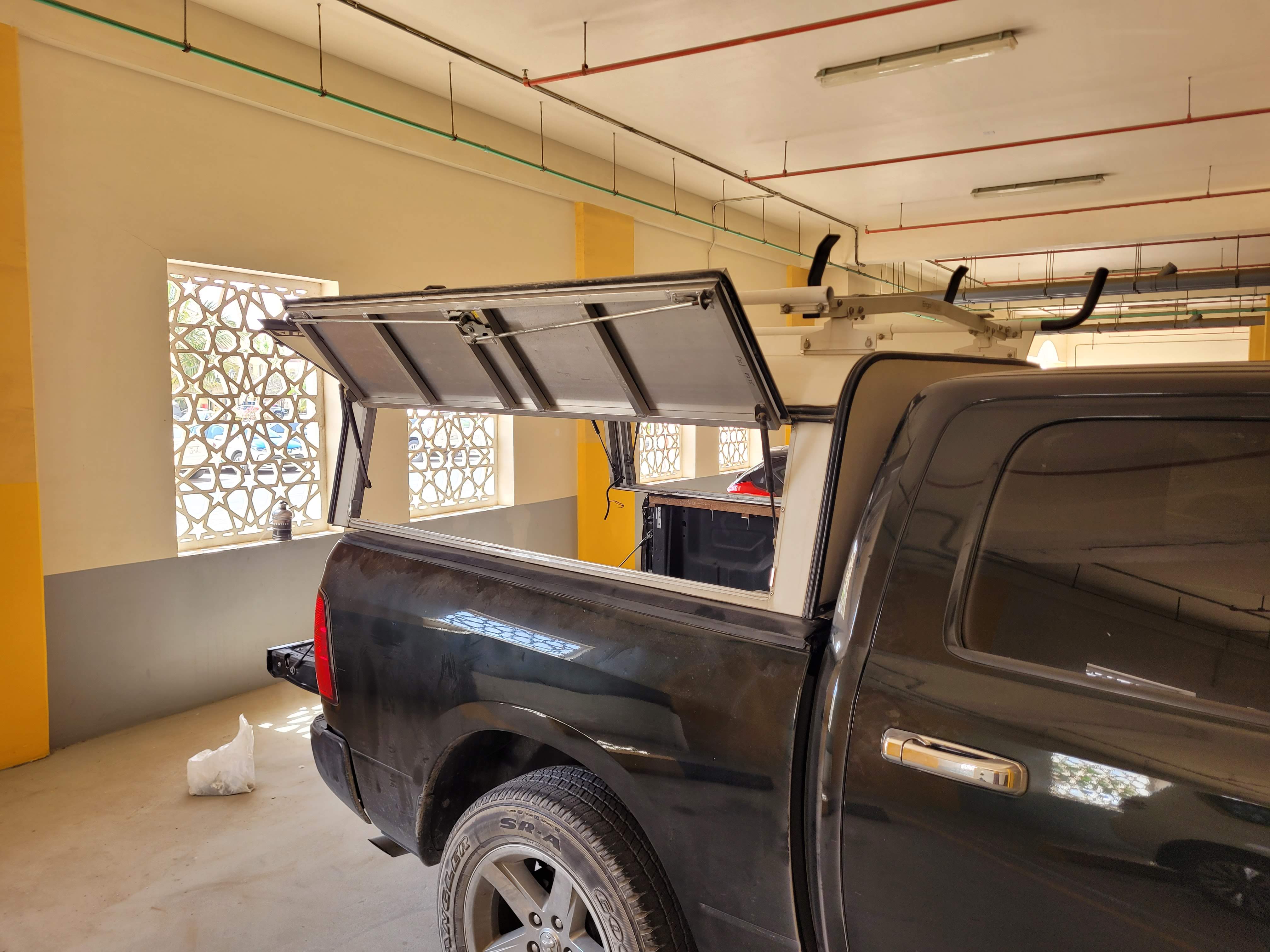 Since we were already there, we went to look for the second most important part, which was the bed cover. This is something that you wouldn’t see very often in the UAE, and so it was very hard to even find any to look at; moreover, some that fit our car or were in good shape. I think we saw like two after hours and hours of searching. That’s when we came back to the first yard that we visited, where we got the “new” rim. We mentioned to them what we were looking for in passing, and they took us to the back corner of the yard. There was an older, white utility shell – something we have never seen before. Unfortunately, it was from Toyota Tacoma and didn’t fit our car bed size.