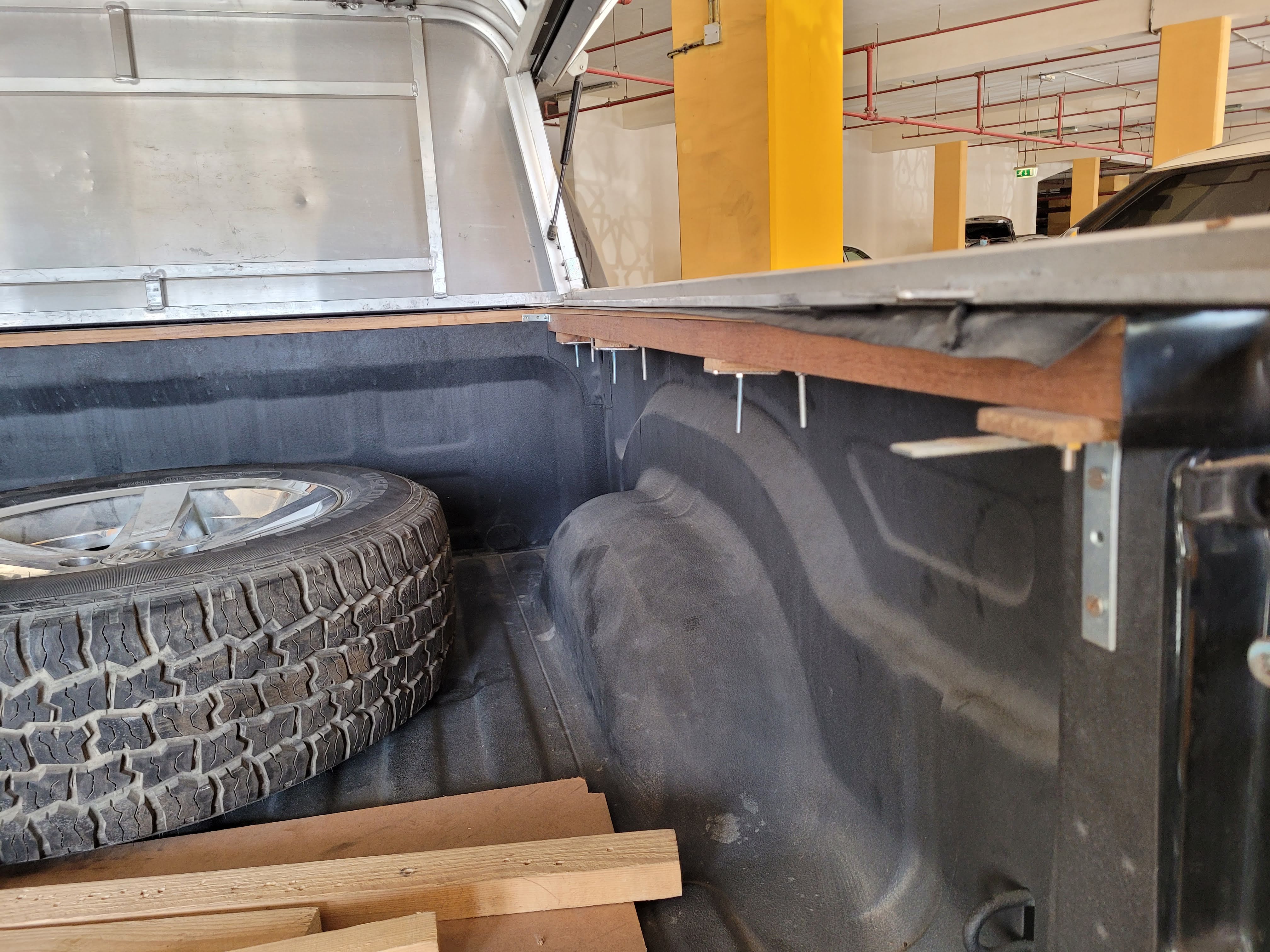 The first thing we started with was cleaning the shell, removing some unwanted things, and checking if it doesn’t leak anywhere. Next was probably the hardest part of the whole setup. In order to securely attach the shell to the bed of the truck, we needed to add an extended railing to the sides of the bed, because the shell got narrower as it extended to the end of the bed. We came up with a plan where we attached two steel Z-shaped brackets on each side of the bed where the bed was deeper than its edge, and one L-shaped bracket on the end of the bed. These were then holding two 5×5 cm beams, making the whole bed 5 centimeters narrower on each side. We then attached a plank on the beam and the edge of the truck bed to cover the gap between them, flatten the whole surface, and create a platform for the shell. It doesn’t sound so difficult when I’m writing it now, but the main issue was that the extended ledge had to hold the weight of the shell and not move as the car was driving through anything. Luckily, the back of the bed was fully supporting the bed, so not all the weight was on the attached beams.