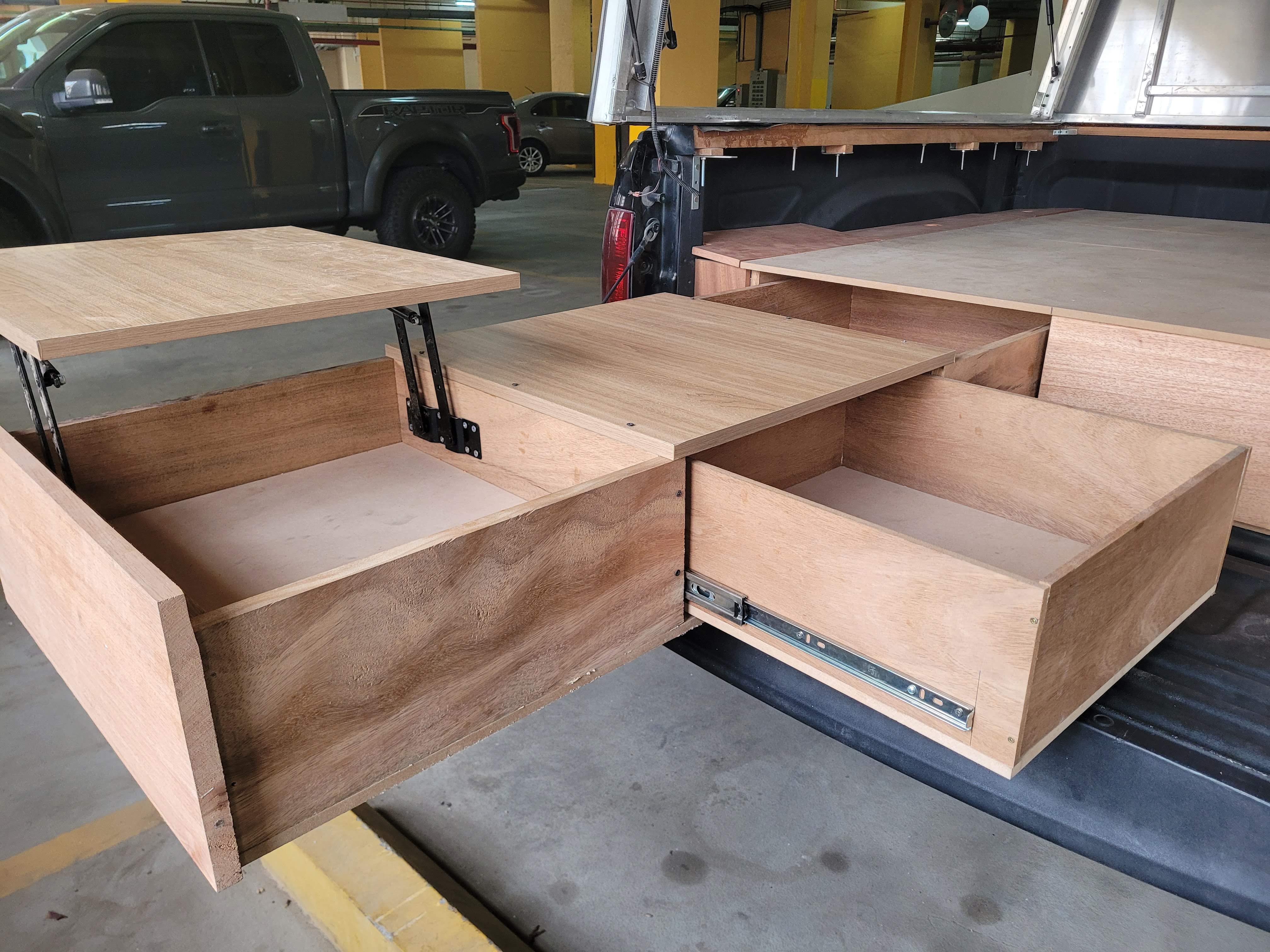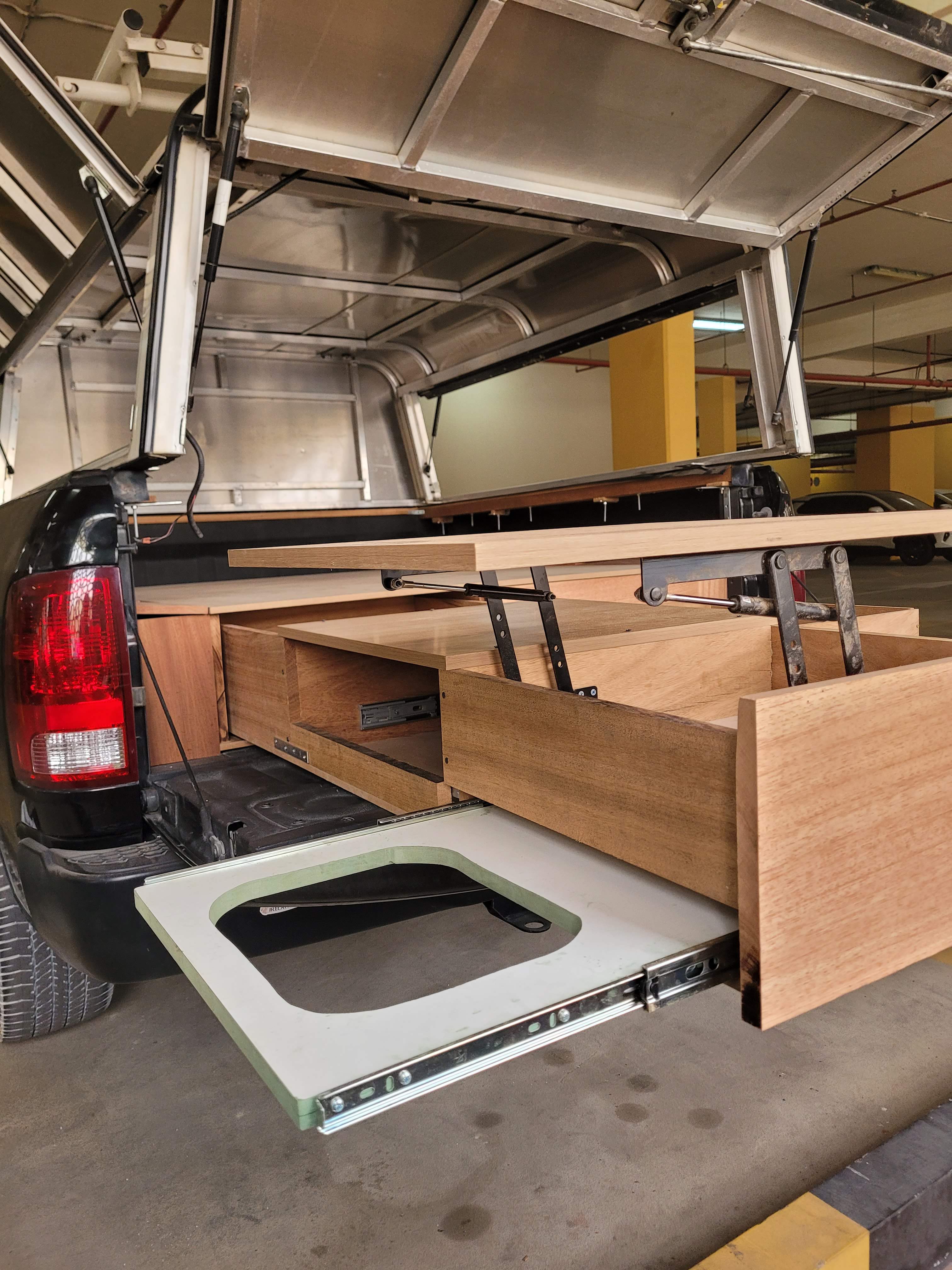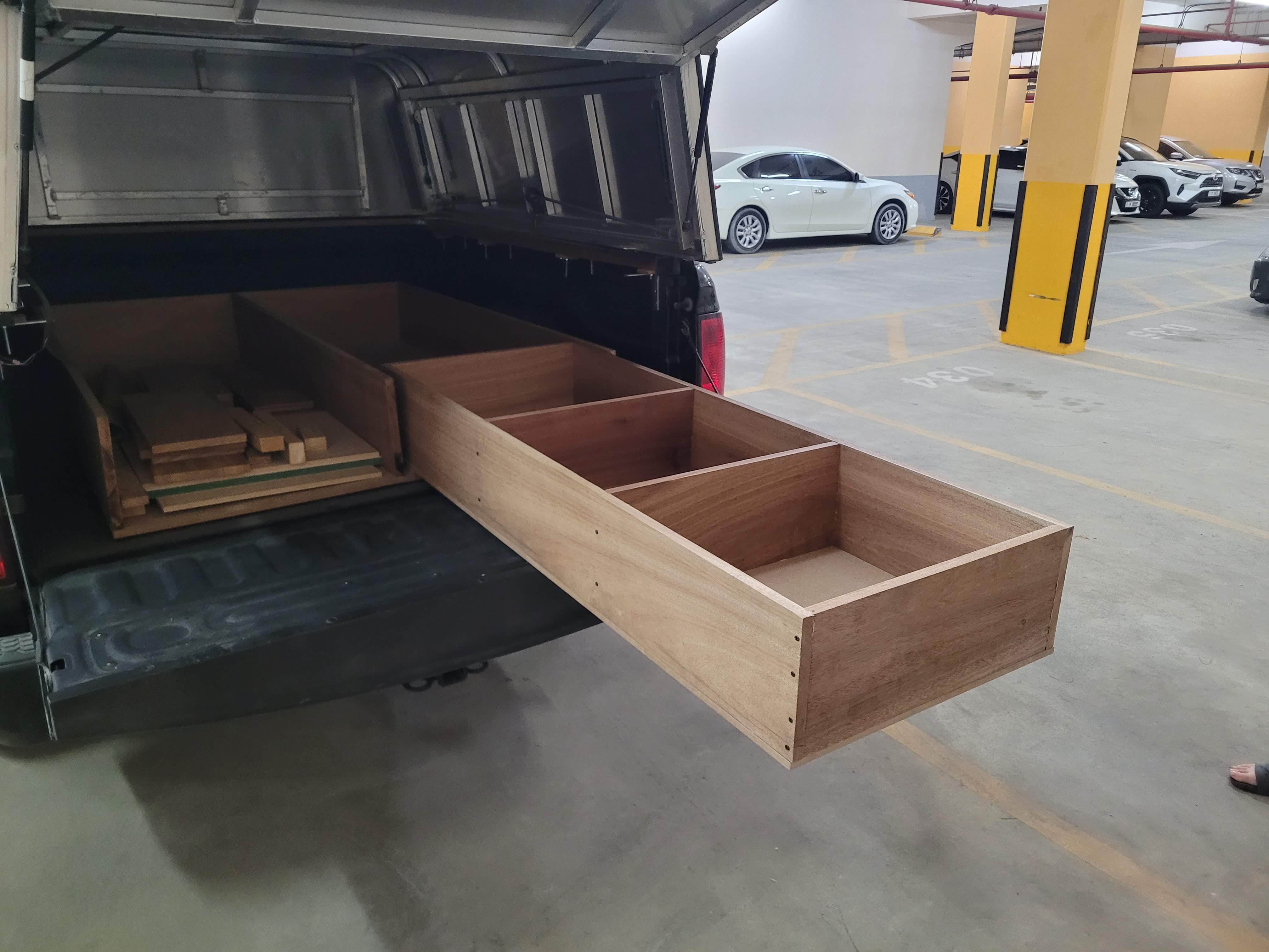 After we attached the shell, the next step was waterproofing it, and then we started building drawers and a platform for a mattress. We watched several videos online and created a design that fit us perfectly. We made a wooden two-drawer box that spanned the whole length of the truck bed. The left one was our kitchen, so it included a fixed countertop, but also a moving one on hinges, so we could use the space below as food storage. We also included a sliding drawer with a gas stove, and another one on the other side with a collapsible sink. The right drawer was then just split into three equal-sized compartments: one for food, and two for clothes. In the best scenario, they were supposed to be on railings, but a railing of this size costs a small fortune, so instead we waxed the bottom of the drawers with paraffin and let the wood glide on itself. In retrospect, this was a terrible decision! They would glide great, but we were doing these last things in the summer in the UAE, so once it got a bit colder, the paraffin would harden and glue the drawers in place, and we had a hard time opening them.