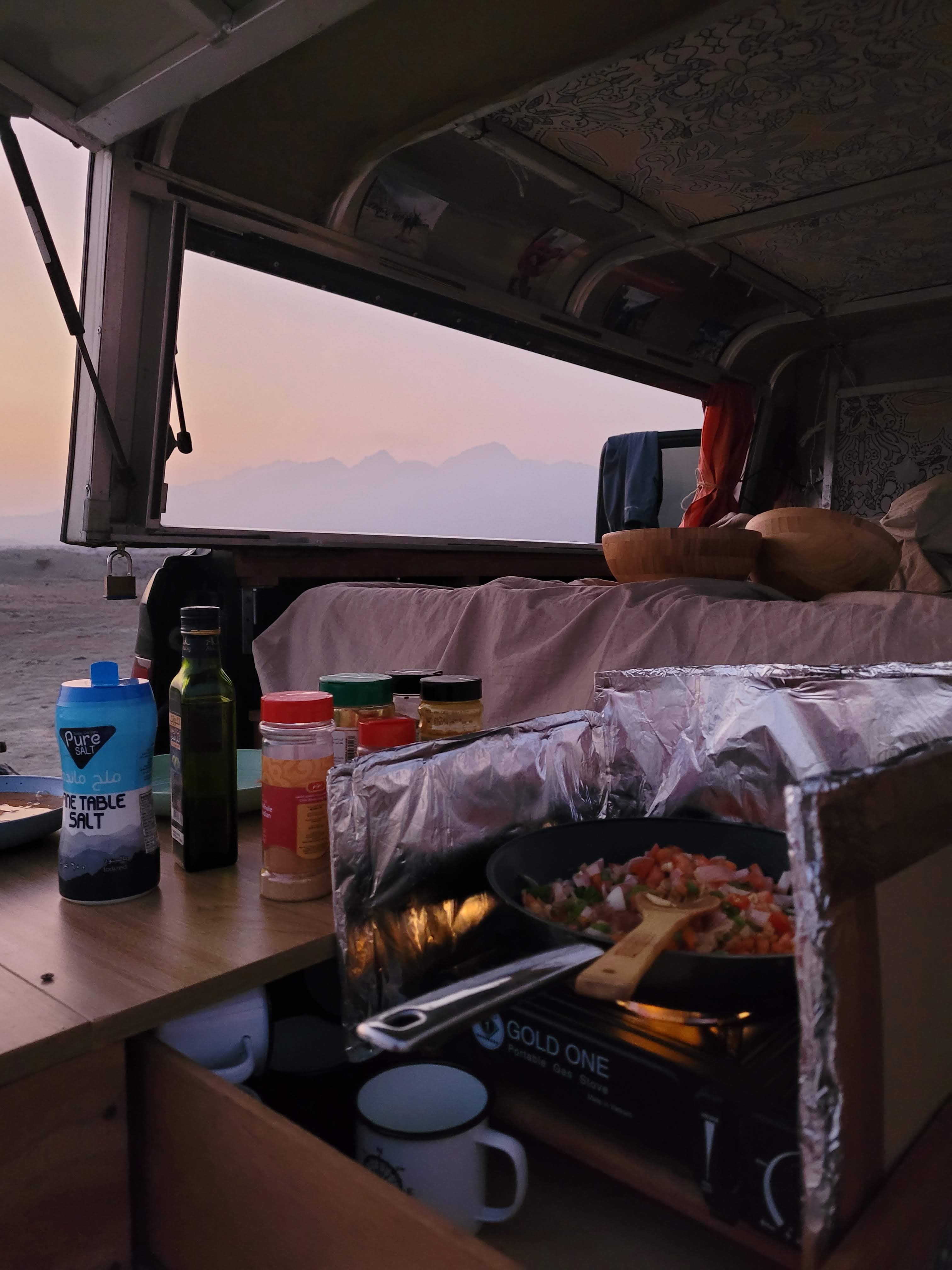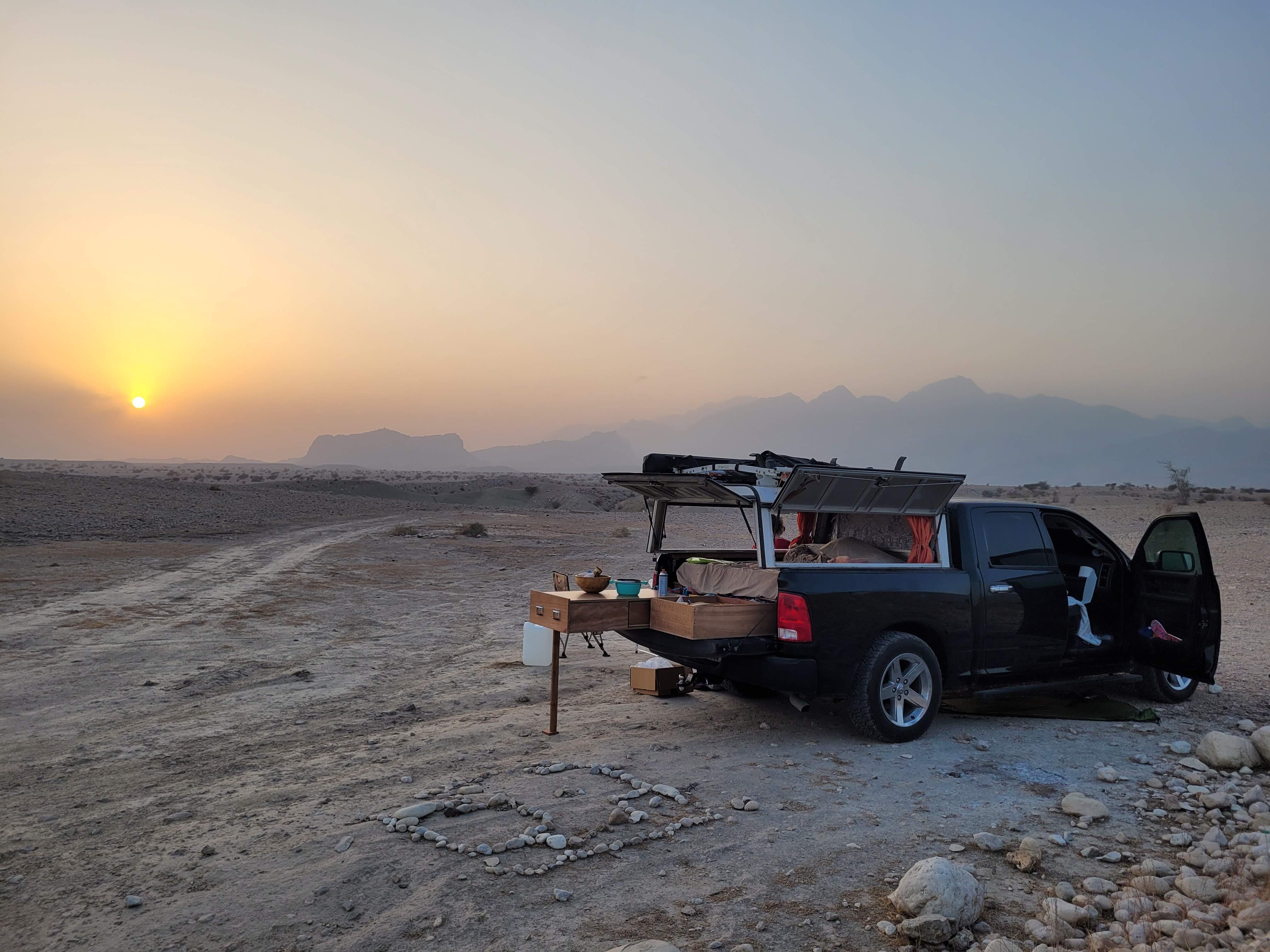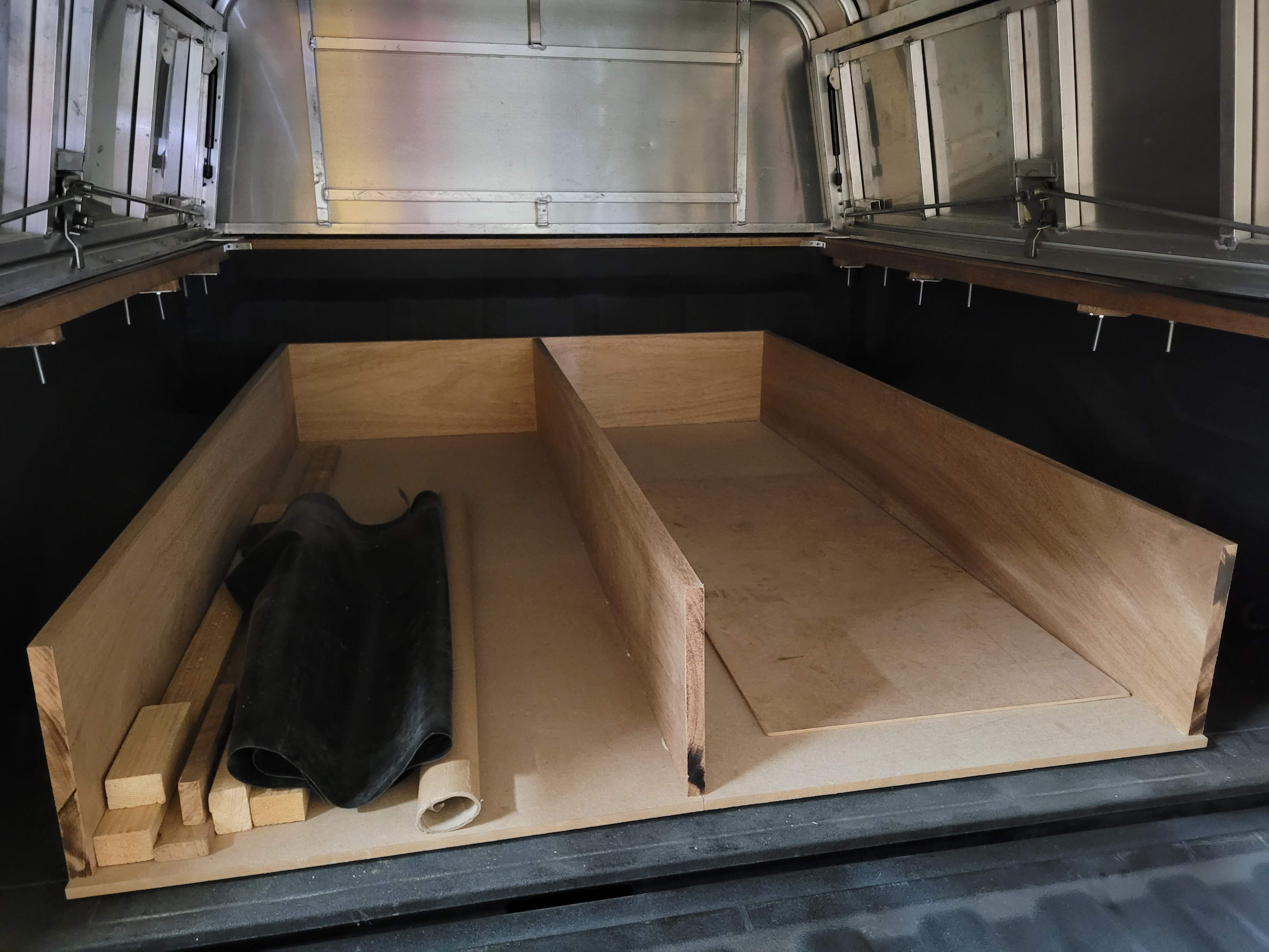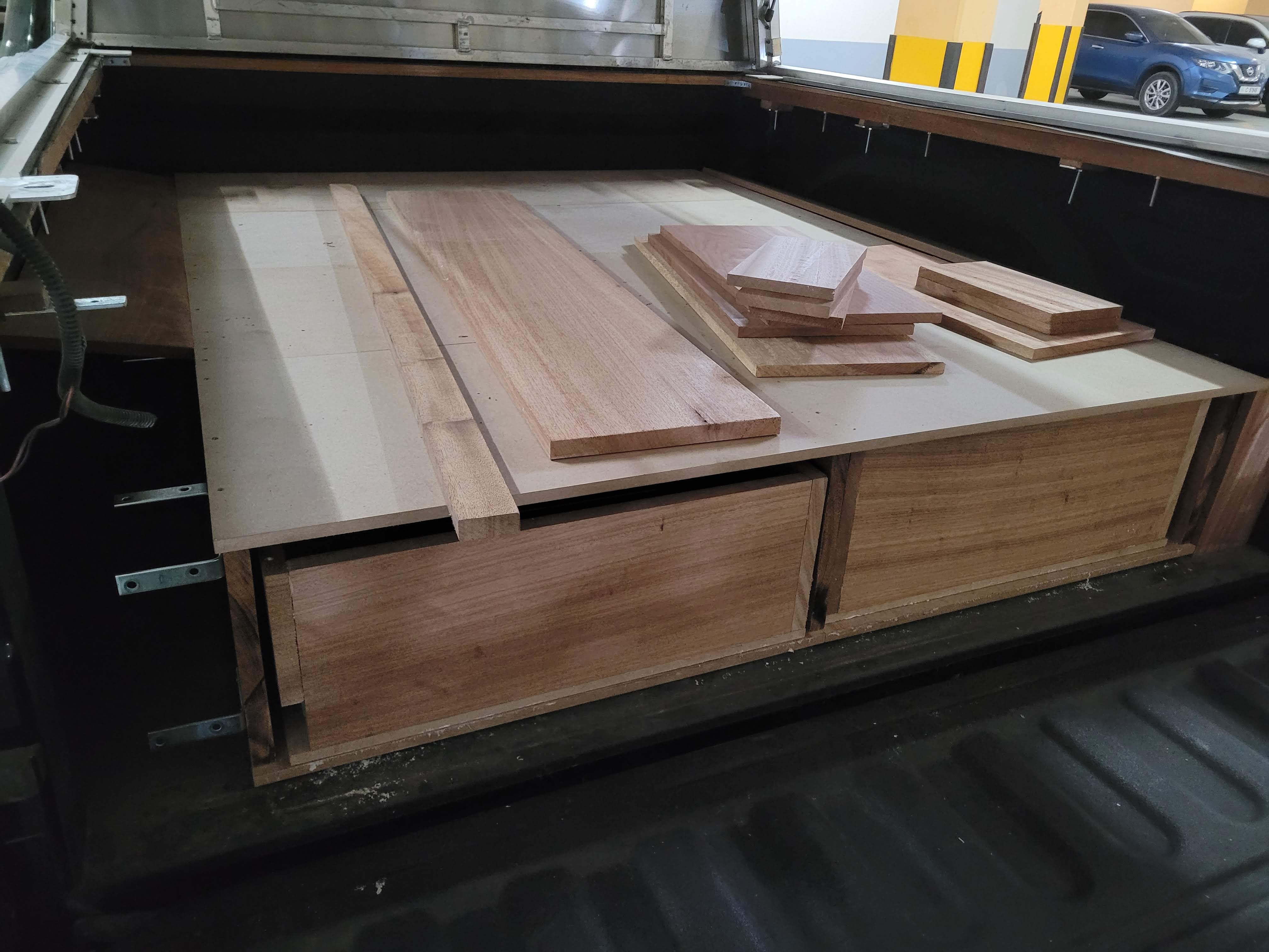 After we attached the shell, the next step was waterproofing it, and then we started building drawers and a platform for a mattress. We watched several videos online and created a design that fit us perfectly. We made a wooden two-drawer box that spanned the whole length of the truck bed. The left one was our kitchen, so it included a fixed countertop, but also a moving one on hinges, so we could use the space below as food storage. We also included a sliding drawer with a gas stove, and another one on the other side with a collapsible sink. The right drawer was then just split into three equal-sized compartments: one for food, and two for clothes. In the best scenario, they were supposed to be on railings, but a railing of this size costs a small fortune, so instead we waxed the bottom of the drawers with paraffin and let the wood glide on itself. In retrospect, this was a terrible decision! They would glide great, but we were doing these last things in the summer in the UAE, so once it got a bit colder, the paraffin would harden and glue the drawers in place, and we had a hard time opening them.