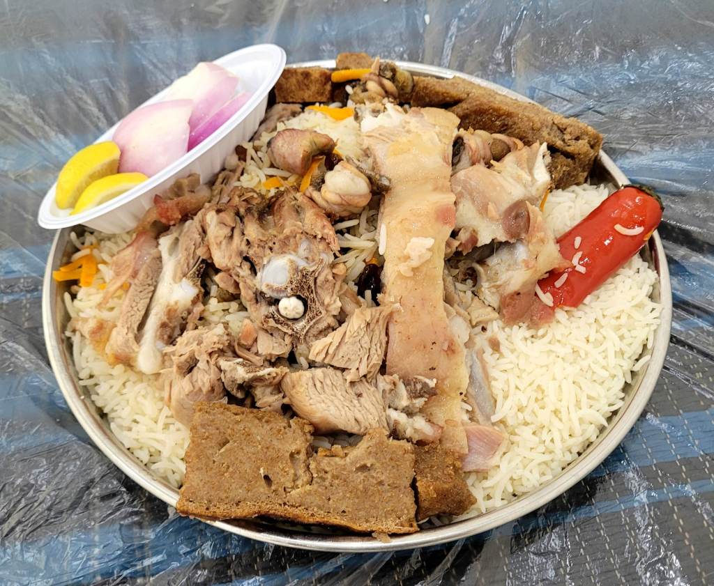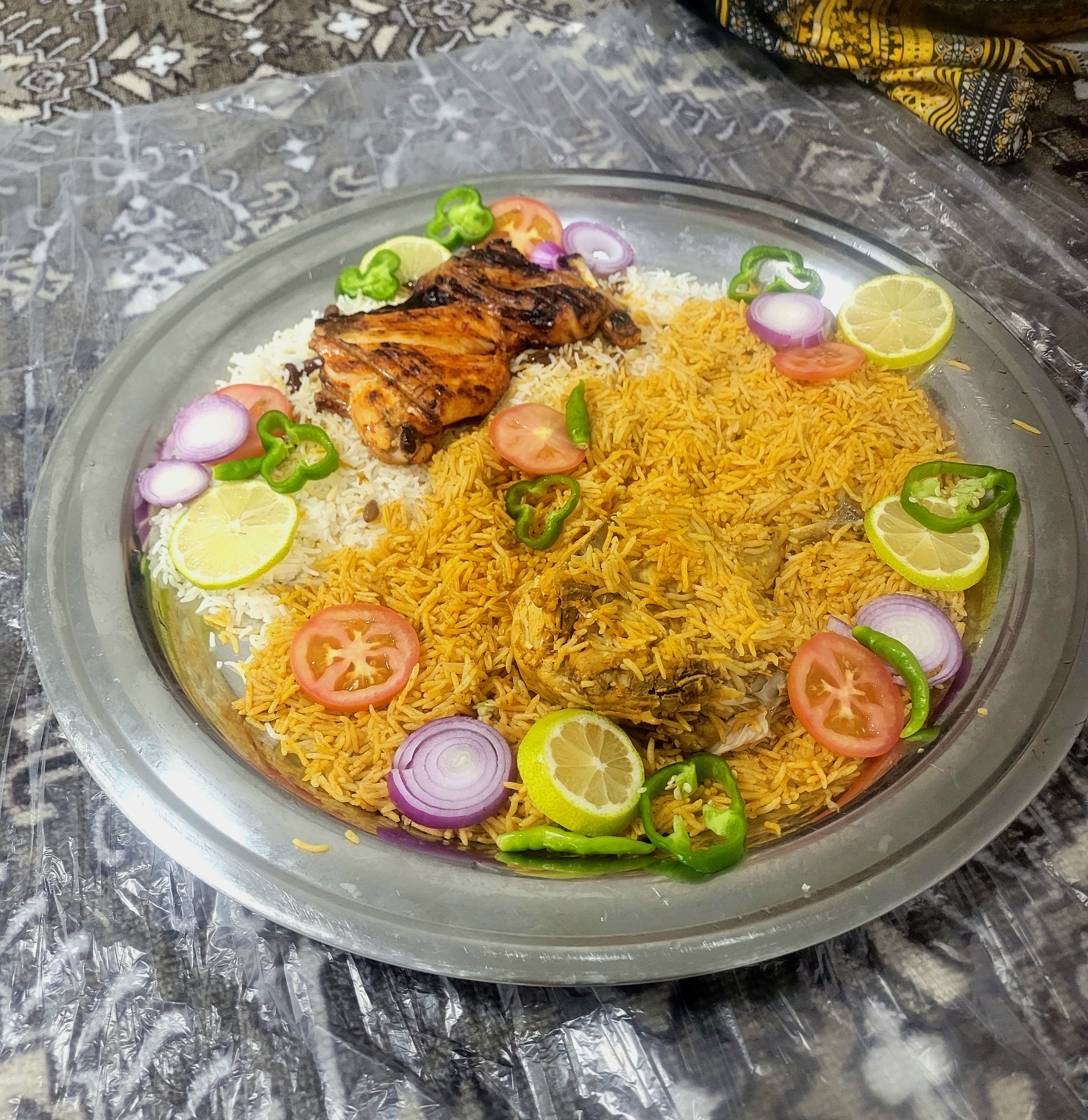 The last thing for us tonight was to find a camping spot. We could have camped in Hira but it was still early and we wanted to get a wee bit more distance in before the big drive to Riyadh tomorrow. Also, we still wanted the local food so every time we passed any petrol station or anything, we were looking if there was something where we could stop. We got lucky about 70 km in our drive and saw a restaurant on the other side of the highway. There were no U-turns but the divider of the highway was hard so we followed what we have seen many times the locals do, we just made our own U-turn. We got two different styles of grilled chicken with rice and veg (Madfoon).