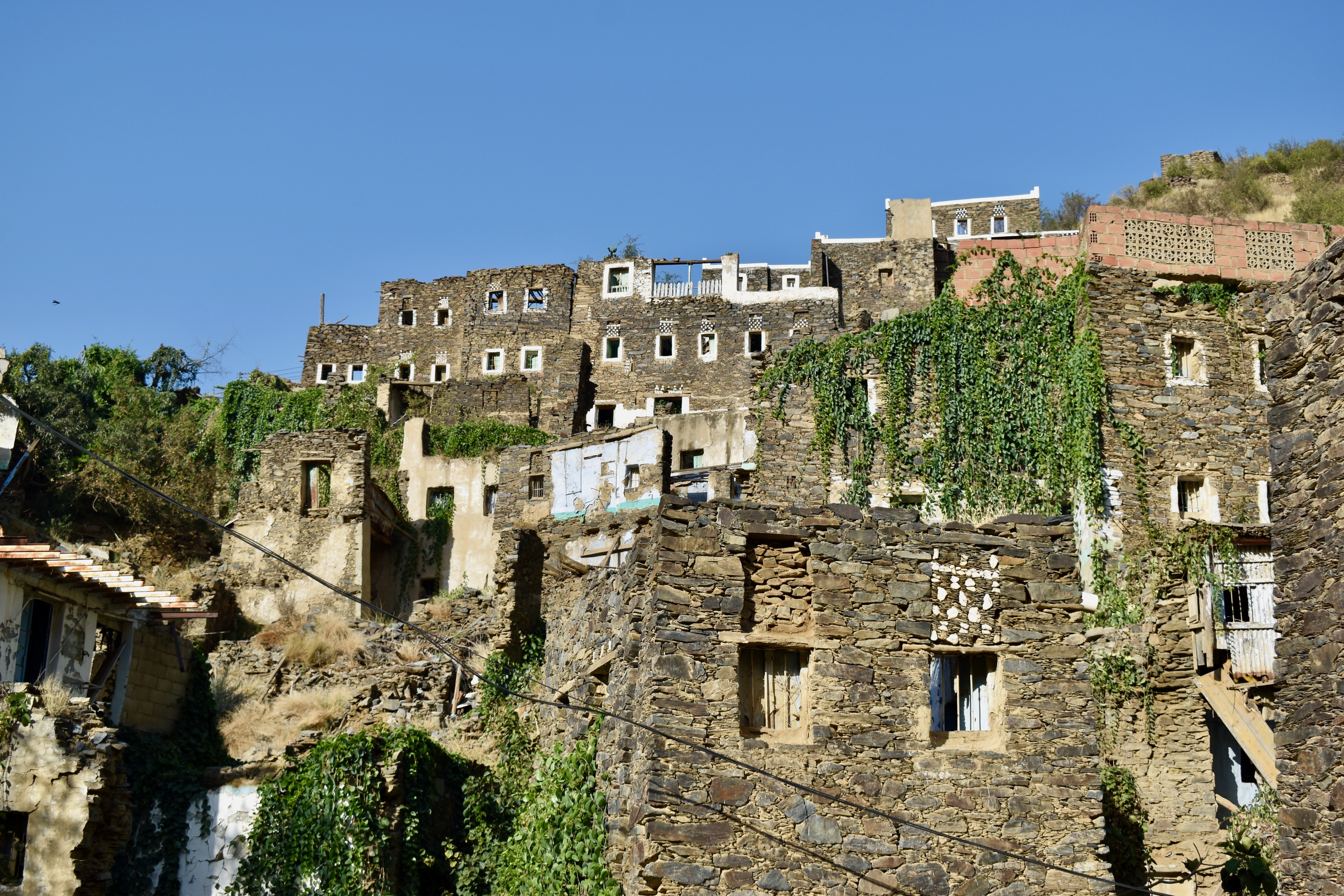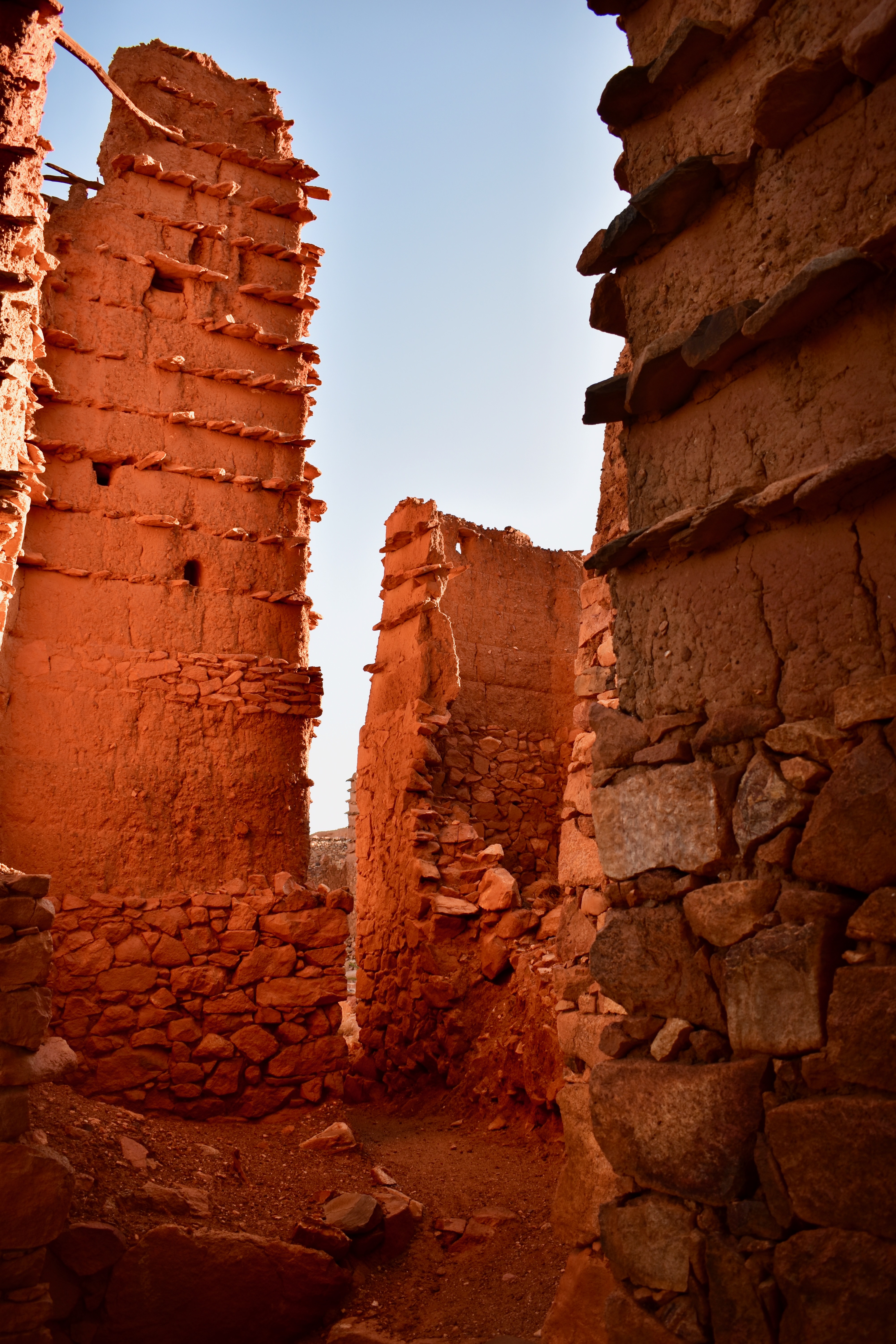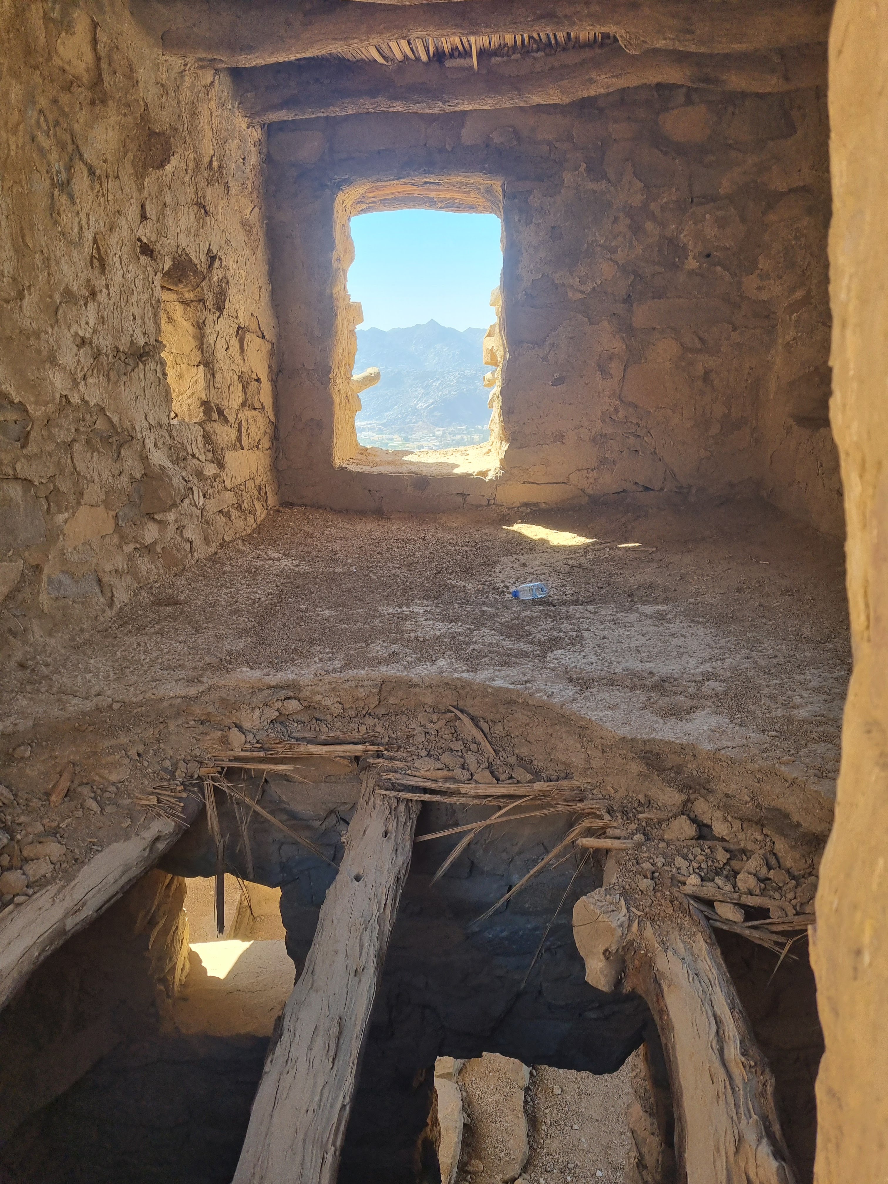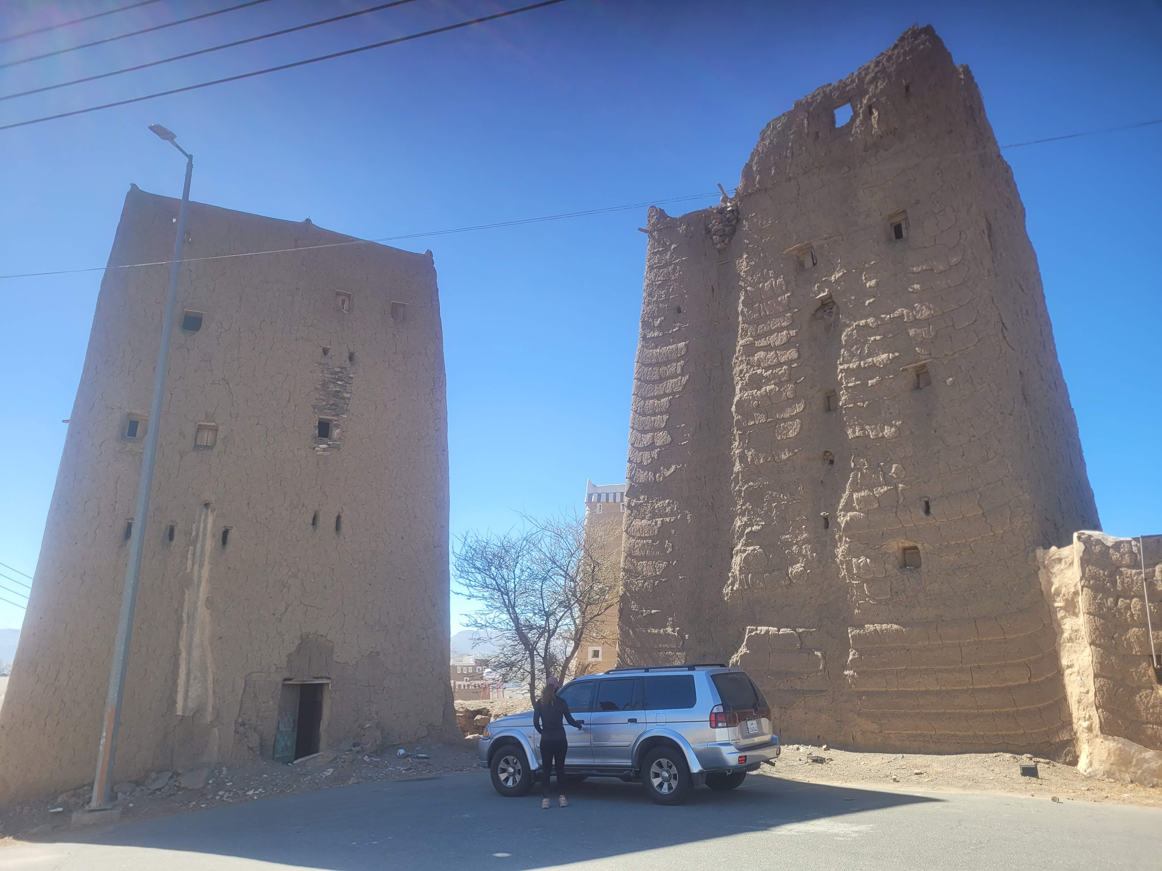 We were up and down in 2 hours and with reaching the peak it took roughly 4.5 km one way. After our descent, we continued on the road east since it was a shortcut to the main road to Najran. Along the way, we spotted another historical village and stopped for a few minutes. This village was similar to what we saw yesterday but the construction style was different. The buildings from yesterday were specific by layers of flat stones every 20-30 centimeters separating the mud walls and probably providing pressure to hold the wall together. These buildings didn’t have the layers and from up close it looked like they used mud on top of wooden/straw structures.