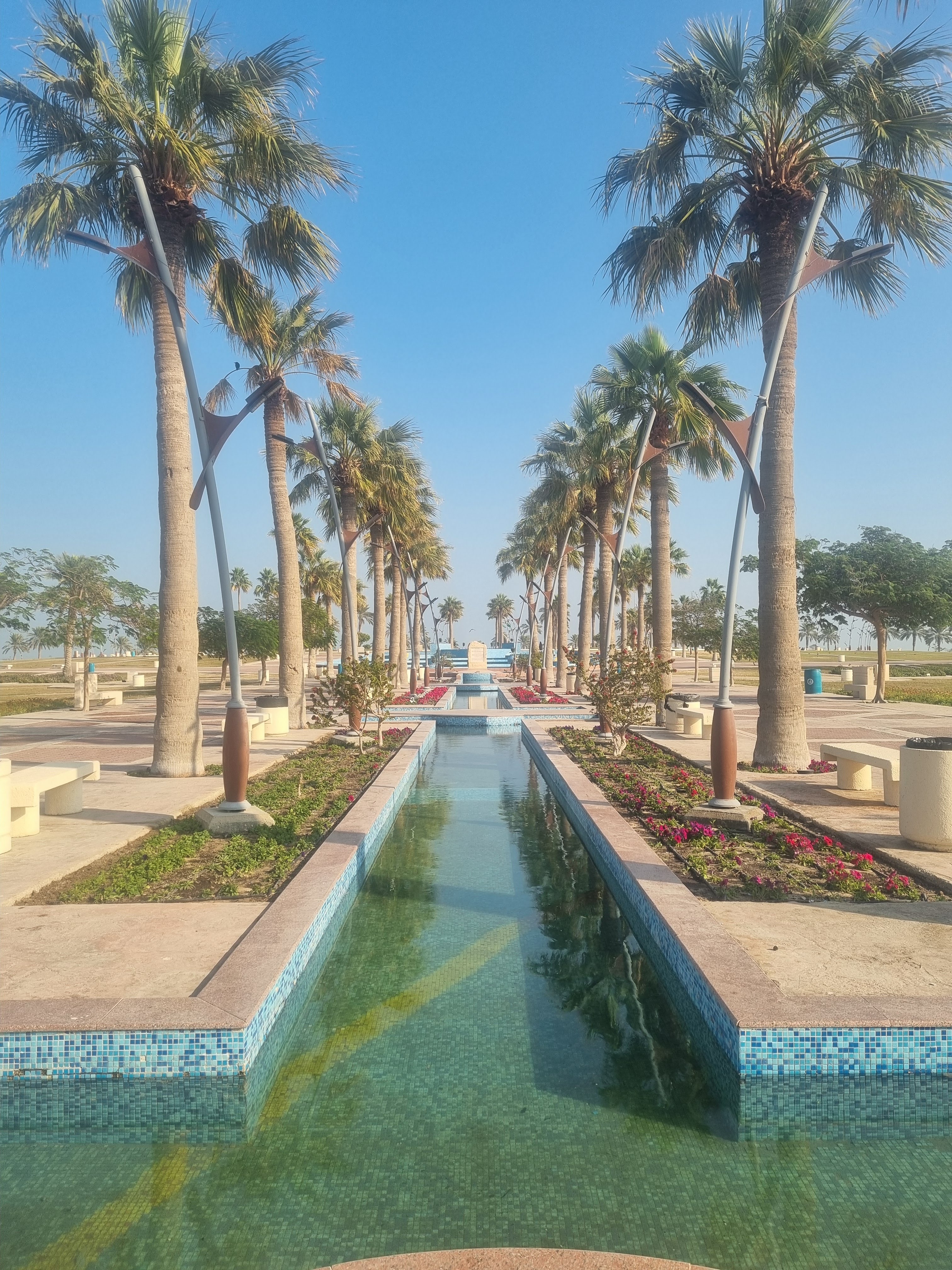 We walked around for a bit and then were on our way to the next stop which was another corniche area, this time in a part called Khobar. This seafront walk was nicely kept and we had a view of the Khobar Water Tower in the distance (it wasn’t possible to walk closer to it because that part of the walk was being repaired). We had a small break in the park and ate some leftovers we still had in the car. We wanted to stop for a coffee but nothing seemed open around.