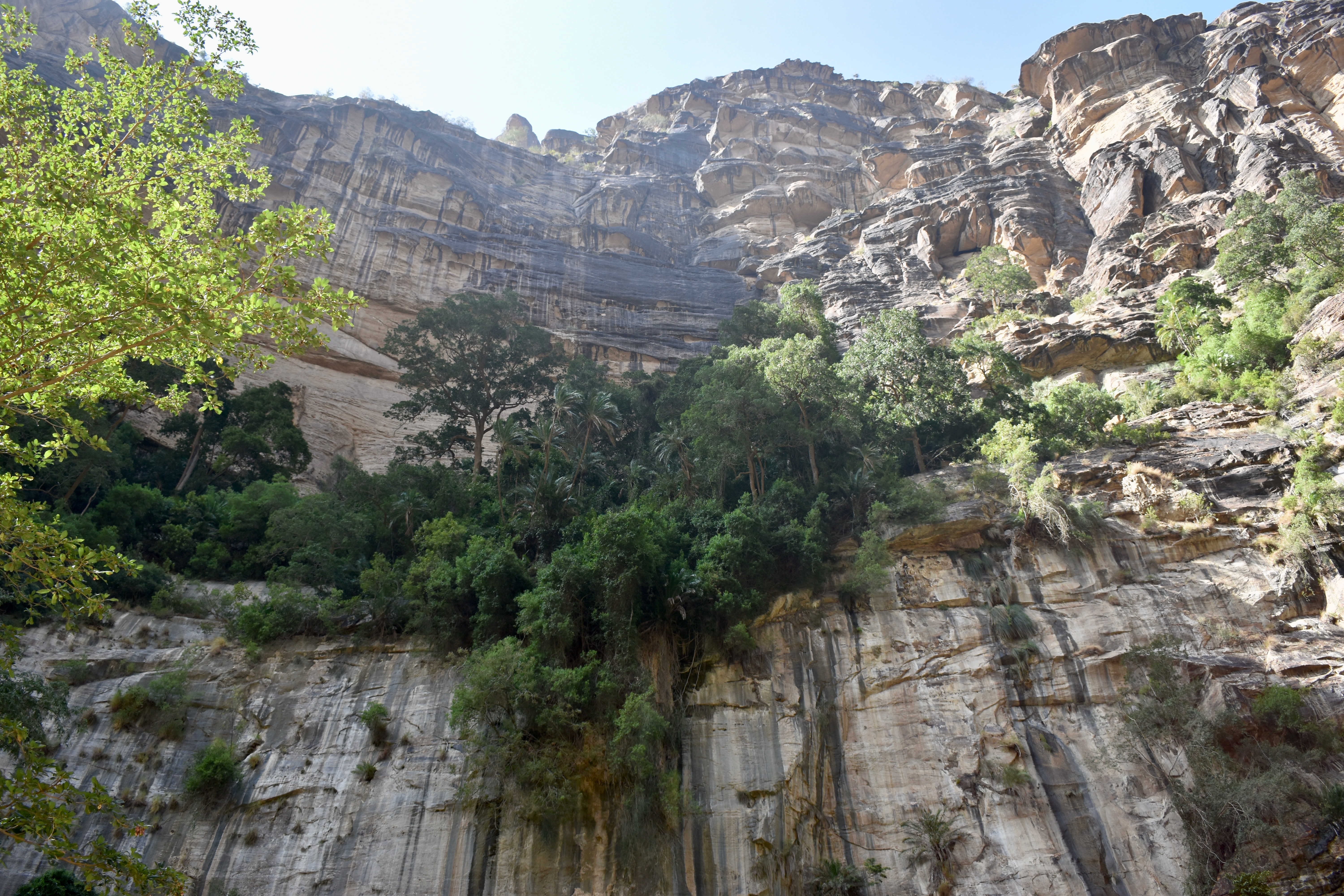 We continued about one more kilometer into the Wadi before we headed back. The water was so clear sometimes and just inviting us to jump in. At one point, there was an absolutely spectacular rainforest hanging suddenly on a ledge in the middle of the valley wall.