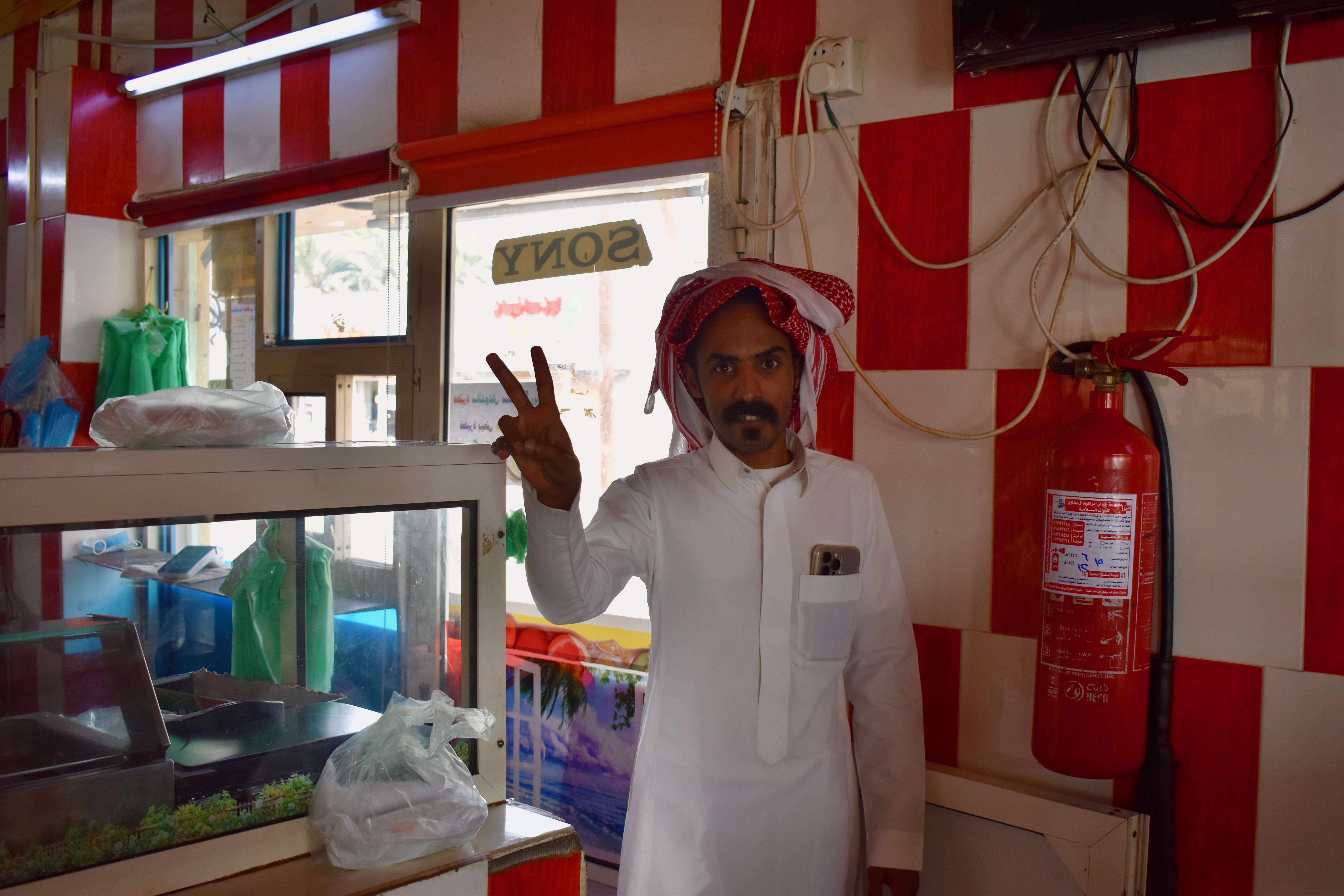 We were ready to go in the car just around 5 pm and were on the course to the border in no time since the cultural center was close to the highway out of the town. It took about 2 hours to get to the town of Salwa right by the border with Qatar. Here we stopped to get one more karak tea and shawarma before we headed across (and to use our loose change).