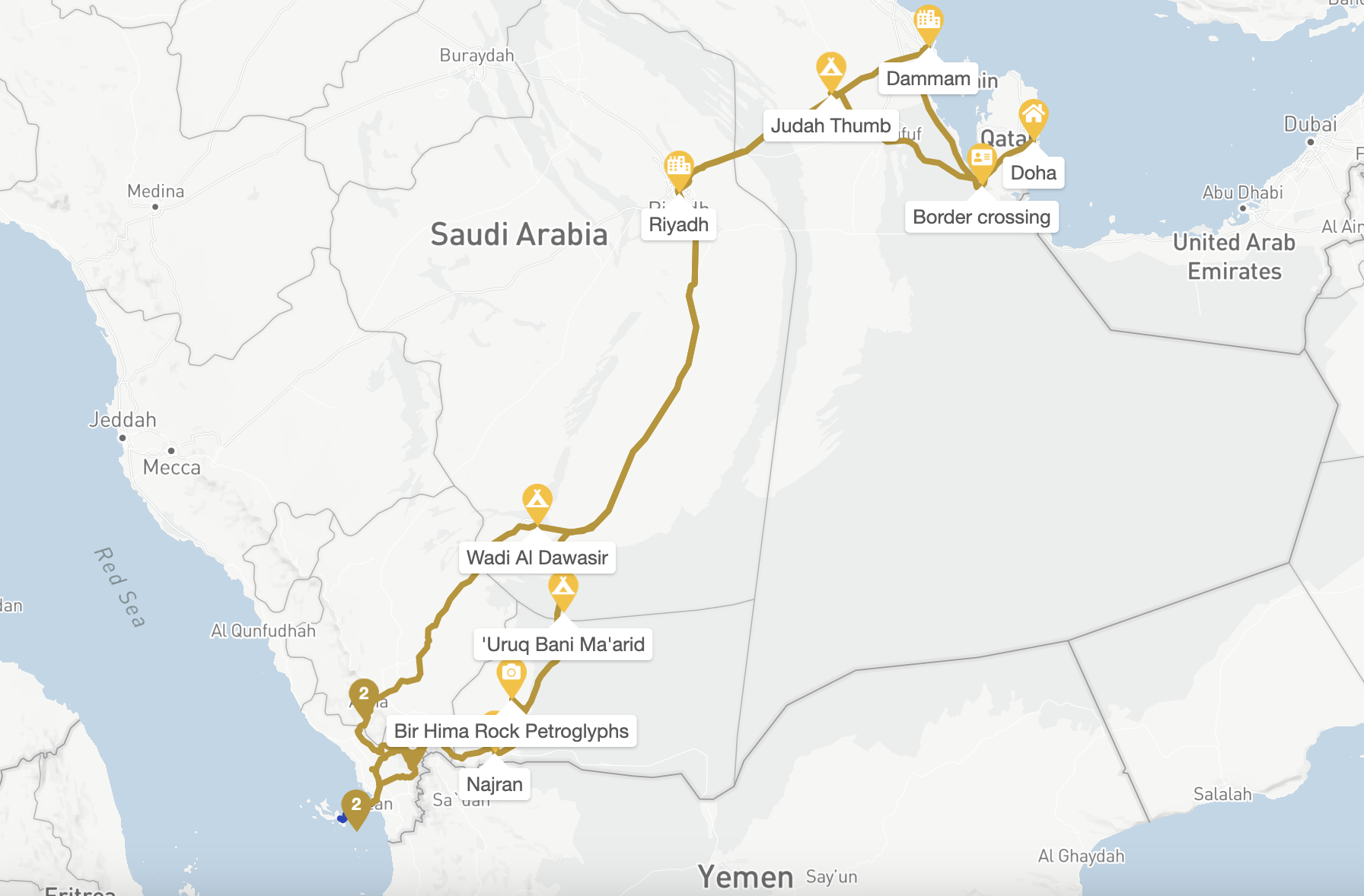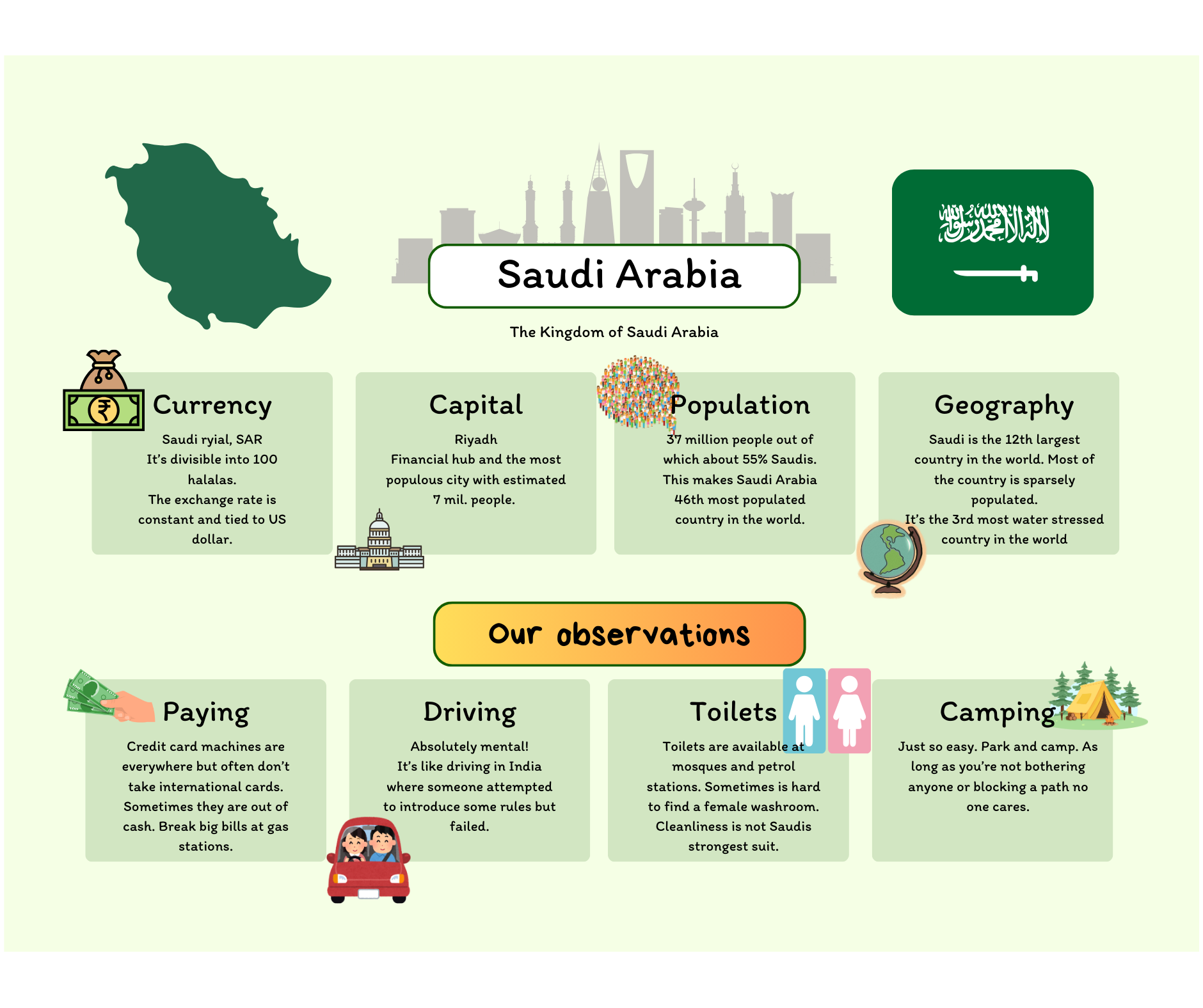 We made it to the Qatari border in one and a half hours with a quick stop at a petrol station. The crossing was easy, with a quick stop on the Qatari side (we pre-registered to exit online) and a wee bit more work on the Saudi side. Since it was our first time in Saudi Arabia, we had to go to the main terminal and get registered (basically walk the customs there and back). We, of course, didn’t do that and went straight to the border (in our defense they don’t mention it anywhere to go to the terminal) and were told there that we had to go to the “building “. But we didn’t understand that he wanted us to turn around so we just parked by the terminal in between the two border gates (entry and customs) and walked in through the exit. We surprised a lot of people there but they were very nice, let us through, stamped our passports and car documents, and we could just continue without leaving the border area. After, we just got our car inspected, which took about a second, and then had to buy car insurance. That was pricey. We paid 230 SAR for 14 days.