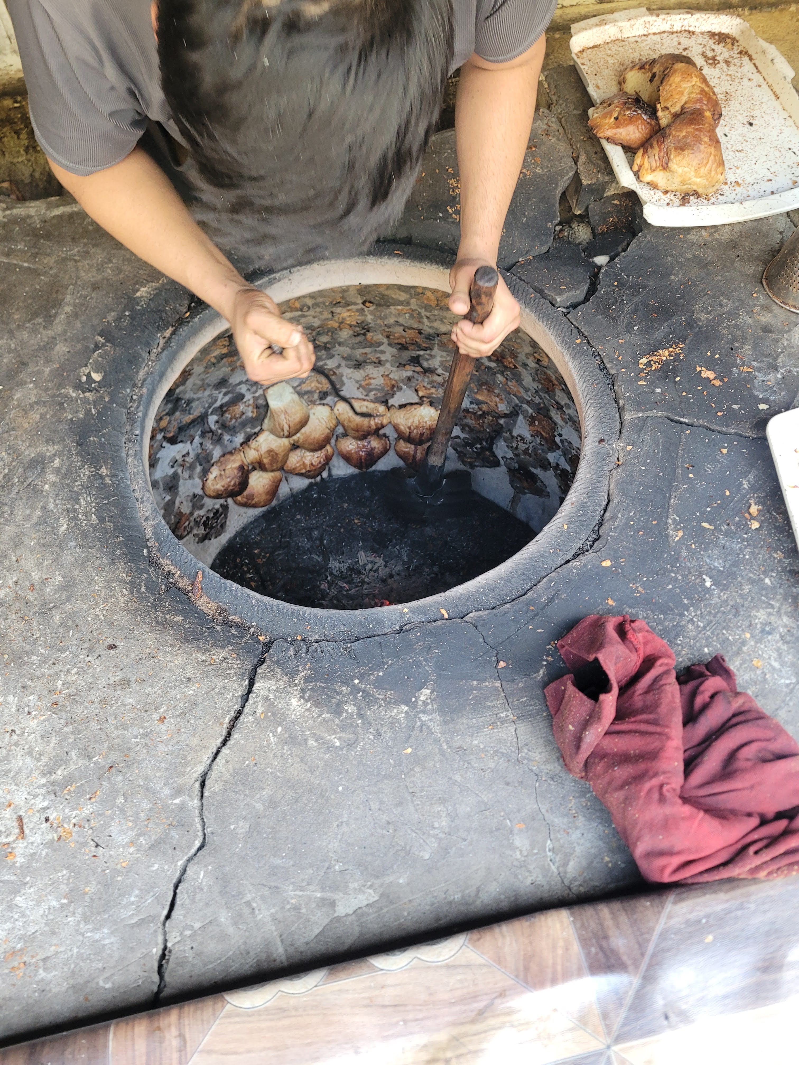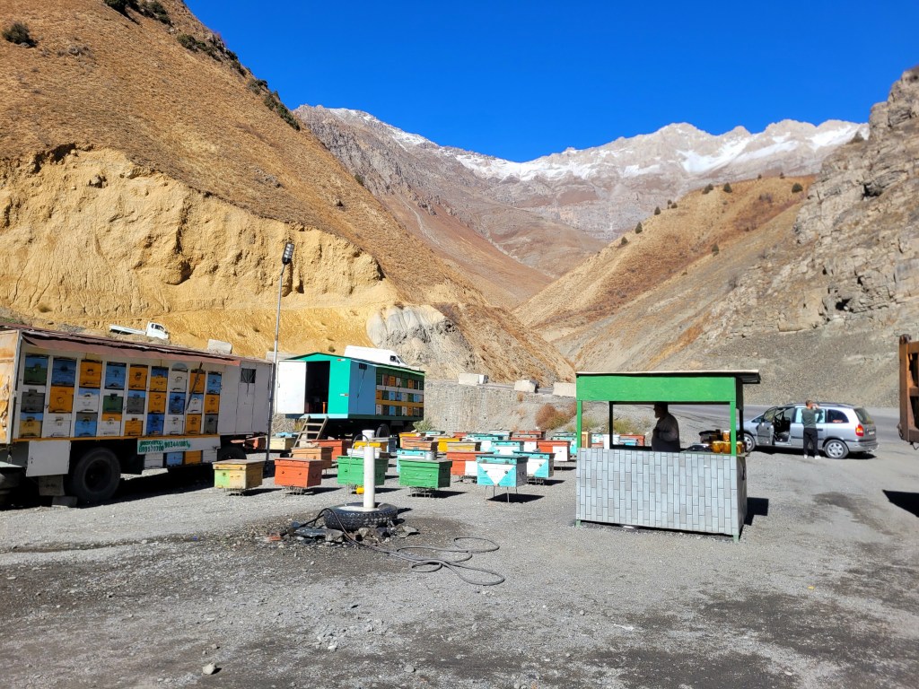 The drive to Panjakent isn’t too long distance-wise, but it goes through the mountains and takes time. We reached Panjakent after about 4 hours, with one quick stop towards the end of the mountain range, where there was a sudden rest stop in the middle of the road with no village around. There were several shops, and we bought nuts and local honey for hiking. They also made an amazing Samsa there, so we got two straight from the oven. I forgot to mention that we were delivering pigeons to Panjakent for some reason, and at one point, one of them got away from the box and started flying around the car. Otherwise, the drive was pretty uneventful, except for some (for this part of the world) usual overtaking maneuvers that scared the hell out of me.