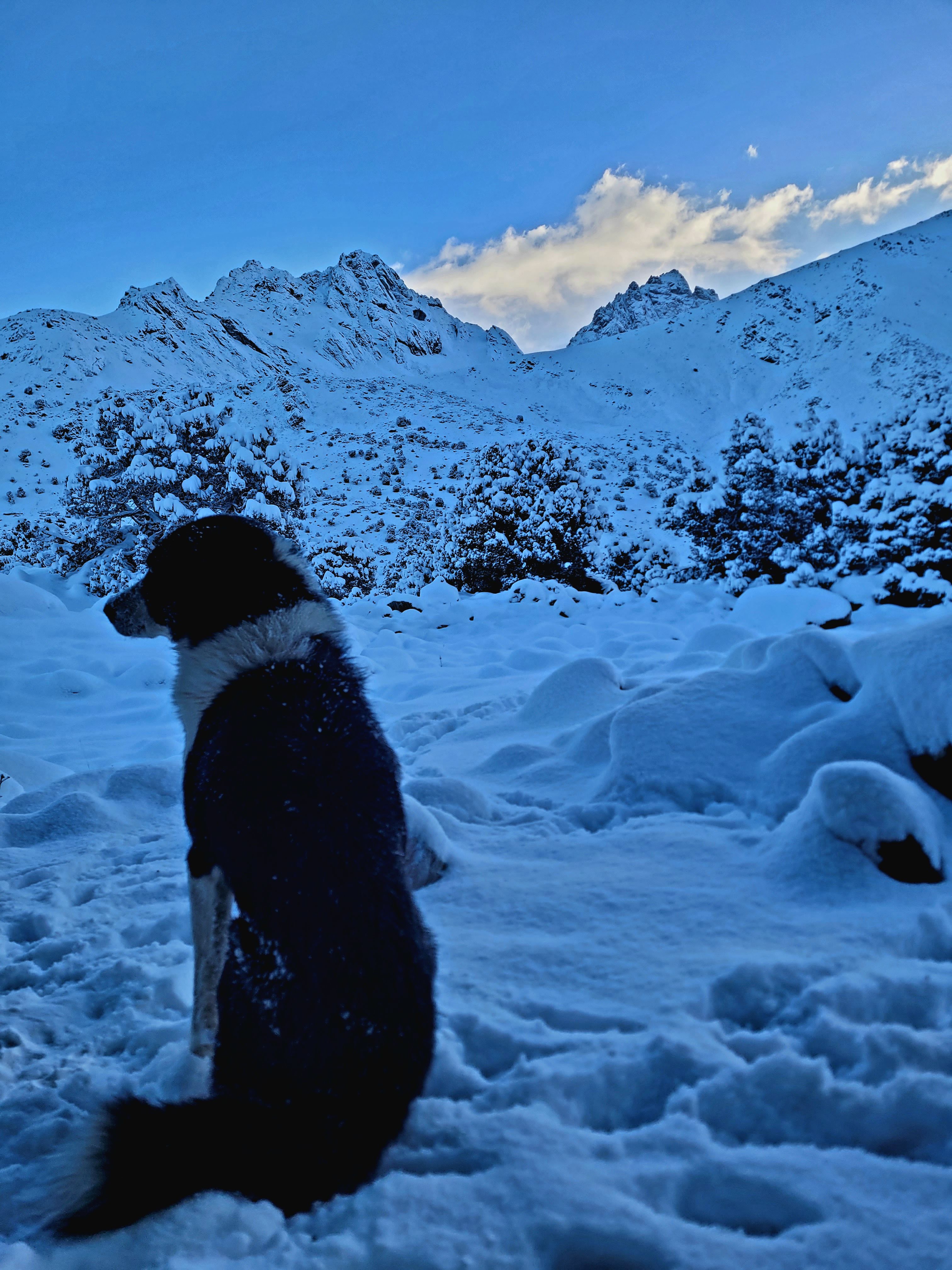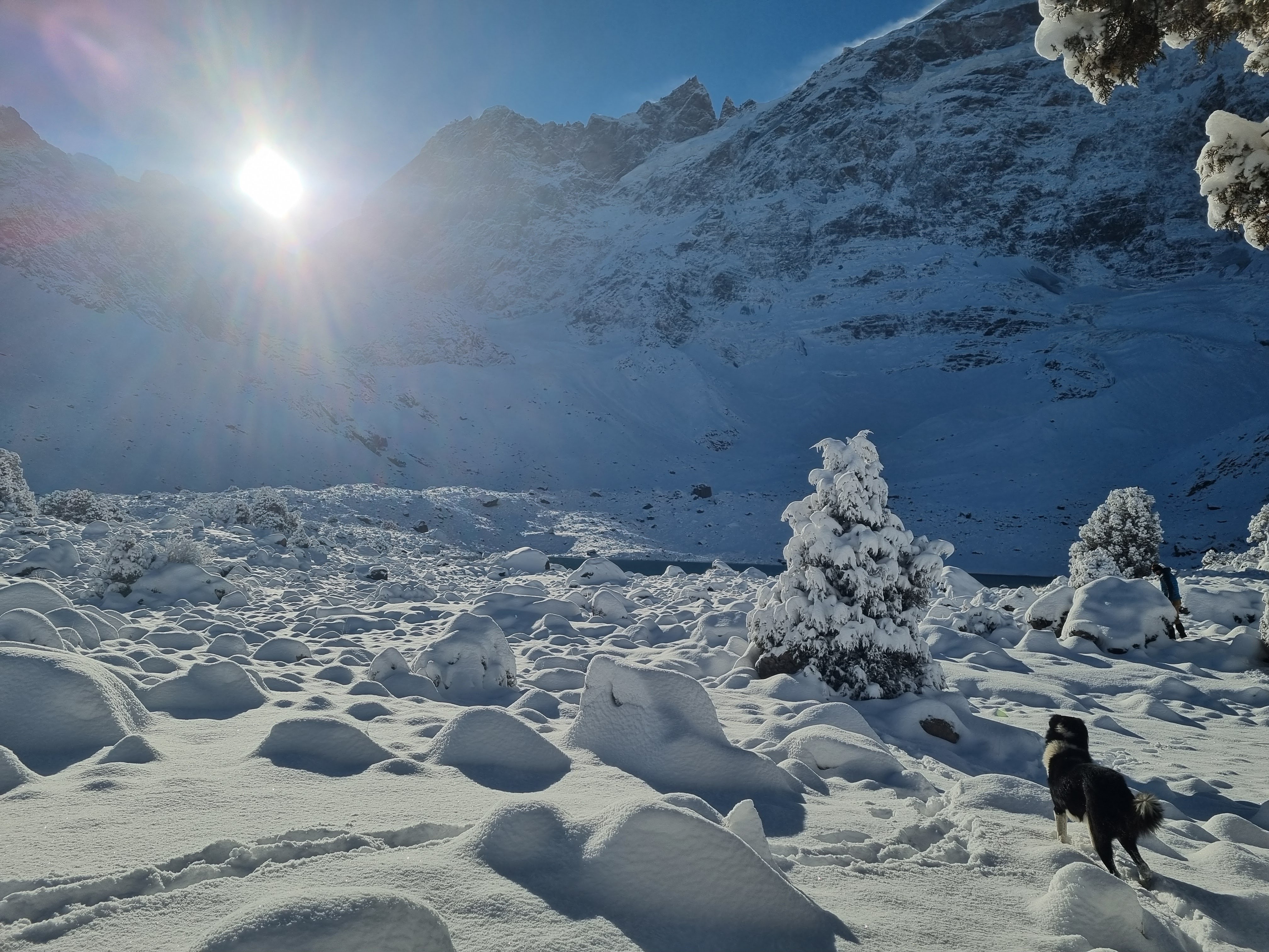 We had a quick breakfast and a cup of coffee, and packed the frozen tent away. We hadn’t realized up to that point how nice the camping spot was. It provided both sidewind and snow shelter. I started to trudge the way back to the lakes below us by trying to follow the path we took yesterday, but I had no clue where it was. The only thing we knew was that there was a river on our right side with a fall towards it that we didn’t want to go anywhere near. Taj helped with the path even though he went on a wee tangent from time to time.