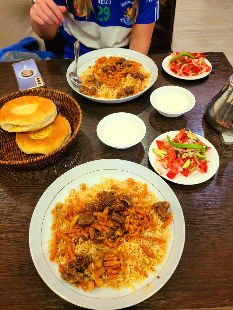 Our first stop was mandatory Plov. We were craving it since the second day and couldn’t get it anywhere. We picked a place at the end of our street called Nur Kurutobkhona. Yes, the place specialized in Kurutob, the Tajik national dish, but their Plov was amazing. We got one full portion, which was more than enough for two people.