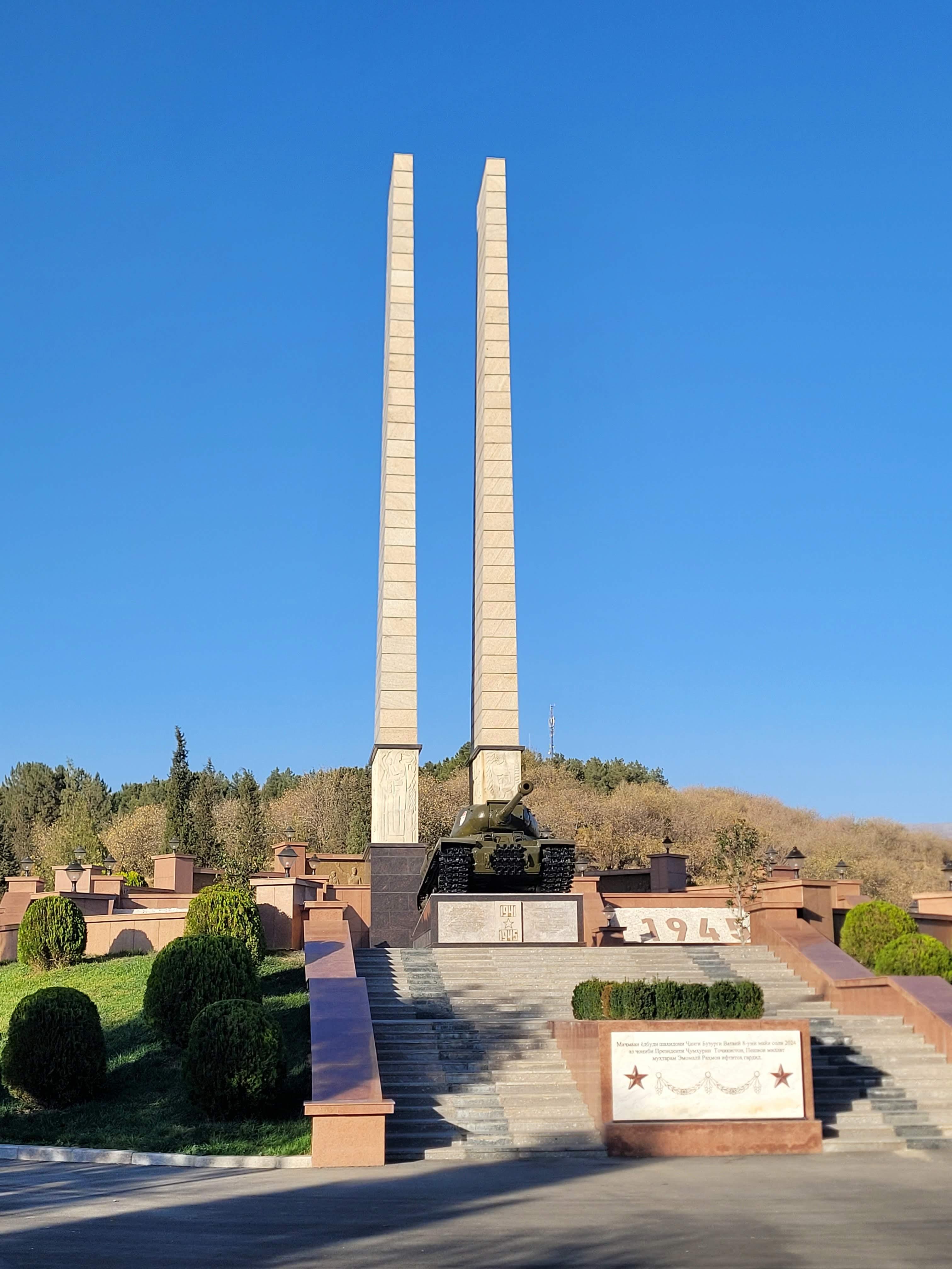 Then we continued up the hill through the narrow streets of the neighbourhood to the Victory Park. Once we entered the park, we appeared right in front of the tank and stone obelisks commemorating the World War 2 victory. We walked around and continued to another memorial hidden behind it. This, we found out, was the actual WW2 memorial dedicated to the Tajik soldiers who died during the war, as well as to those who returned with medals of honor. Around 60 Tajik soldiers were awarded the title of Hero of the Soviet Union, and their pictures were displayed along the stairs of the memorial.