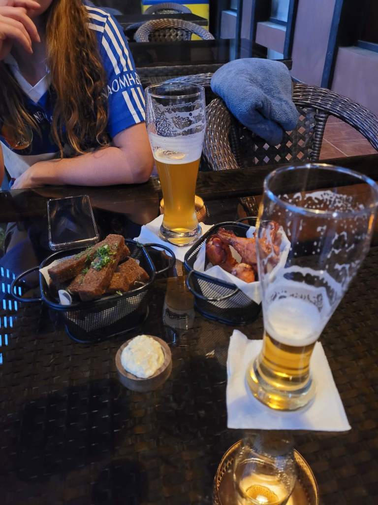 We did a small loop around the park and stopped to do a few pull-ups at workout stations along the path for good measure. The main road from the park took us to a part of the city that we had marked on a map that had a few bars. We wanted to stop at Dushanbe Brewery, but when we saw the people around and in it, we changed our minds. It was basically just a window with a tap and bottles, and a bunch of people off their tits. We ended up in Bavaria House, which was right next to it. It looked really fancy, but the beer was 14-16 somoni (~$1.5$). We were not sure, but the way the woman asked, we assumed we had to order some food with beer (and we always find an excuse to get food), so we also got chicken wings and garlic bread.