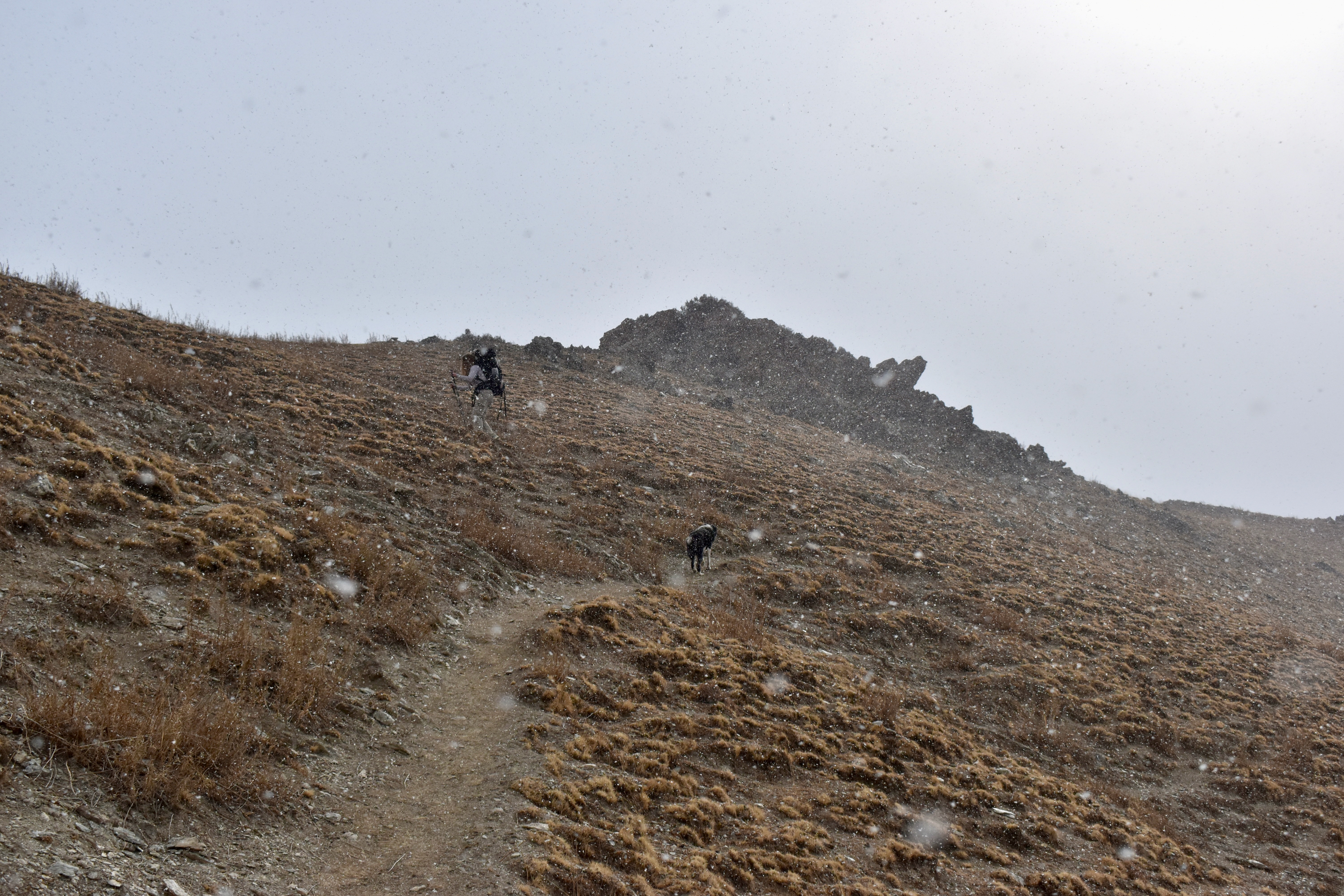 After breakfast and coffee, we started straight away with the hardest bit of the day’s journey, the crossing of the Chuqurak Pass at 3175 meters. The path was easy enough to follow (except at the end). We were able to climb the 750 meters of elevation in one hour and 50 minutes. By the end of the climb, the wind picked up, and it started snowing. However, it was gone in no time, and the wind actually cleared the valley, so we got a better view of the lakes below us. We then descended about 300 meters to the Kuli Kalom Lake, and because the sun came out, we decided to have a short stop and get a coffee.