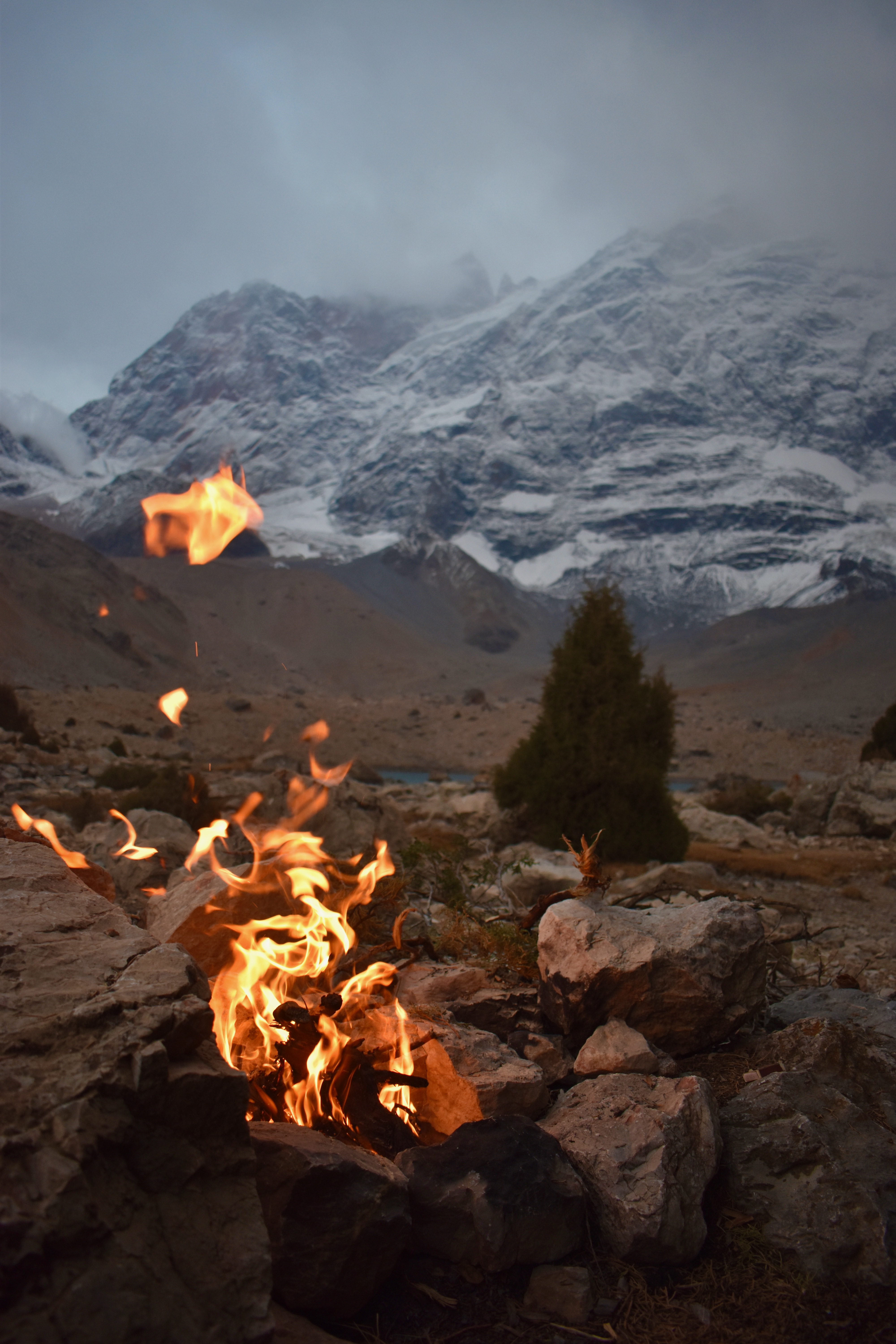 The area around the lake was very rocky, but we found a nice spot under the trees and set up a camp there. The water here was way clearer, but we never carry the cleaning syringe with us, so filtering water was still a pain. What was, however, worse than yesterday was finding any firewood. It took a long time, and in the end, we had to be happy for even a smaller fire than yesterday, but it gave us something to do, and it wouldn’t be camping without at least a wee fire. We had a similar dinner to the other night, but this time we gave Taj even some sausage for sticking with us for the whole day.