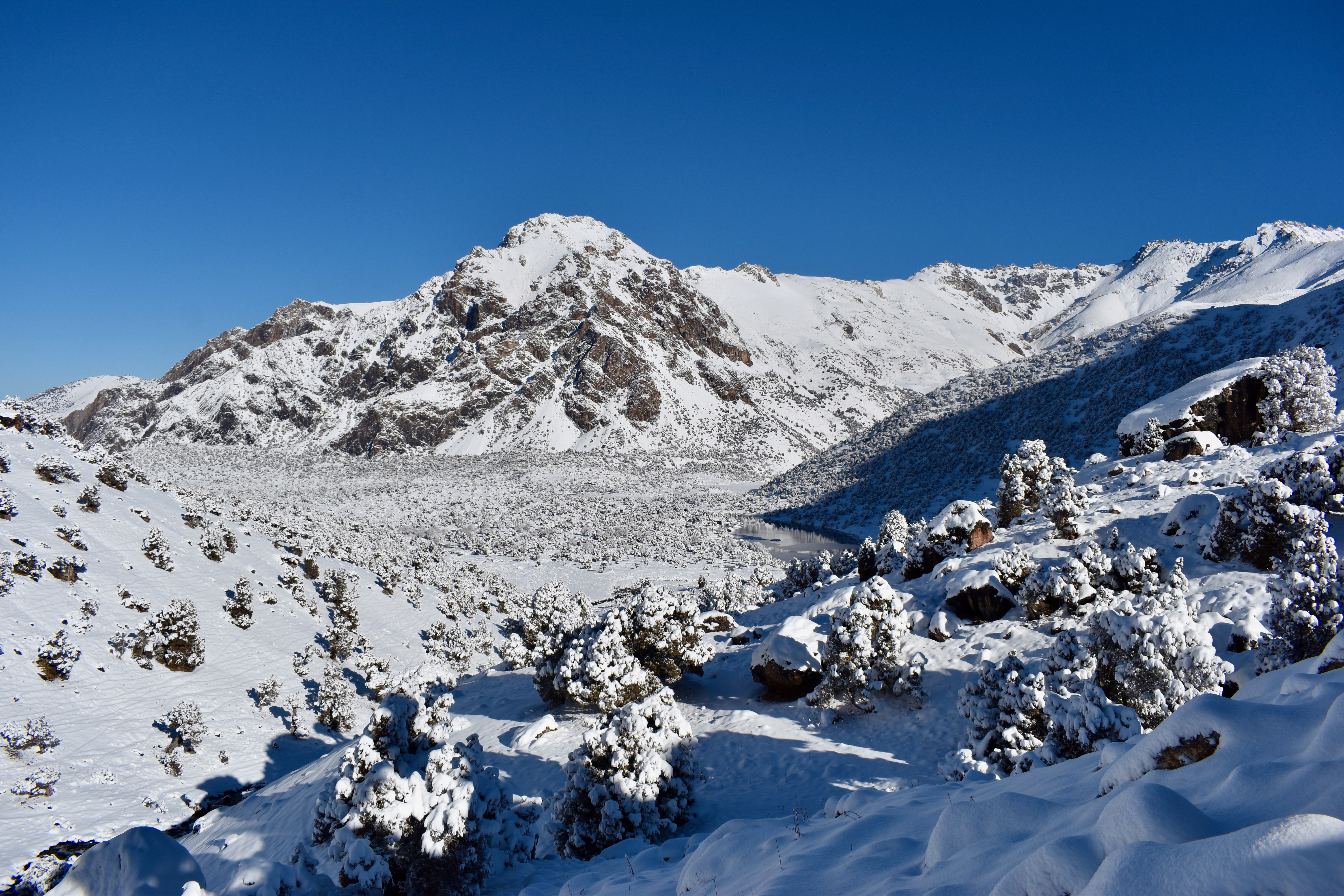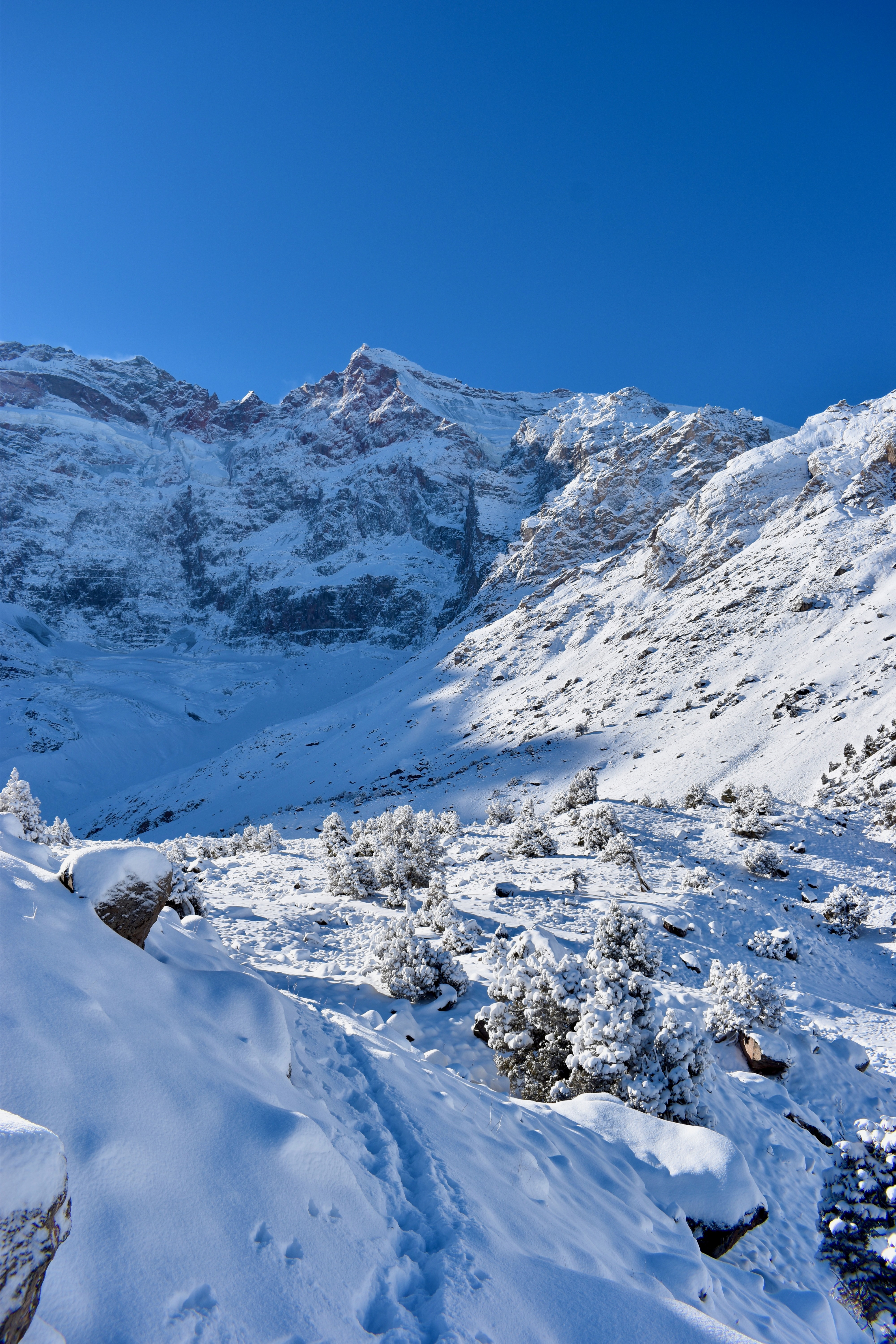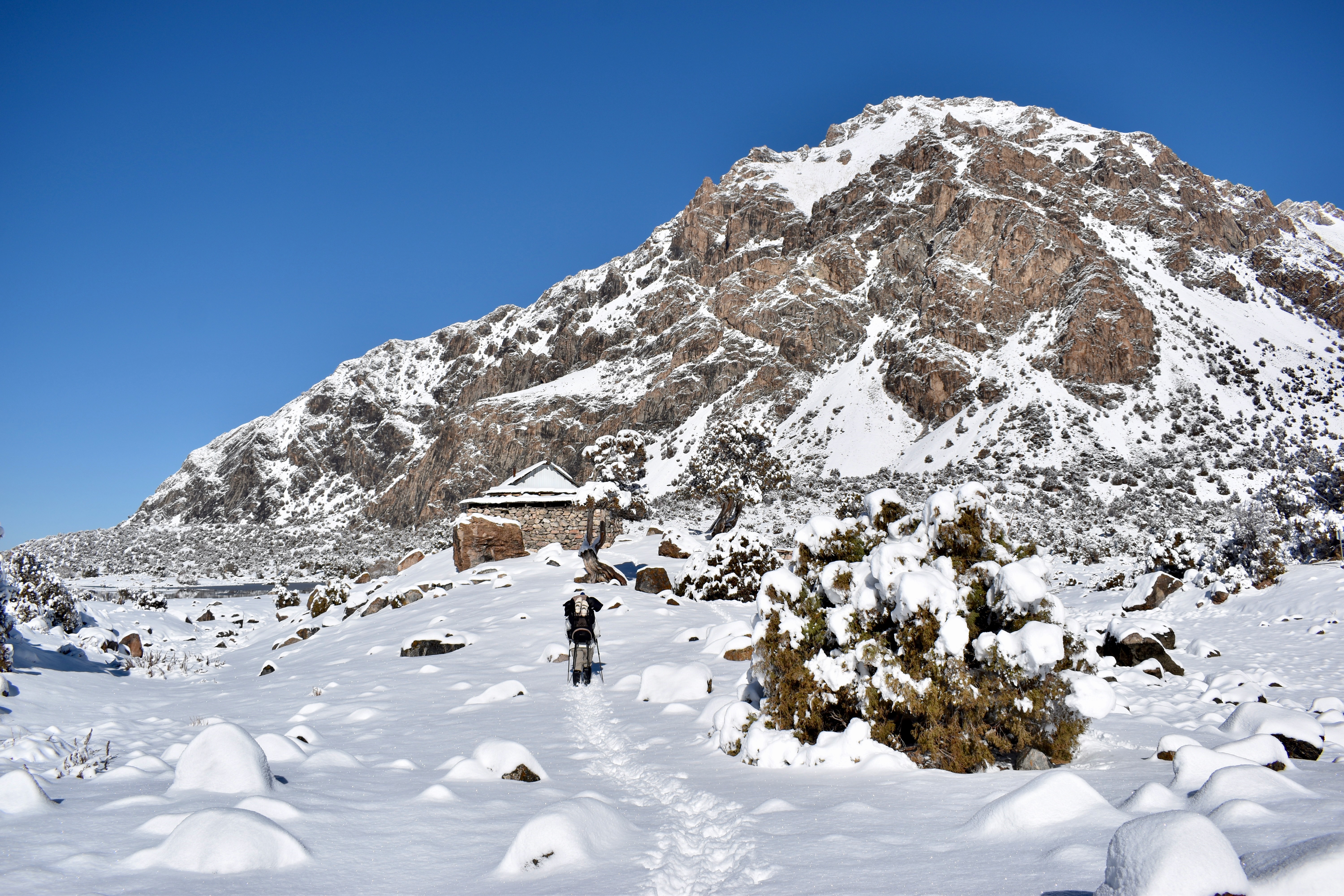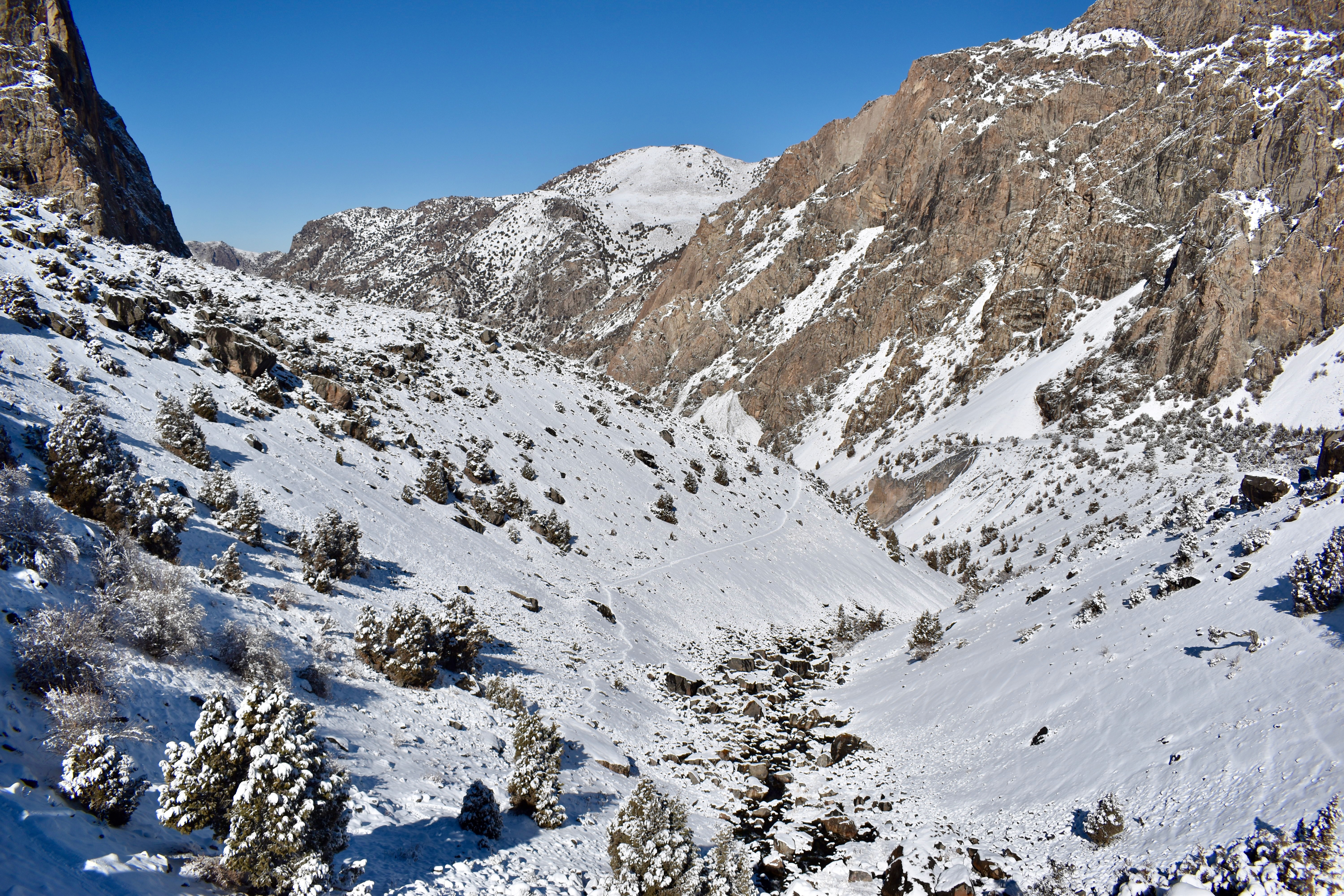It took us about an hour and ten minutes to reach the hut at Lake Kuli Siyoh. The sun was behind our backs, and we had to make a stop to take some clothes off. It took another hour to cross the valley. We didn’t go back through the pass, but instead we took the more direct route by the Artuch river. We haven’t seen any other people, except the guy at the Base Camp, but once we reached the start of the river and the start of the descent, we found fresh tracks in the snow. Based on the trail, whoever came up made it to this point at the start of the valley and then turned around and went back down. We didn’t ponder much why, and instead, we were happy for a clearly visible trail in the snow for the steep part down.