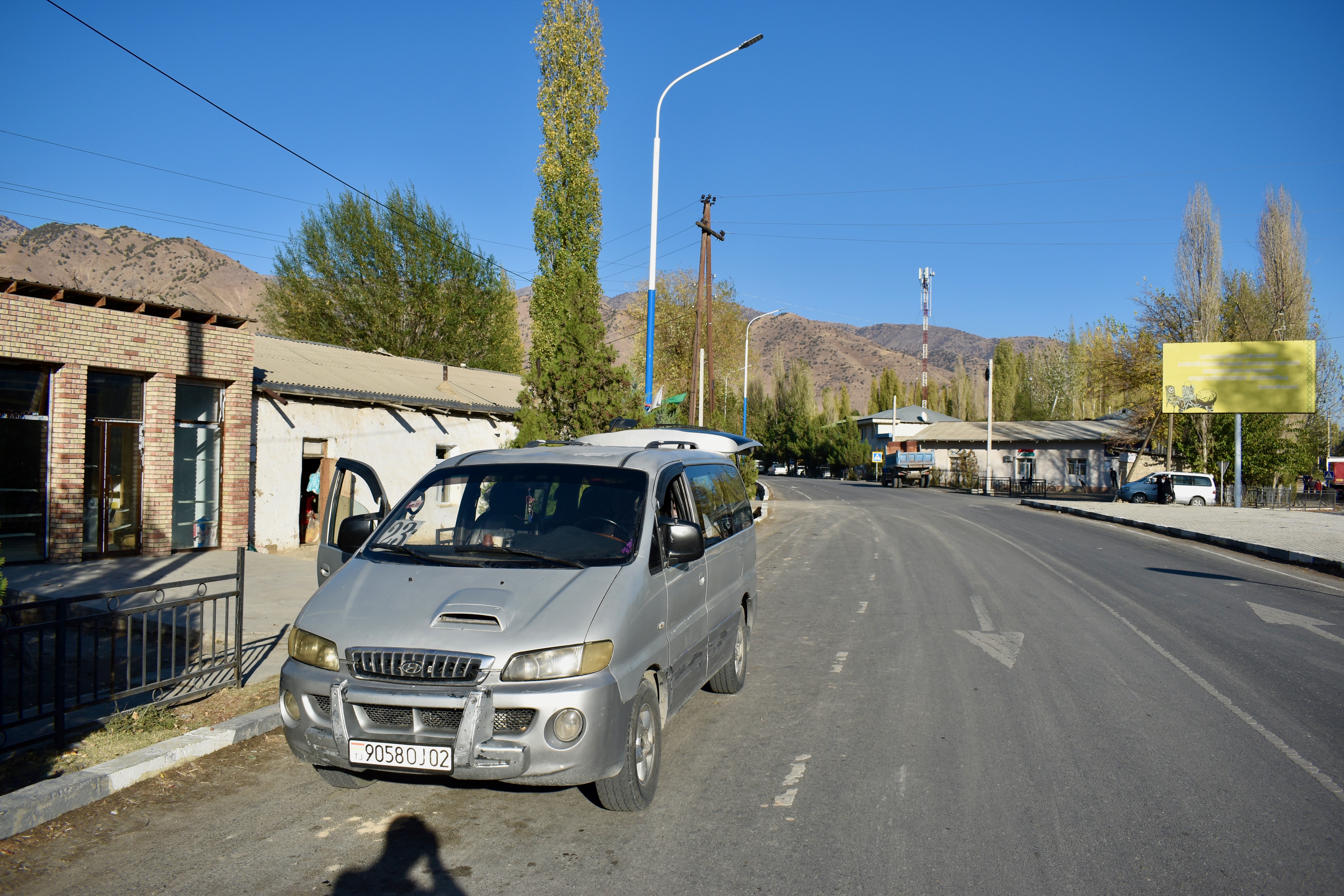 We didn’t rush in the morning, especially since Hotel Zarafhson had probably one of the hardest beds we ever slept on, and we felt like we hadn’t slept much! We were also told that the marshrutka wouldn’t be leaving until at least 9 am. We headed to the parking spot of the marshrutkas for Artuch right after breakfast (39.4978611N, 67.6140422E). There was no one around, but there was a car with a sign for Artuch. We waited for about half an hour when a fella showed up in a different car and told us that he also goes to Artuch. He even got someone on the phone who spoke English, and he told us that he wouldn’t be leaving until 1:30 pm, but that he is the earliest one to go.