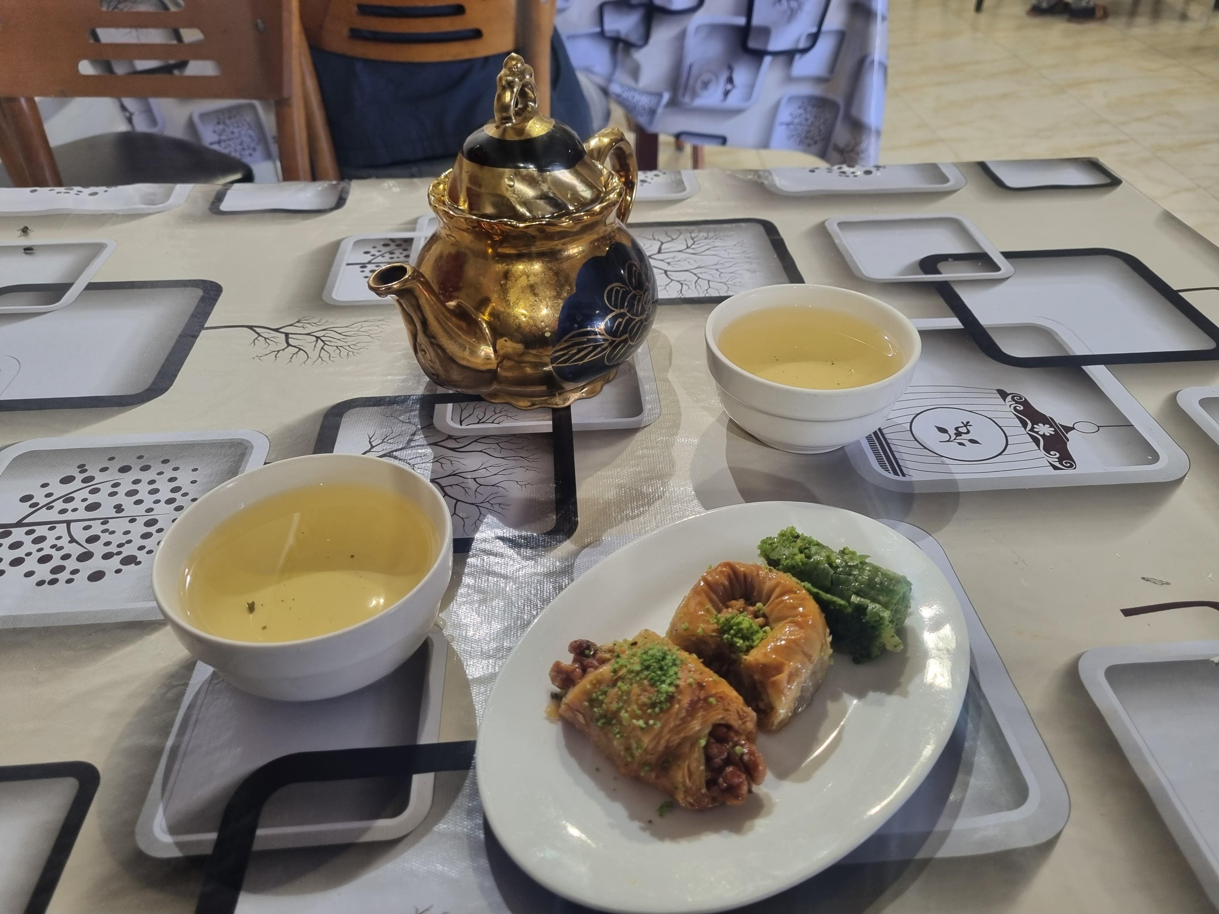 We had a stop at the same place as on the way to Panjakent to get Samsas and one more later at a charging station, where we got mint tea and baklava while waiting. We arrived at the parking lot in Chorbogh around 2 pm and got a taxi to the Almaz Hotel. We left our stuff in and went for a walk right away to get the most out of the day before the sunset.
