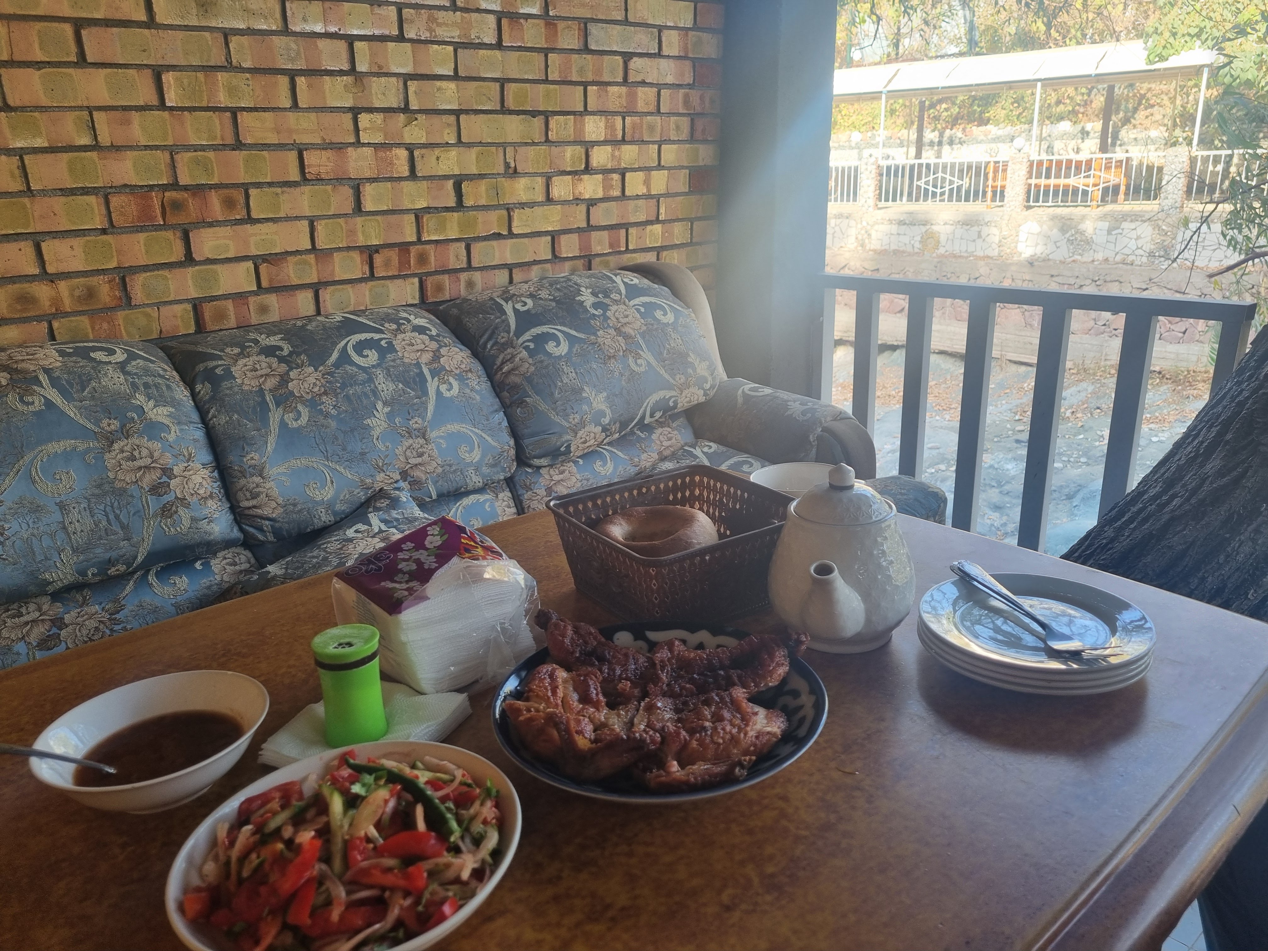 We still had a lot of time, so we started wandering around and aimed for a restaurant we discovered while we were researching the area the other day. We weren’t really hungry, but even our driver mentioned a “chicken shop” on the way to the Fort, so we had to give it a go. It was called Qaraev (Табакаи Қараев). It was situated by a river, but there wasn’t much water at this time of the year, so we saw more garbage than water. But it was still nice to just sit on a cozy sofa by the river. We got a pot of tea, and since we were there, we ordered a portion of chicken. We asked if they had Plov, but as we understood, they only served one thing – chicken. And hell, what a chinsken that was! Clare even had to edit her list of the best chickens she ever had. I can’t remember, but I think we paid around 110 somoni for the chicken, salad, bread, and a pot of tea.